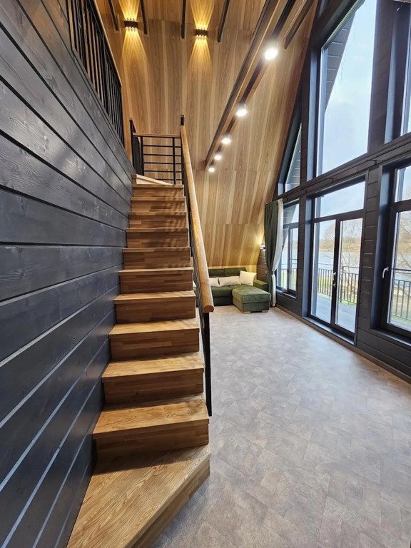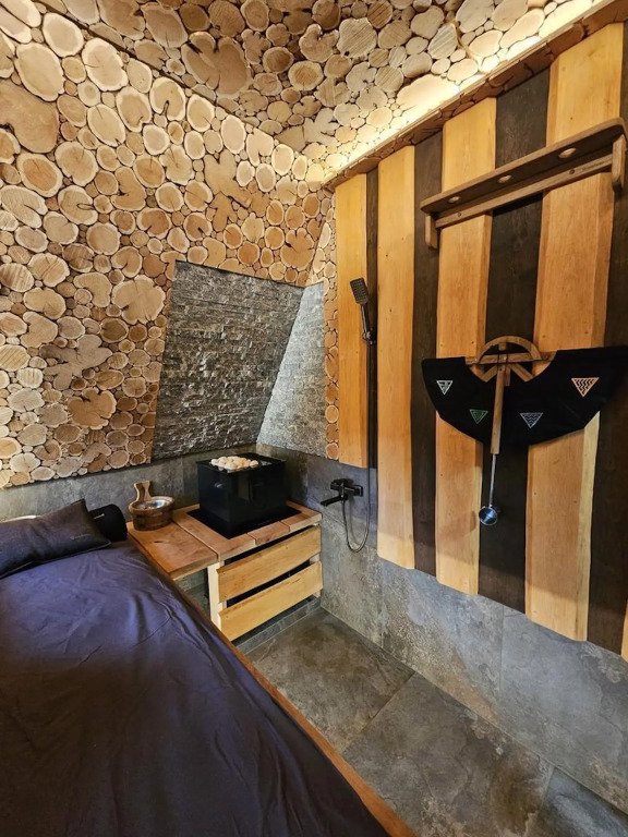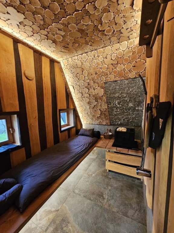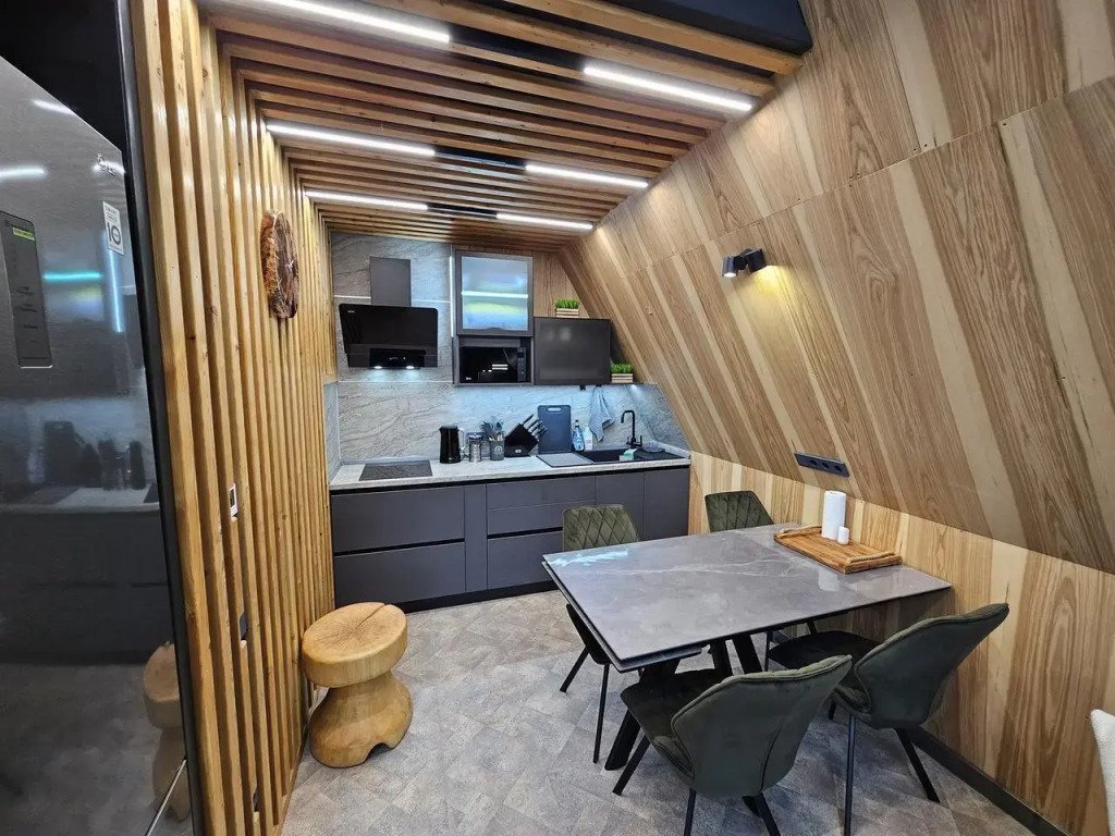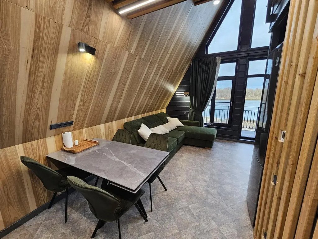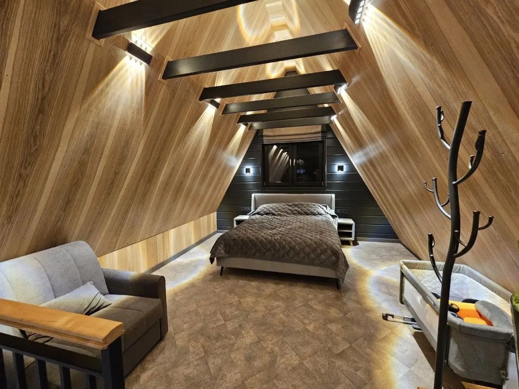 В жилом доме: дизайнерский ремонт, система кондиционирования, тёплые полы, прихожая, кухня-гостиная с диваном (два спальных места 160х200), камин, ТВ, антресольная спальня с полноценной кроватью (два спальных места 160х200). Максимальное размещение: 4 гостя, не считая маленьких детей.