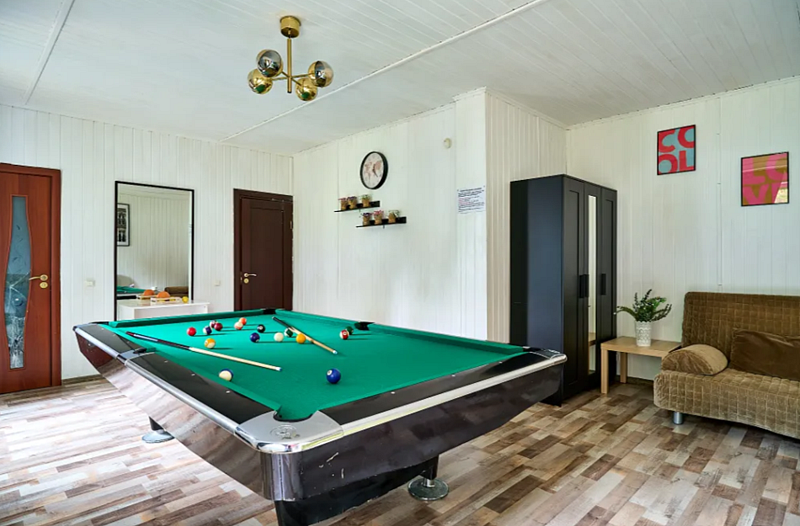 -Большая бильярдная комната с двумя раскладными диванами и отдельной туалетной комнатой и душевой кабиной;
