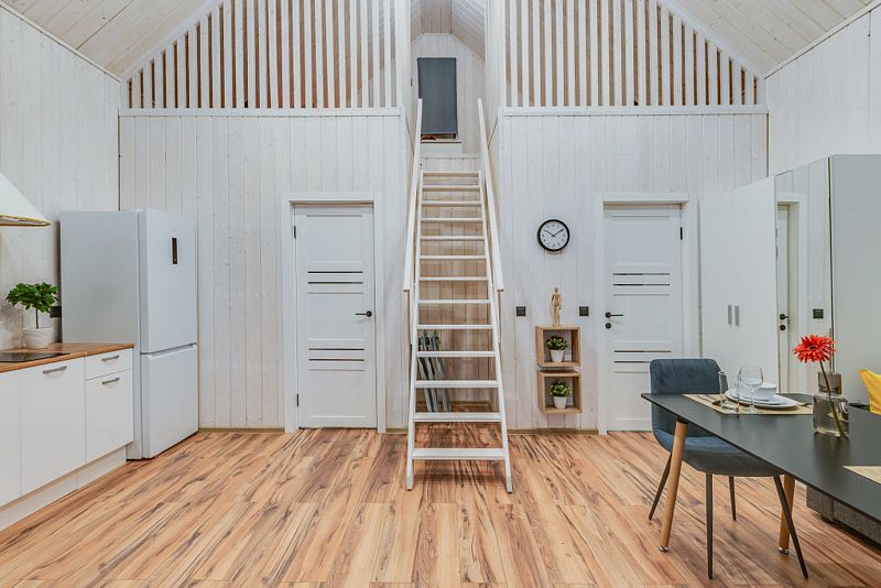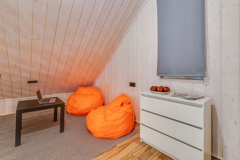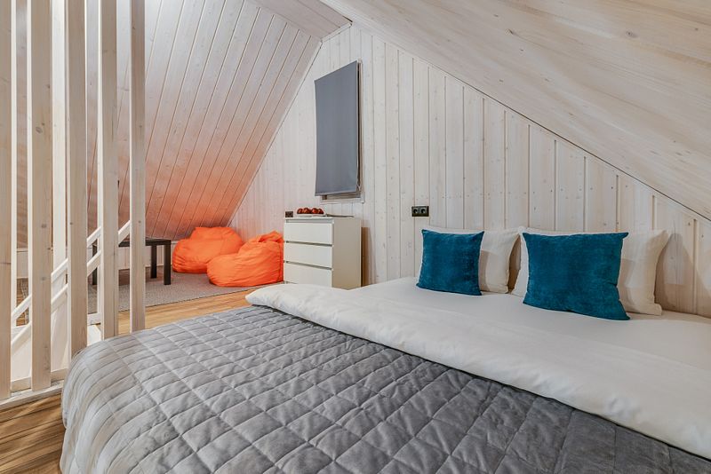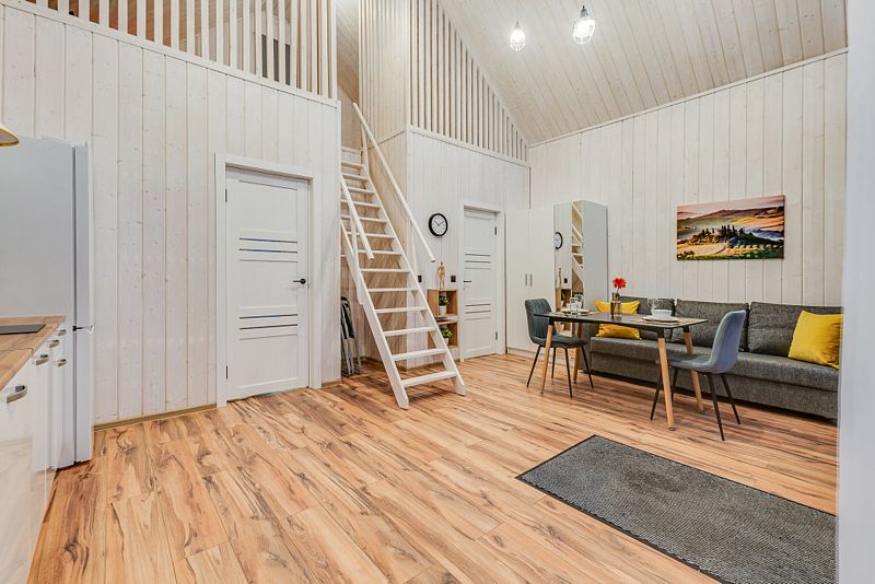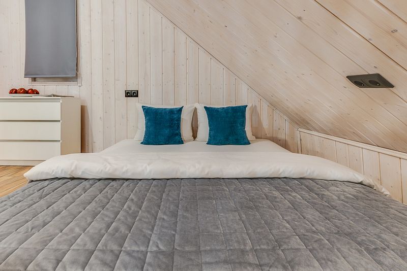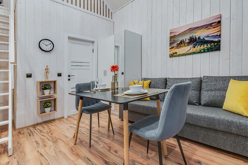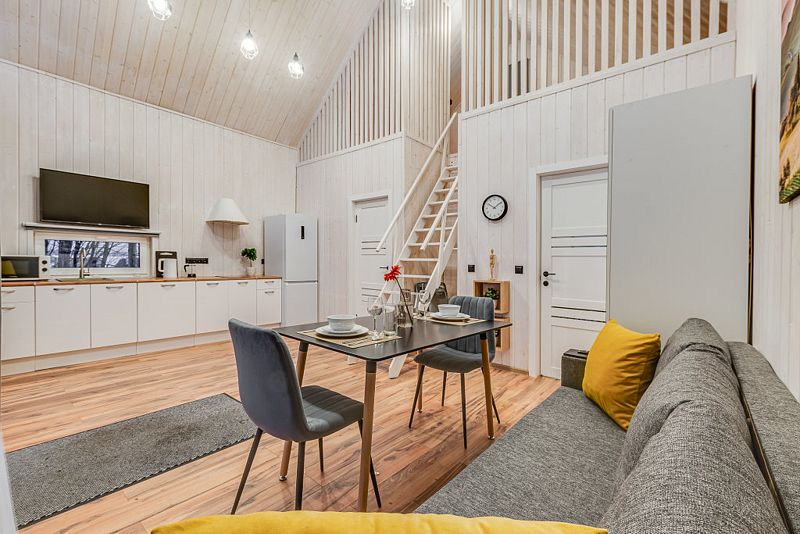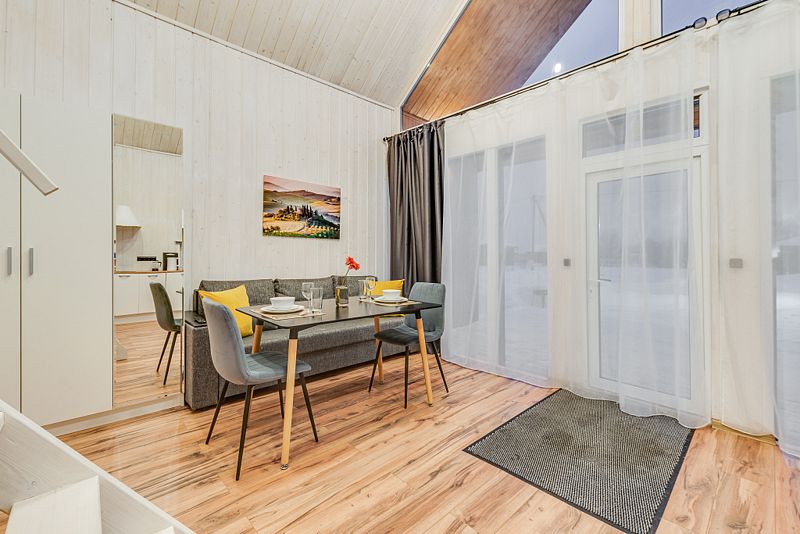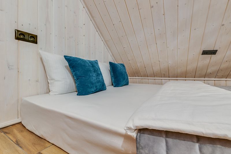 Дом для 6 человек с большой гостиной, спальней и комнатой на втором этаже. В спальне и комнате расположены двуспальные широкие кровати с качественными