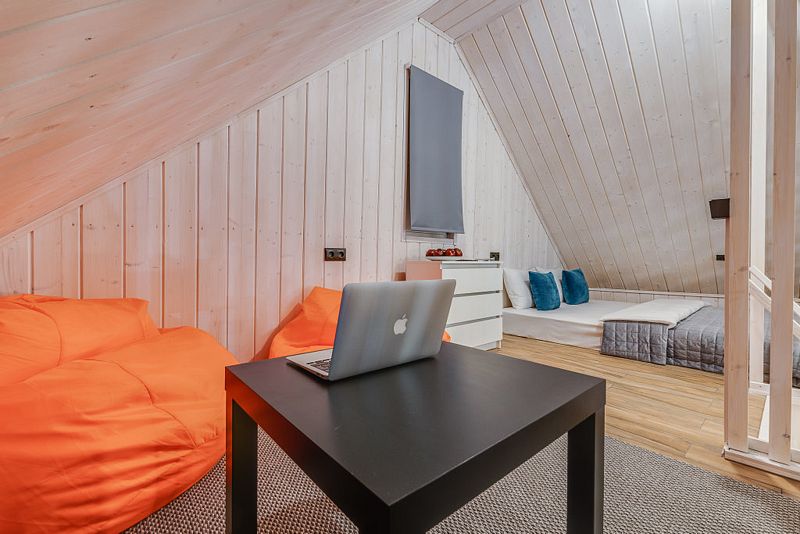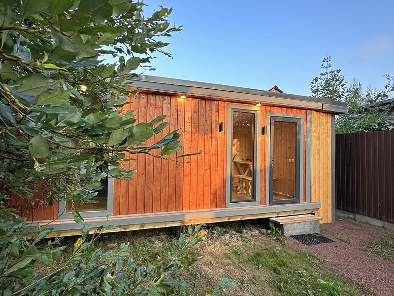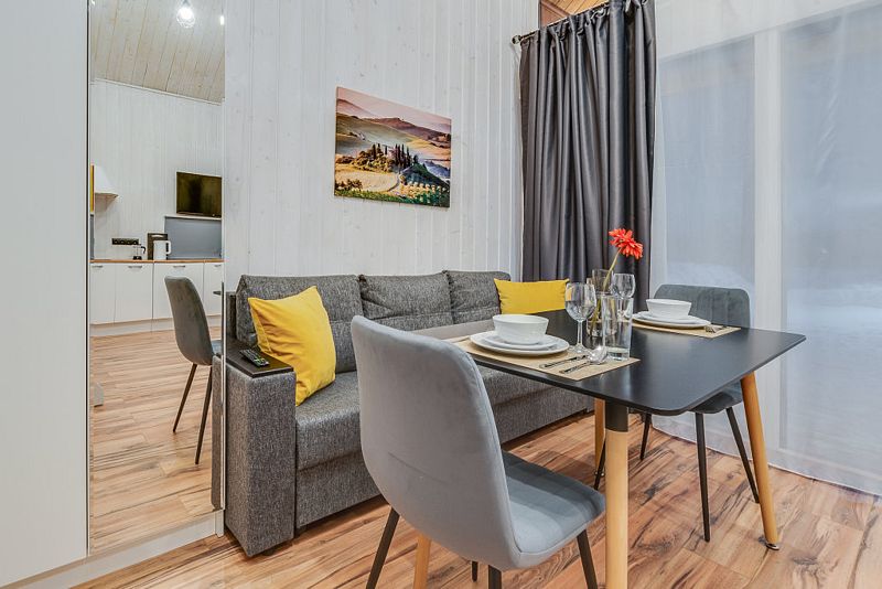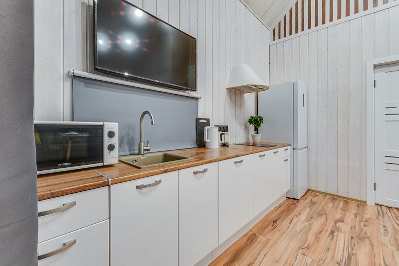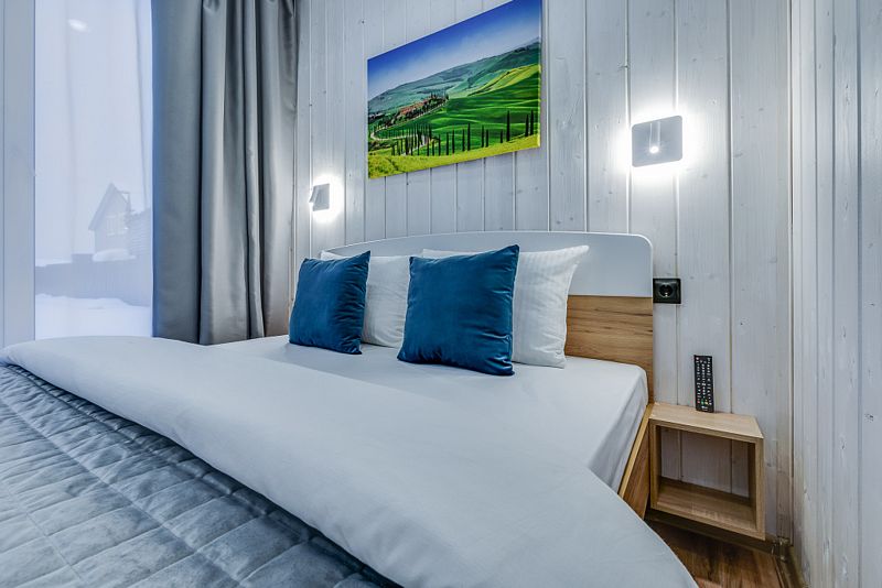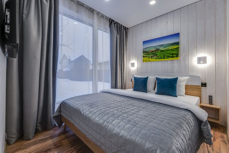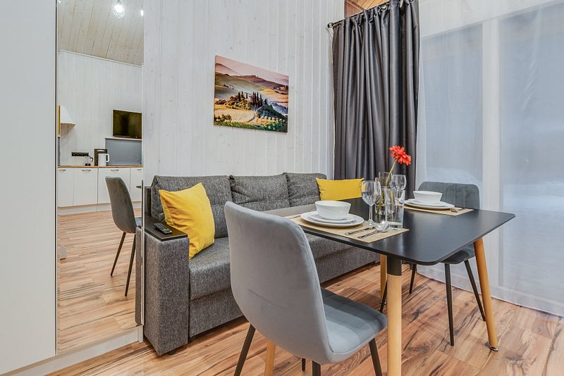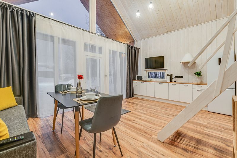Частный дом площадью 77 кв. м. с панорамным остеклением для 6 гостей имеет гостиную, спальню и ещё одну комнату на втором этаже. В спальне и комнате расположены двуспальные кровати с ортопедическими матрасами. В доме 2 телевизора: один в спальне, второй в гостиной. Во дворе большой мангал и баня на дровах.
