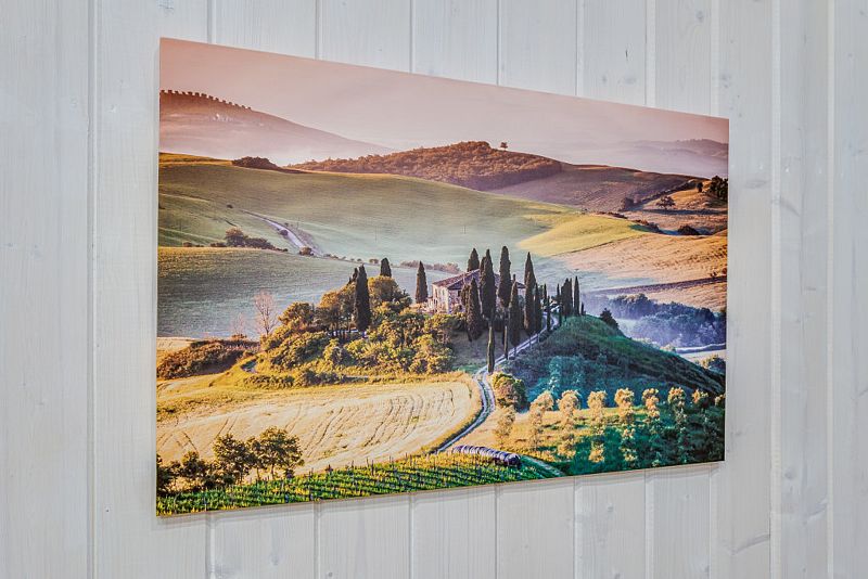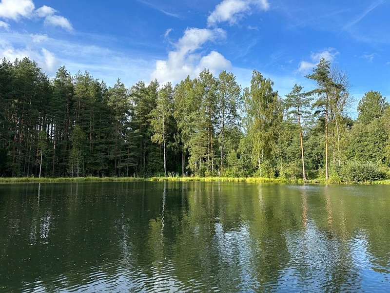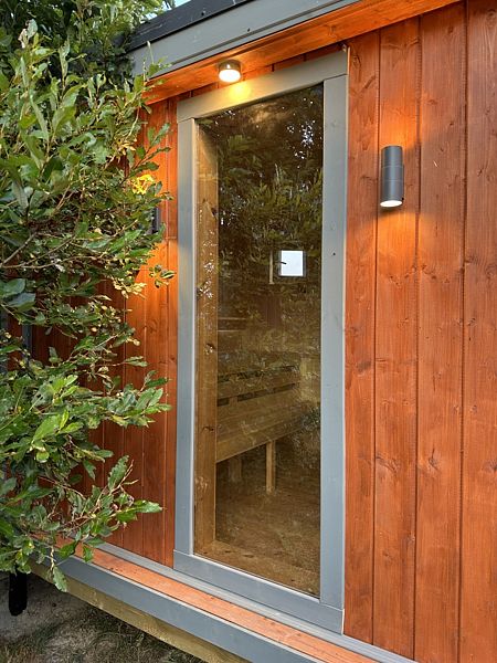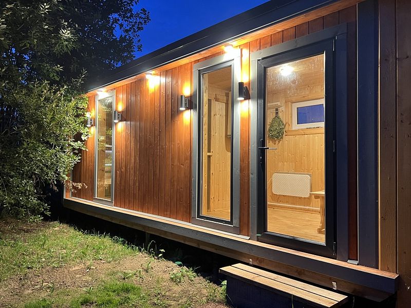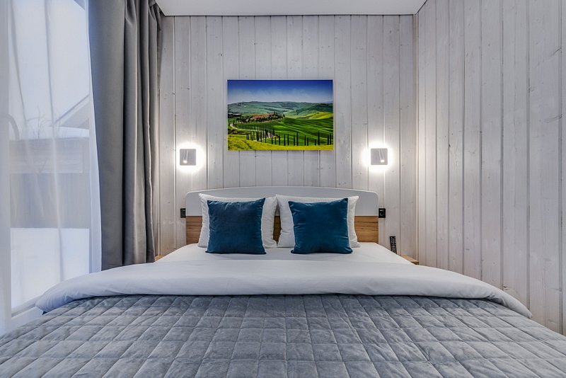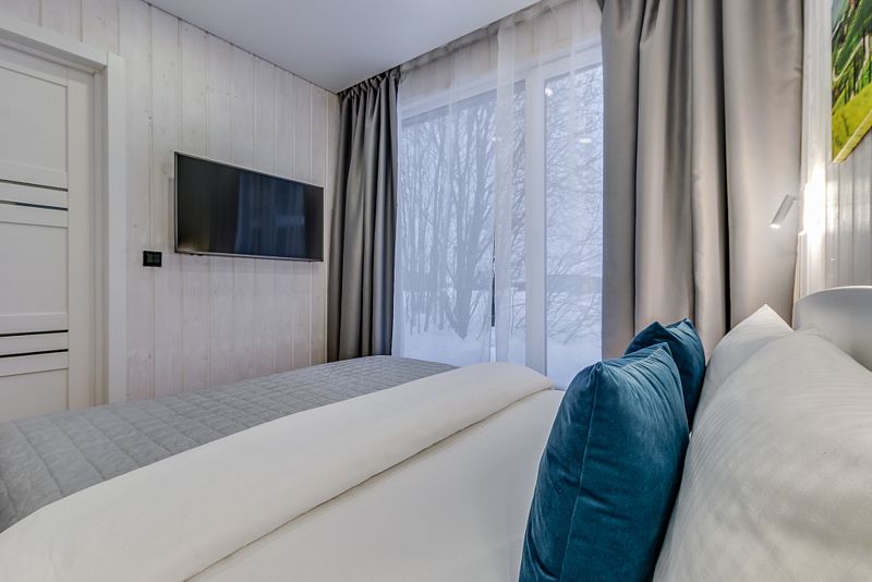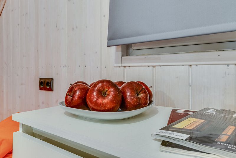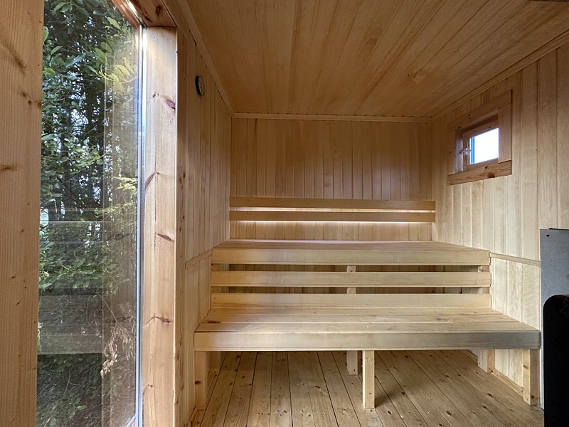 Частный дом площадью 77 кв. м. с панорамным остеклением для 6 гостей имеет гостиную, спальню и ещё одну комнату на втором этаже. В спальне и комнате расположены двуспальные кровати с ортопедическими матрасами. В доме 2 телевизора: один в спальне, второй в гостиной. Во дворе большой мангал и баня на дровах.