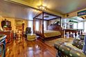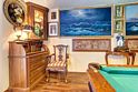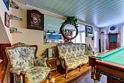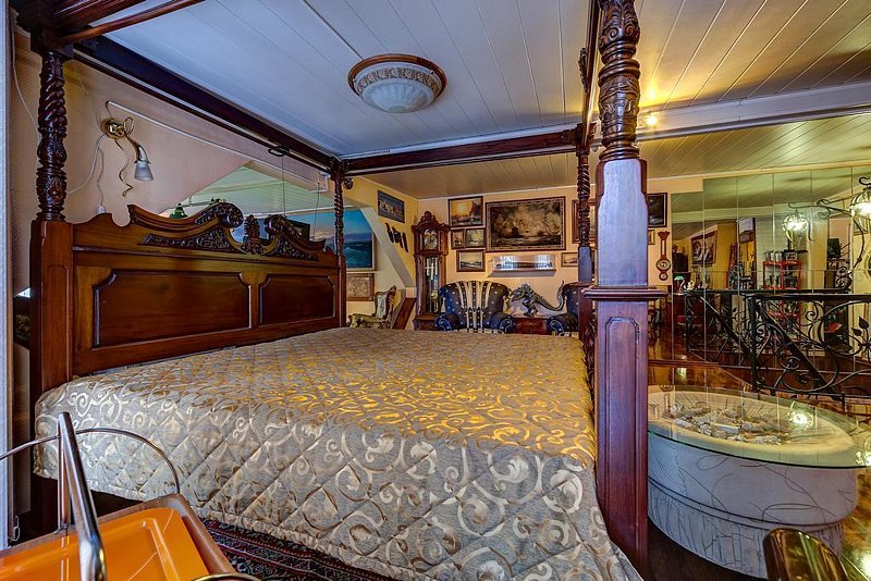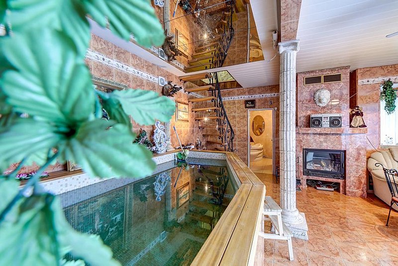 Двухэтажное здание с панорамными окнами и балконами. Комфортен для пары, семьи или близкой компании до 5 человек. Есть дровяная баня-сауна (растапливается под заказ без ограничения по времени), камин-кассетник на дровах, профессиональный бильярд, мини-бассейн, массажное кресло (нефрит, турмалин), дартс, мангал, барбекю гриль. Раскладывающийся угловой диван, 2 стола, 5 кресел, диванчик, письменный стол, канапе, королевская огромная кровать с колоннами (200х200), односпальная кровать.