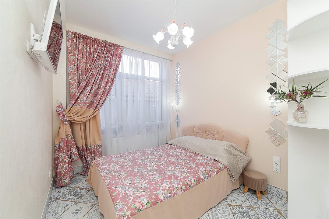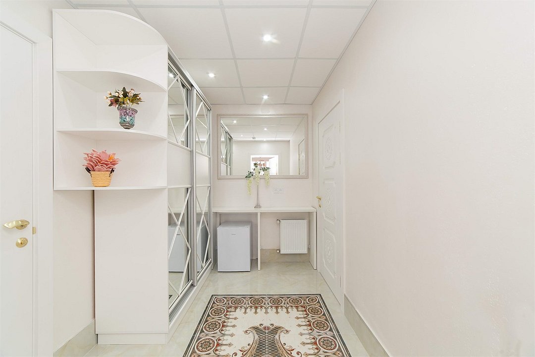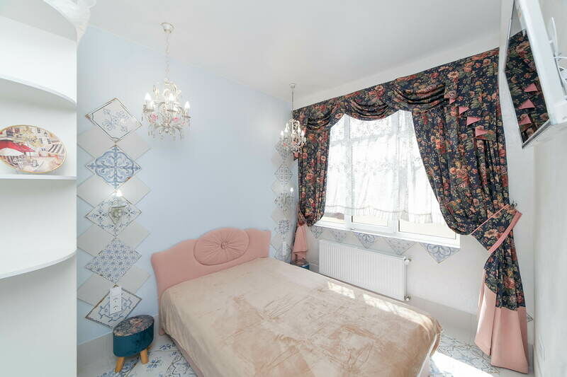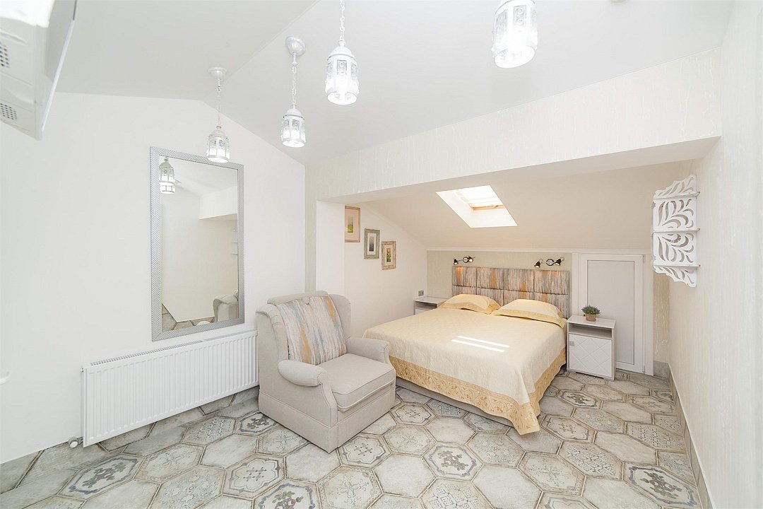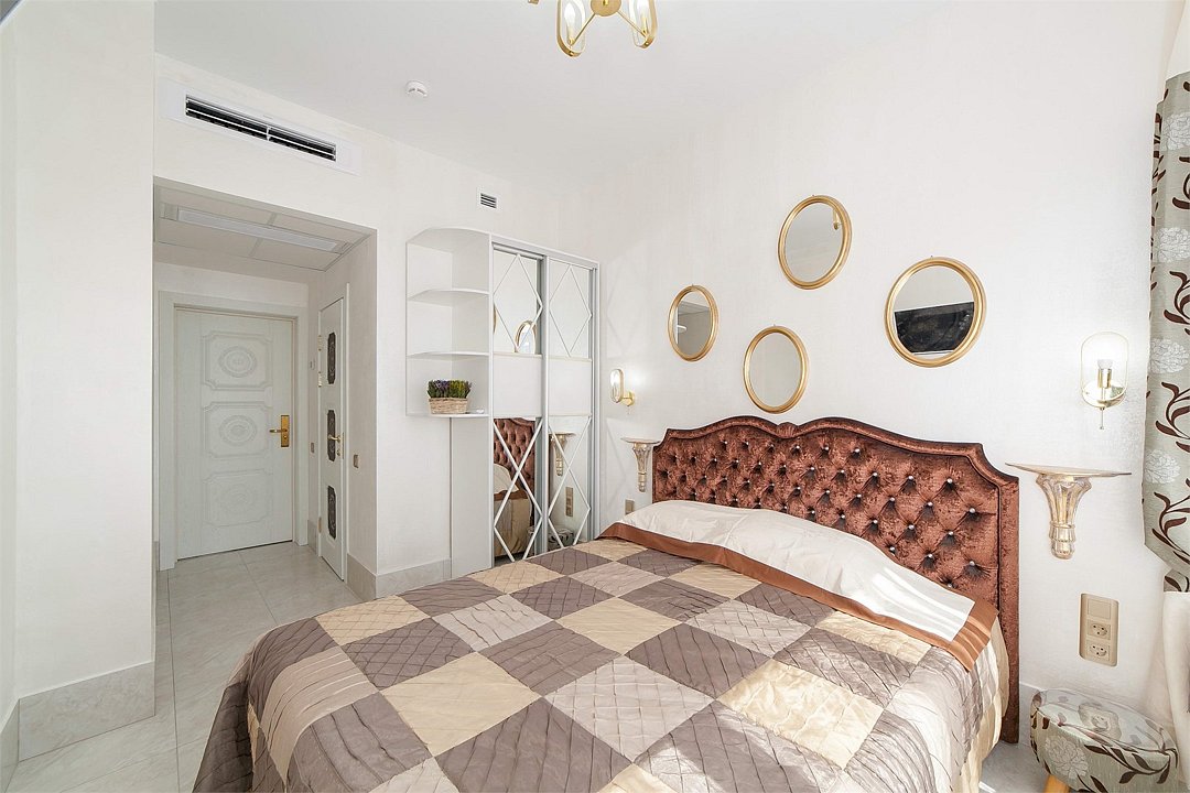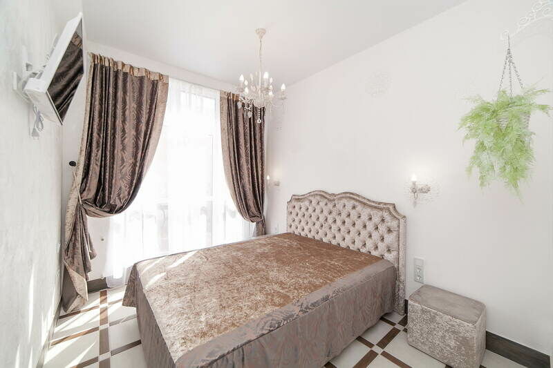 два телевизора, Wi-Fi, холодильник, система климат-контроля, светильник, фен, теплый пол, банные полотенца, тапочки, двуспальная кровать, две односпальные кровати, тумбы, стулья, вешалки, зеркало, набор посуды, чайник, унитаз, раковина, гостиная зона, душ, вид на город, плиточное покрытие, две спальни, вид во двор, две ванные комнаты, стол, туалет, мини-холодильник, шкаф-купе, пуфикВ номере
