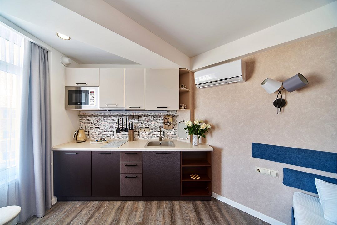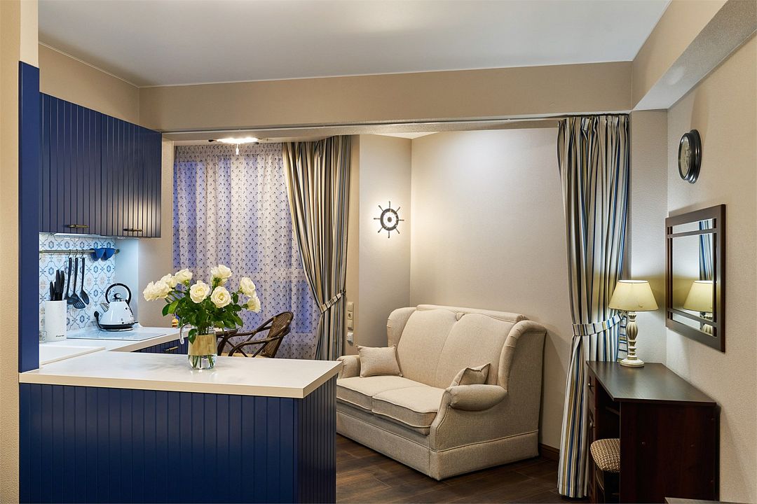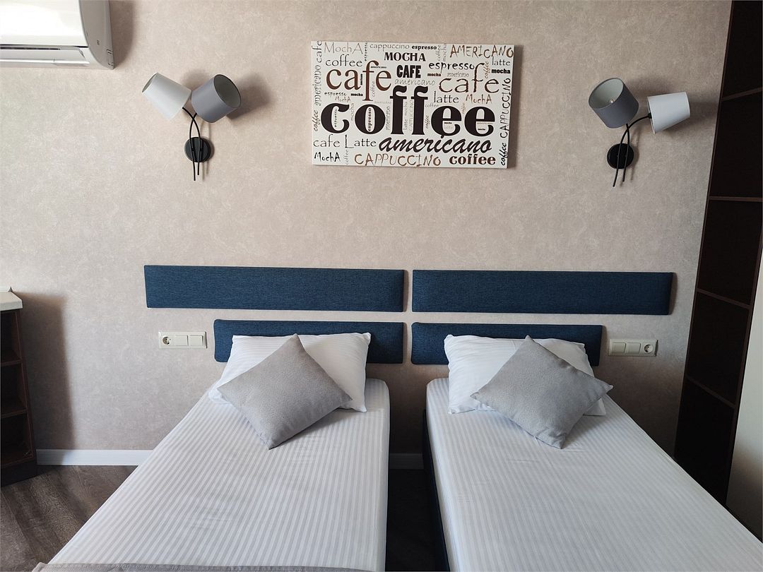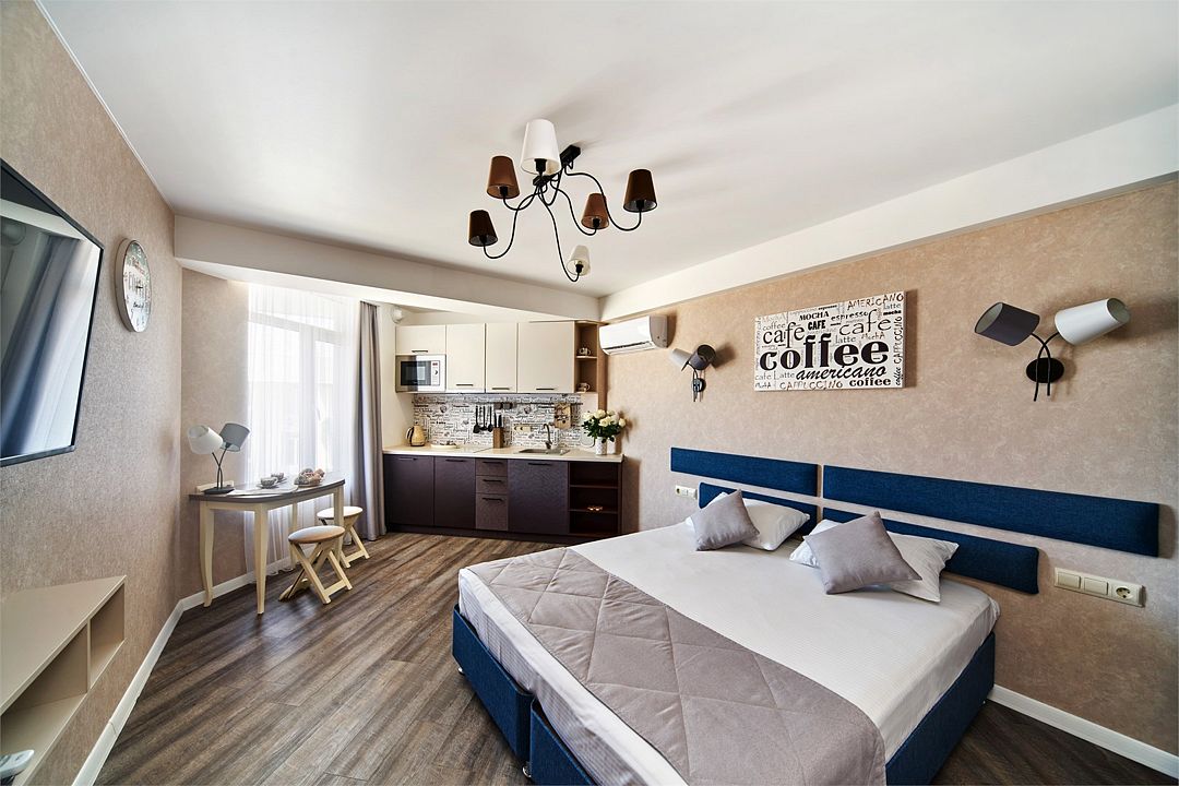 Делюкс студио «Кофейный» находится на 4 этаже с замечательным боковым видом из окна на море. Он оборудован в современном стиле с двуспальной кроватью или двумя раздельными кроватями.