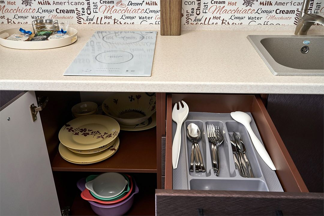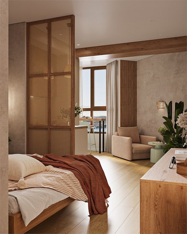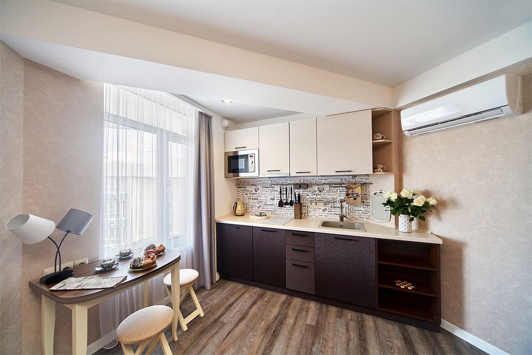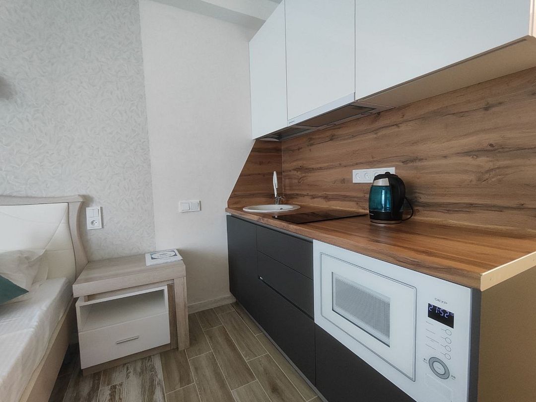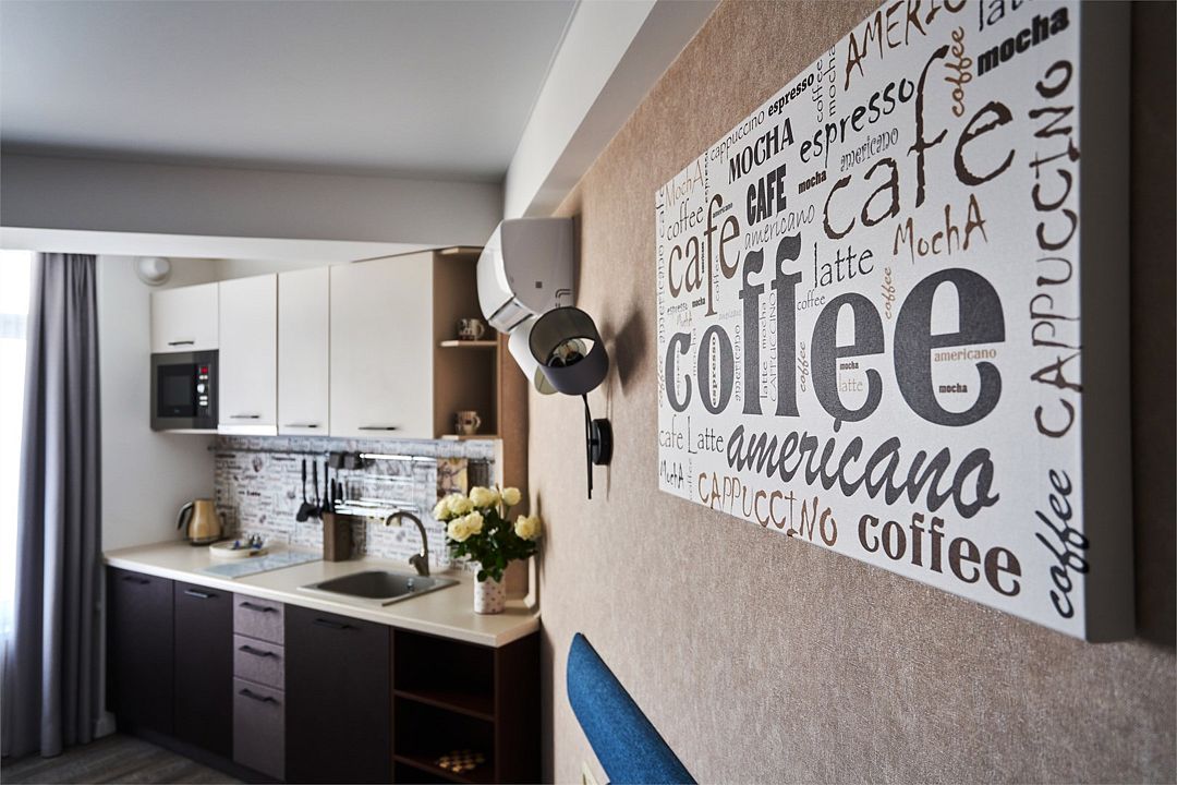 Делюкс студио «Кофейный» находится на 4 этаже с замечательным боковым видом из окна на море. Он оборудован в современном стиле с двуспальной кроватью или двумя раздельными кроватями.
