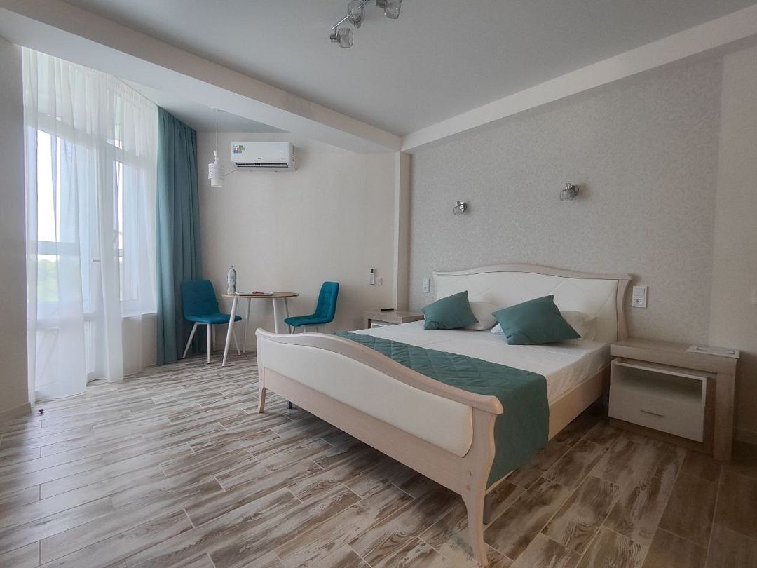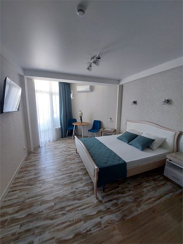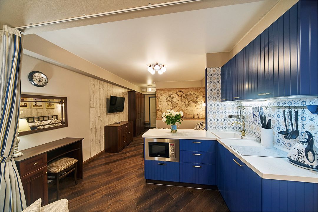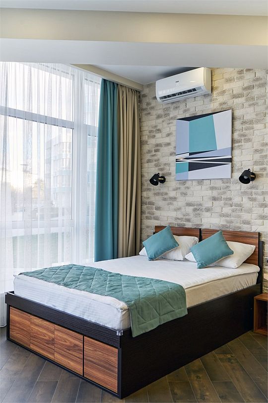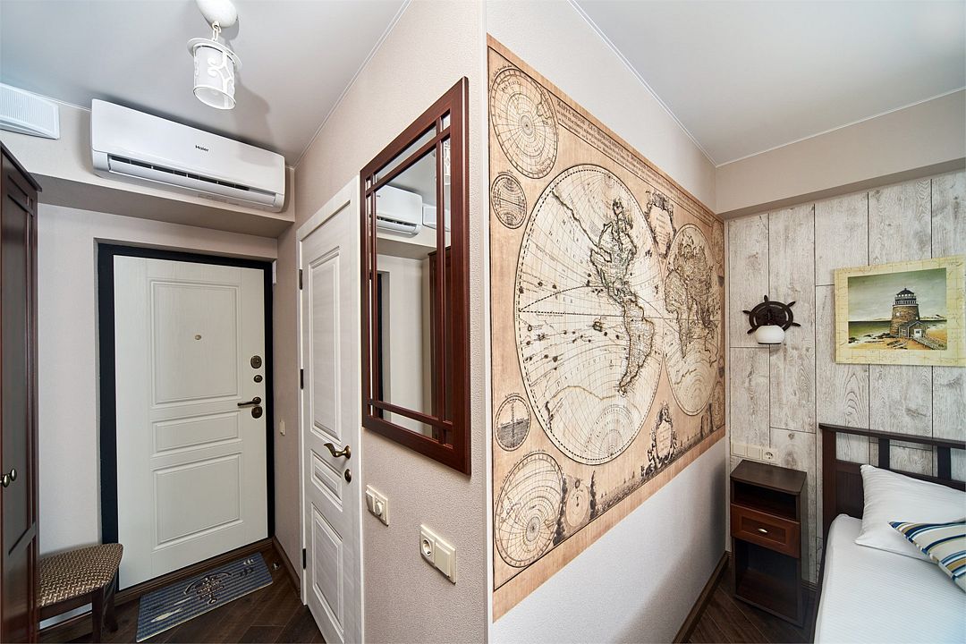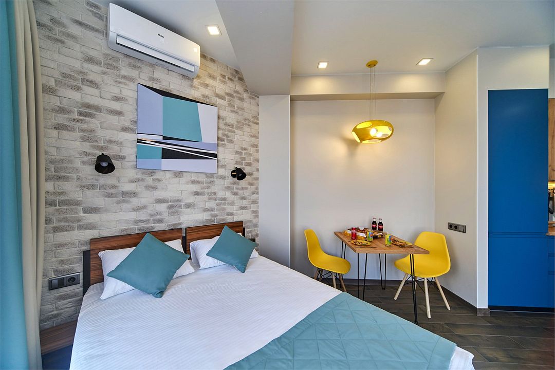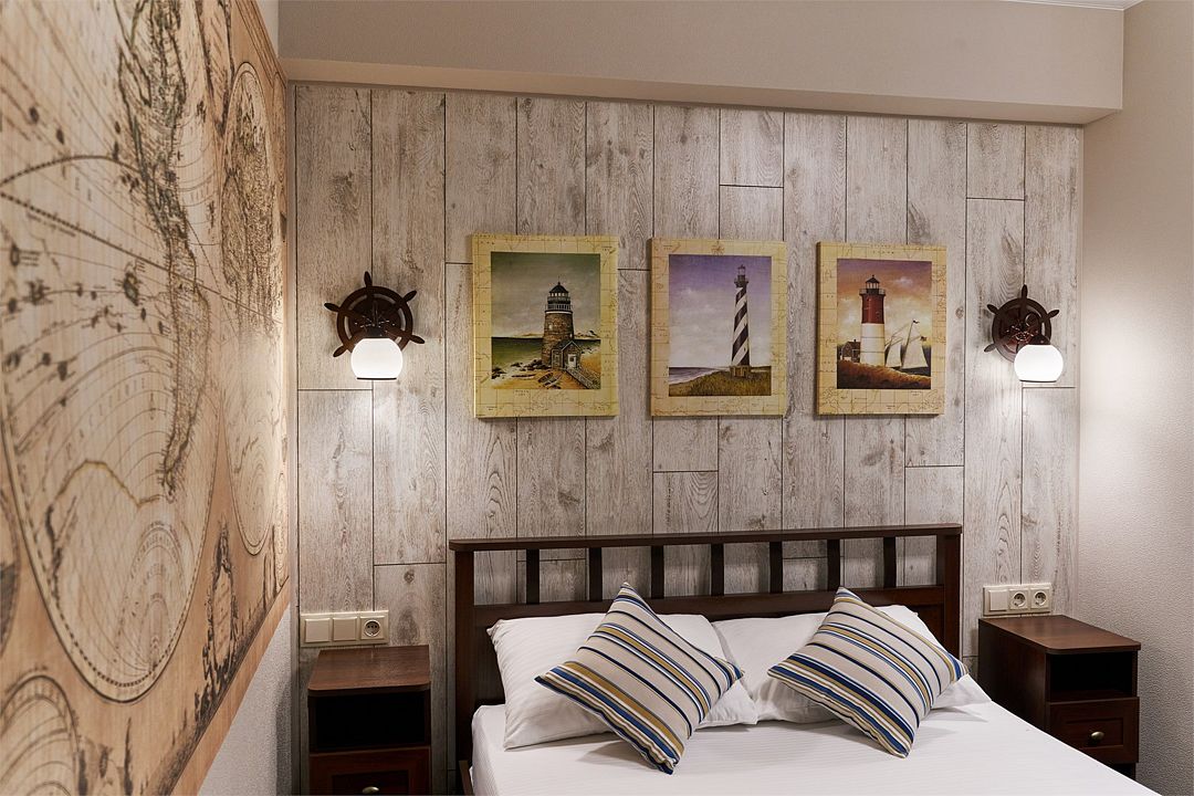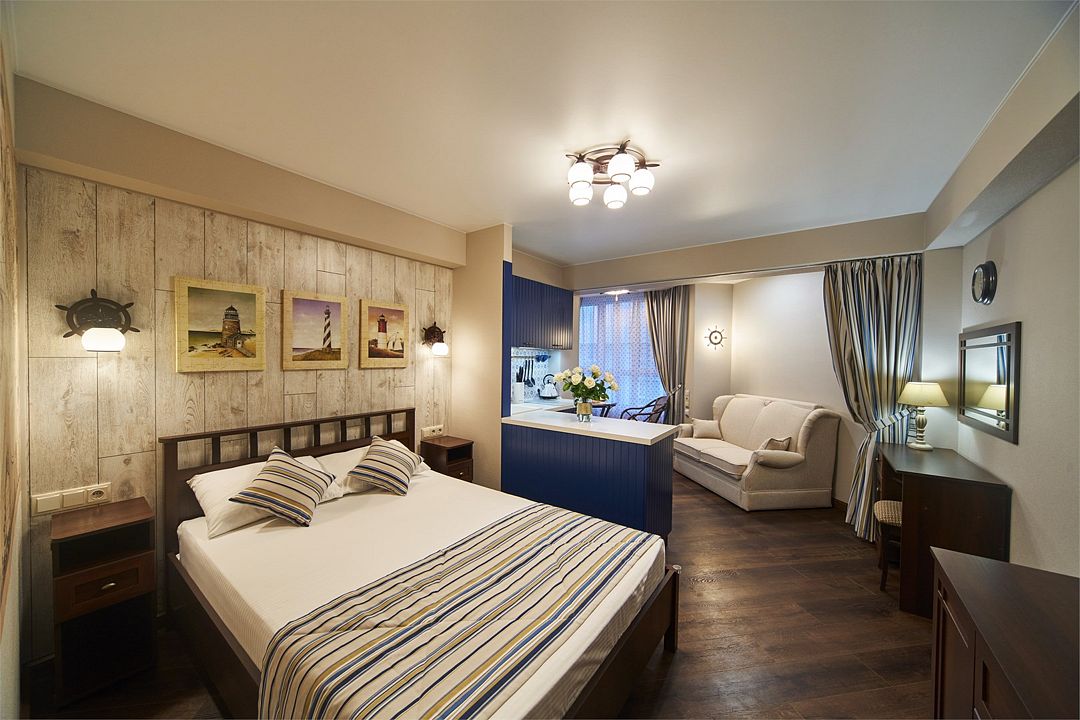 Брутальный однокомнатный номер в морском стиле с двуспальной кроватью и диваном. Премиальное оснащение мебелью и бытовой техникой. Шумоизоляция. Расположен на 4 этаже с боковым видом на море.