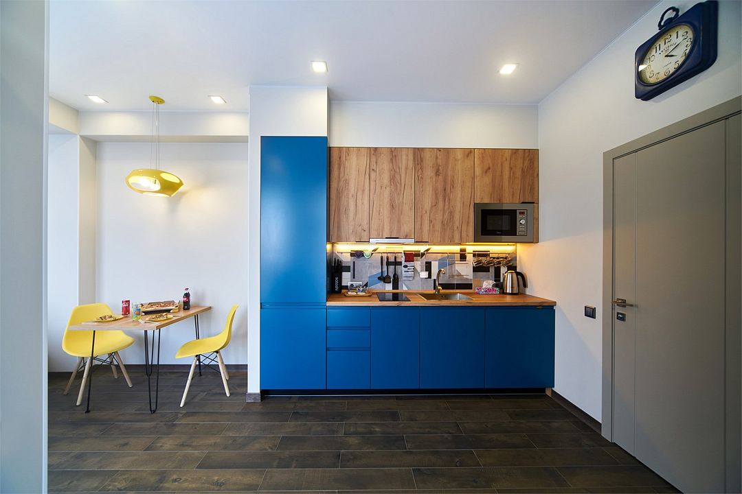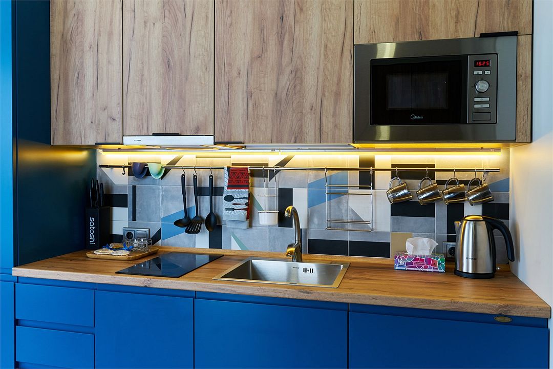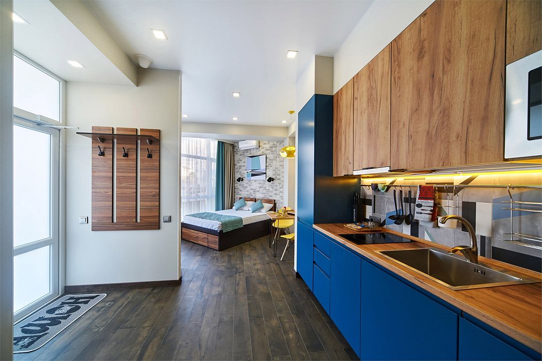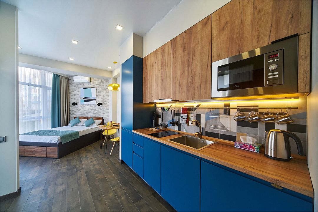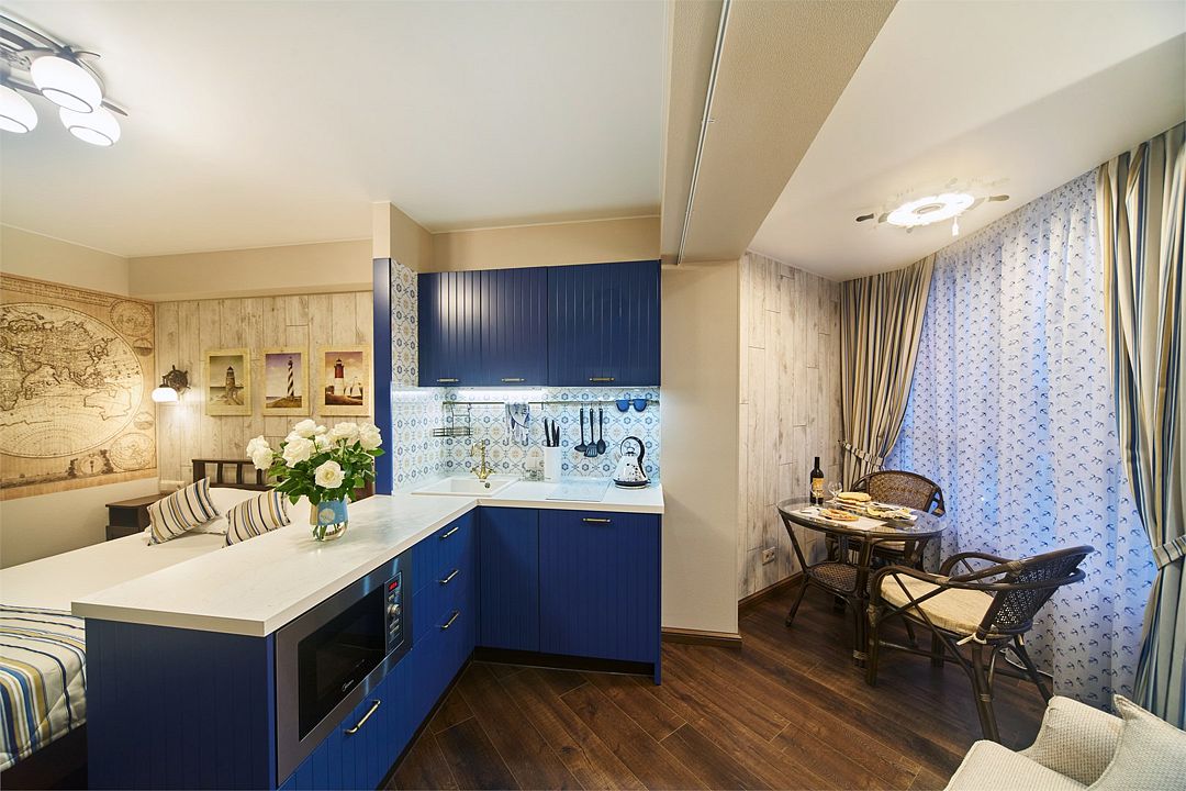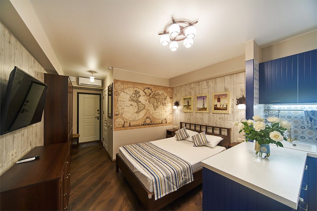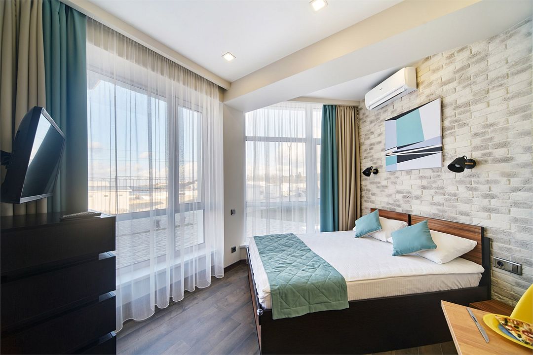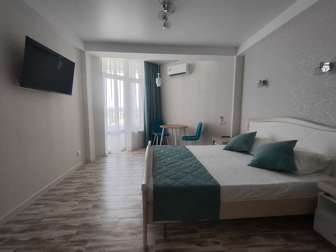 Брутальный однокомнатный номер в морском стиле с двуспальной кроватью и диваном. Премиальное оснащение мебелью и бытовой техникой. Шумоизоляция. Расположен на 4 этаже с боковым видом на море.