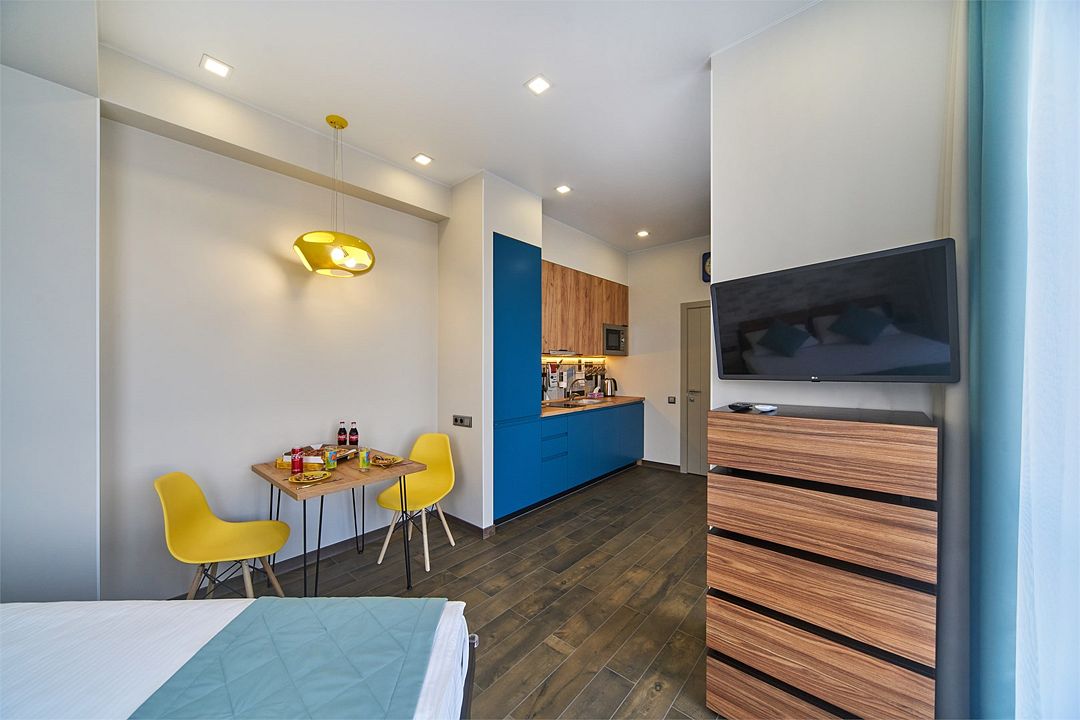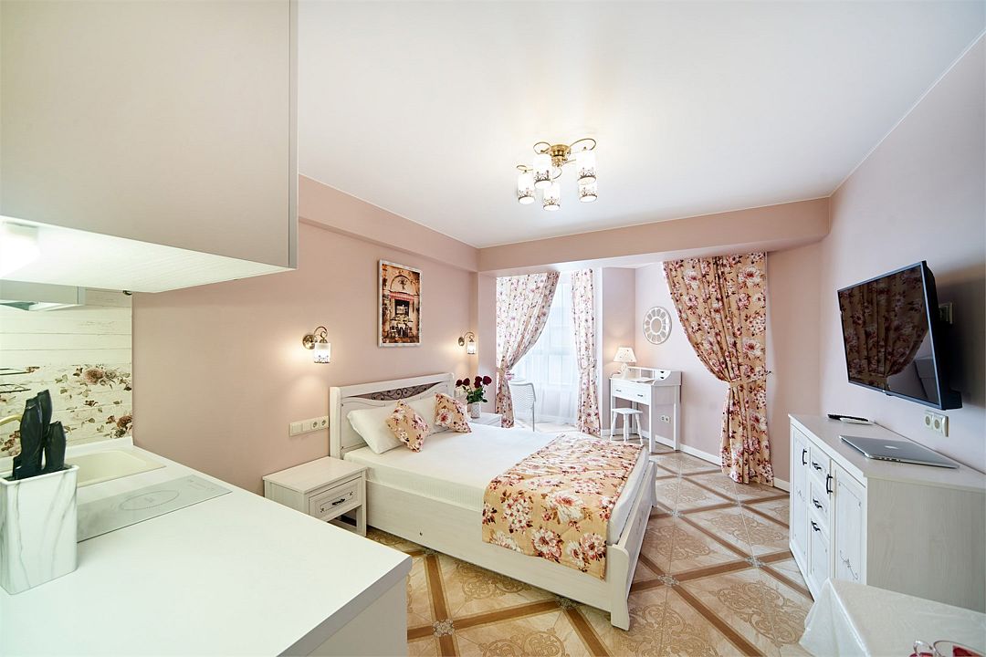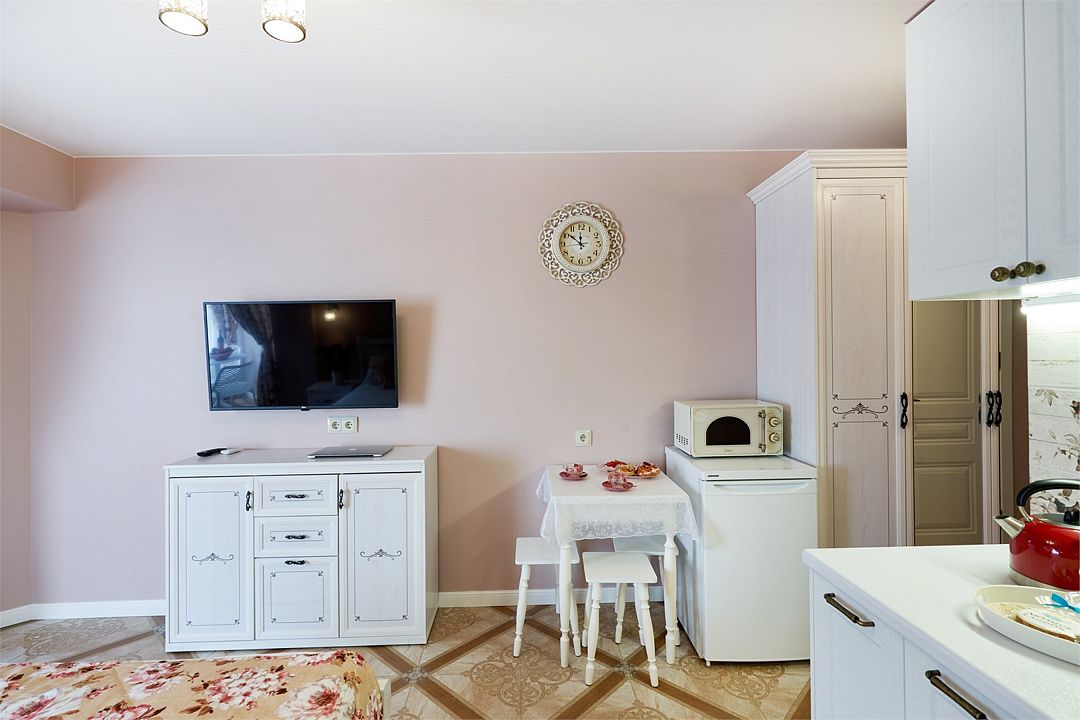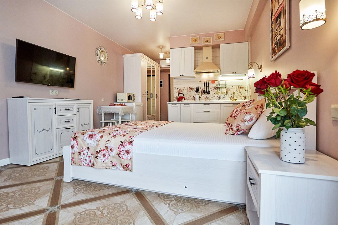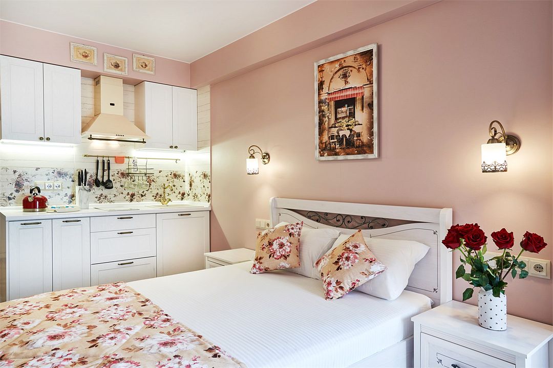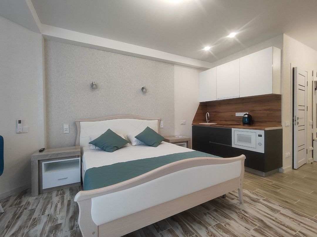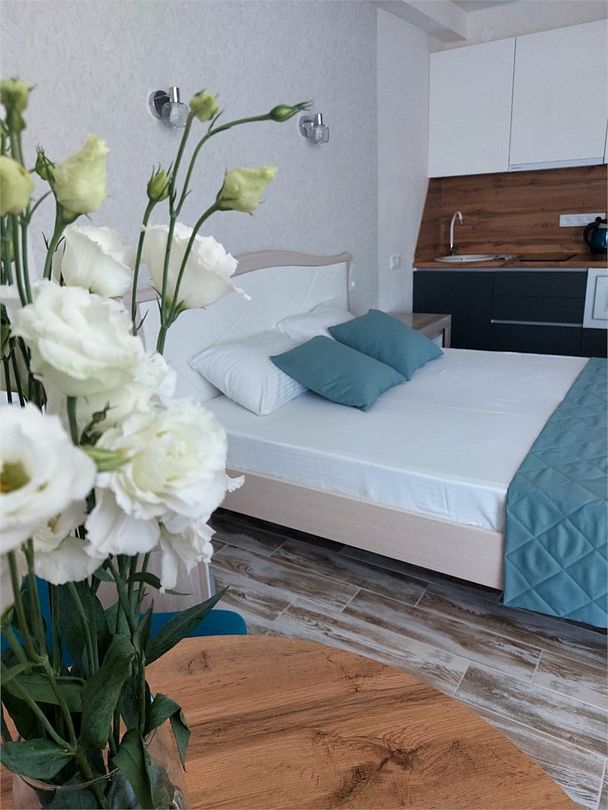 Делюкс студио «Уютный» – это атмосферный однокомнатный номер в стиле «Шебби-шик» с двуспальной кроватью и боковым видом на море. Премиальное оснащение мебелью и бытовой техникой. Шумоизоляция. Номер находится на 4 этаже.