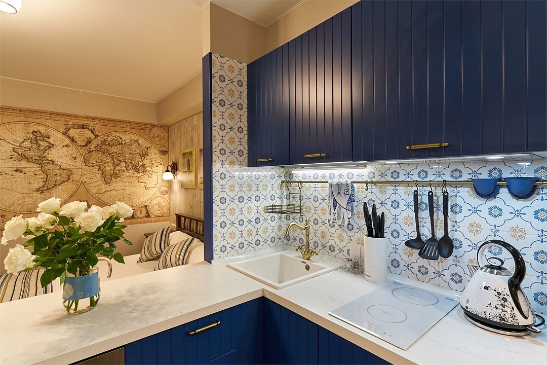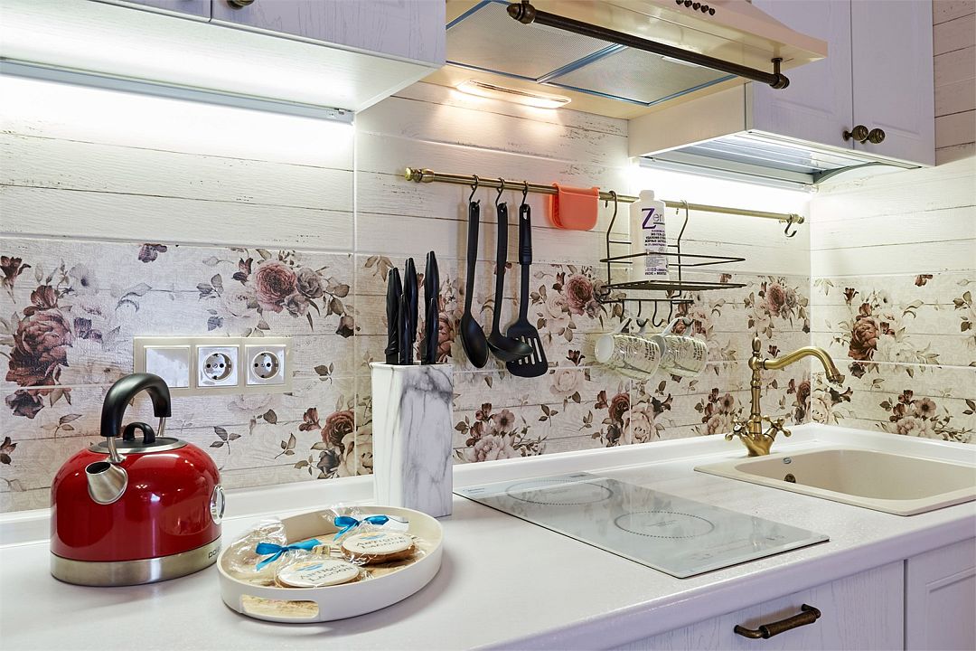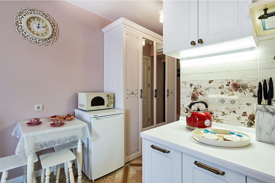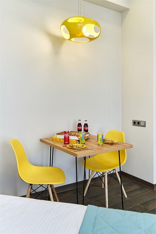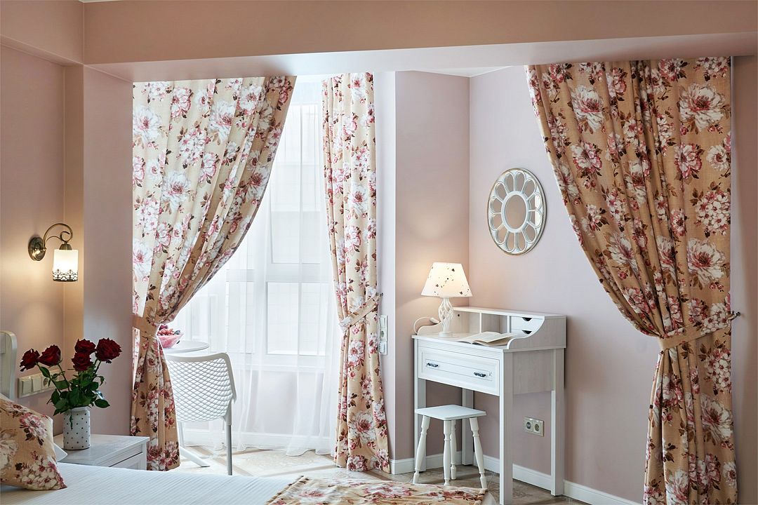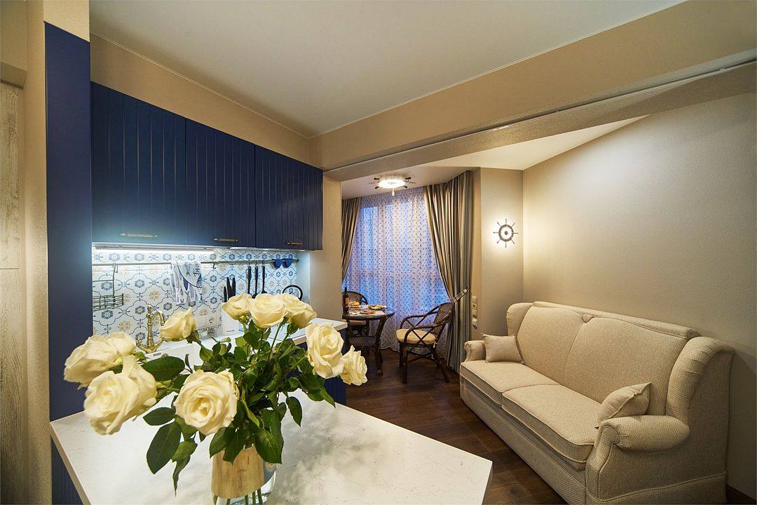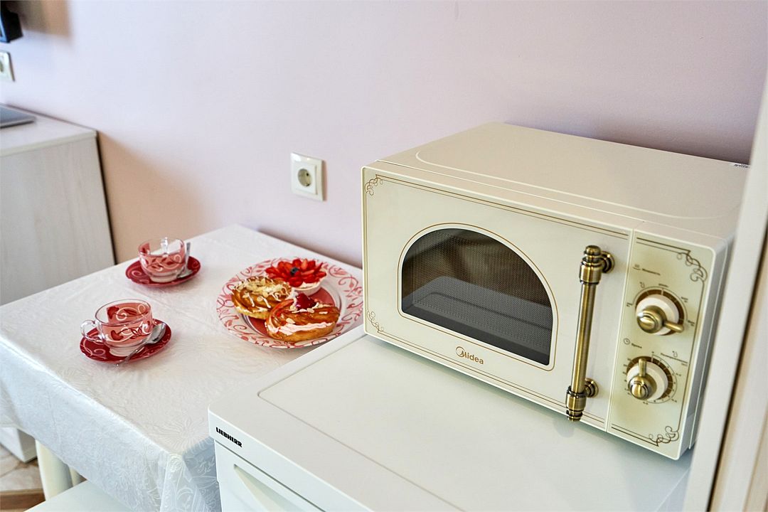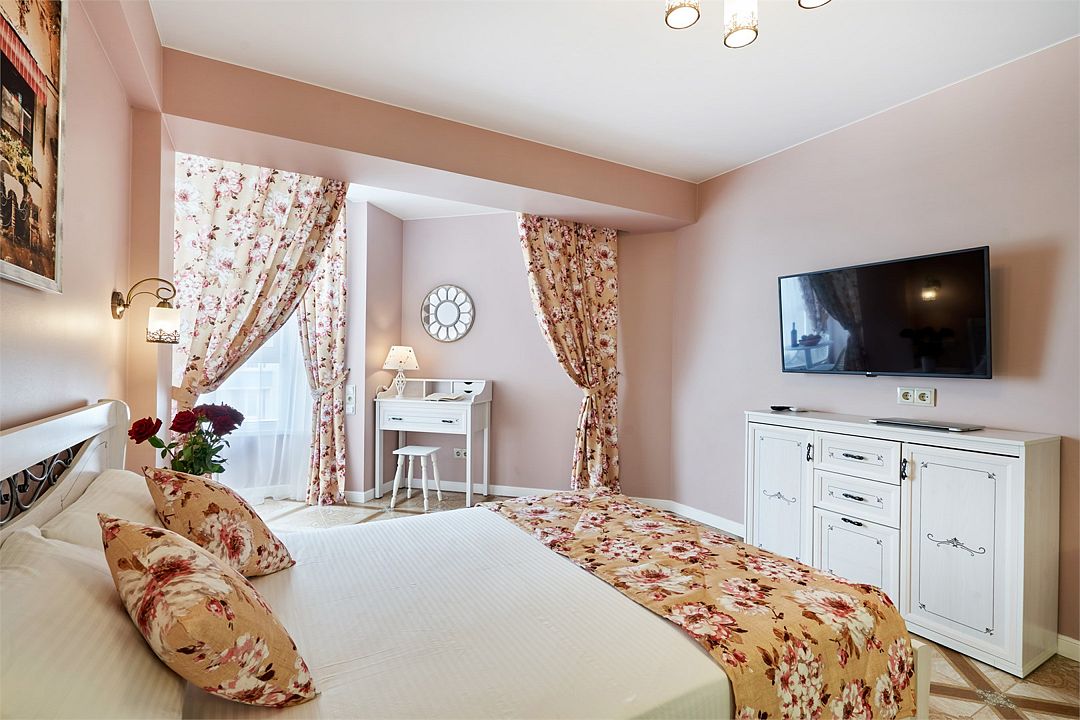 Делюкс студио «Уютный» – это атмосферный однокомнатный номер в стиле «Шебби-шик» с двуспальной кроватью и боковым видом на море. Премиальное оснащение мебелью и бытовой техникой. Шумоизоляция. Номер находится на 4 этаже.