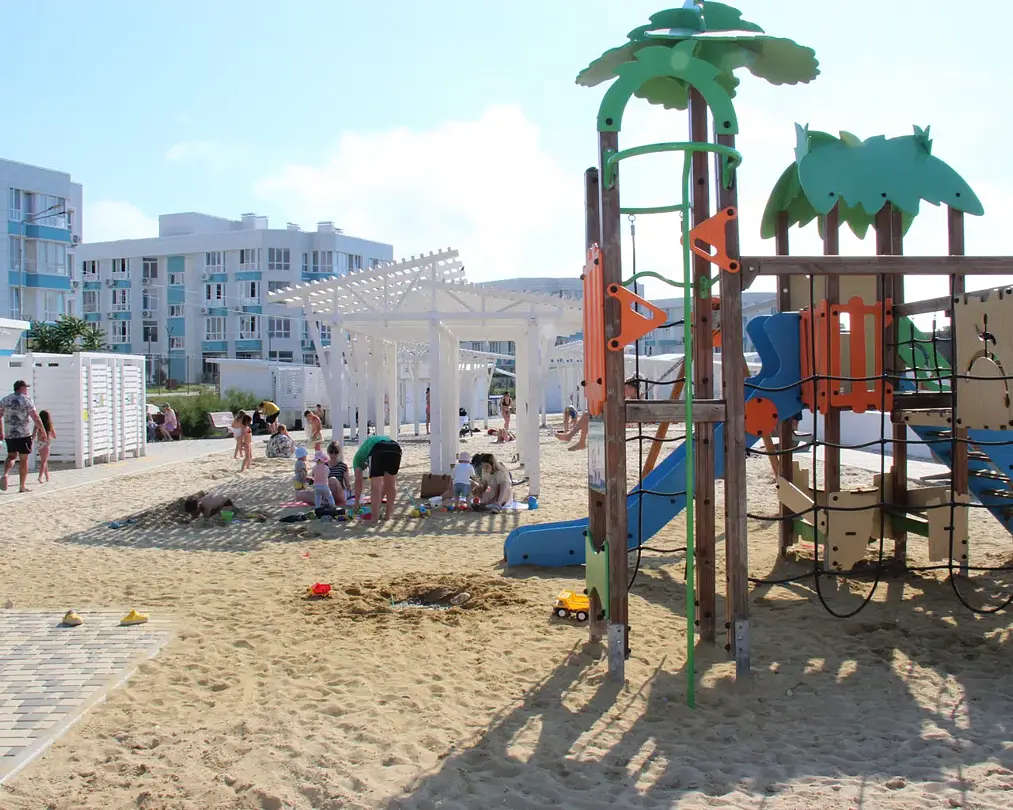 Новый оборудованный Адмиральский пляж со спортплощадкой, навесами, лежаками, входом в море для детей и пожилых, игровая зона и детская анимация, песочная и галечная зоны пляжа.