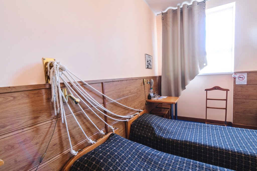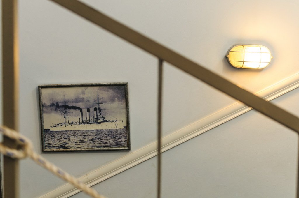 Отель стилизован под крейсер «Аврора», изображение которого украшает фасад здания. В коридоре и на лестницах отеля гости могут увидить фото шедевров мирового кораблестроения с их тактико-техническими данными.