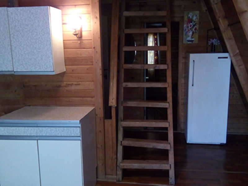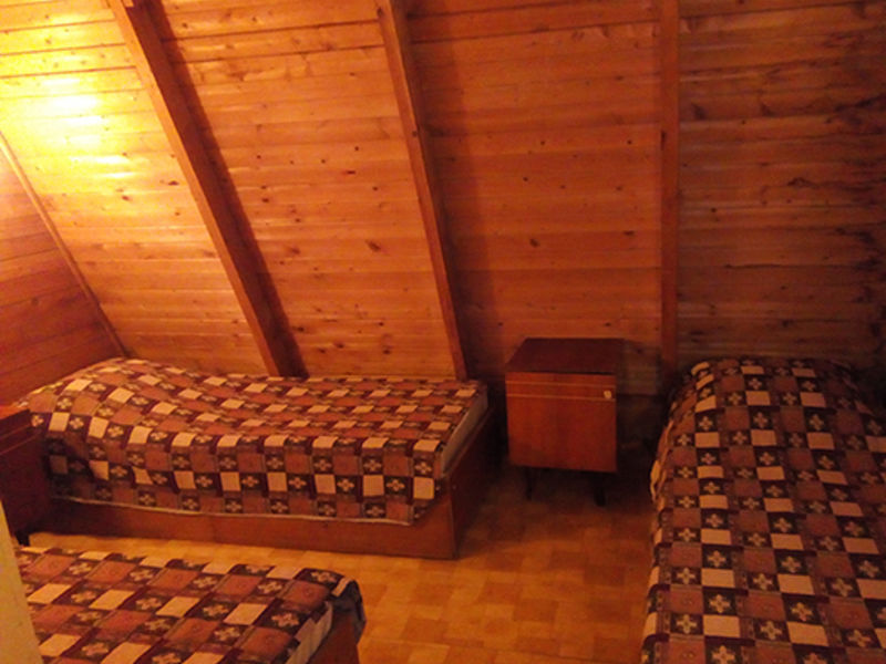 Двухэтажный дом из дерева с двумя 2-х местными спальнями на втором этаже и одной 3-х местной на первом.