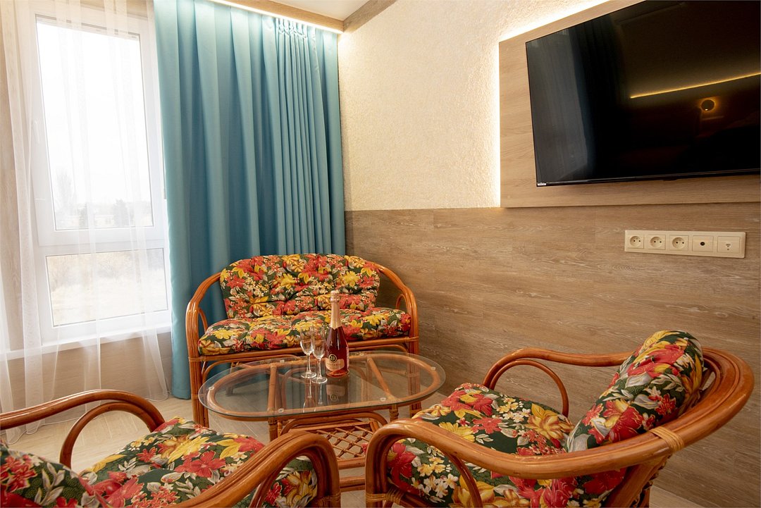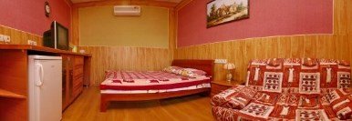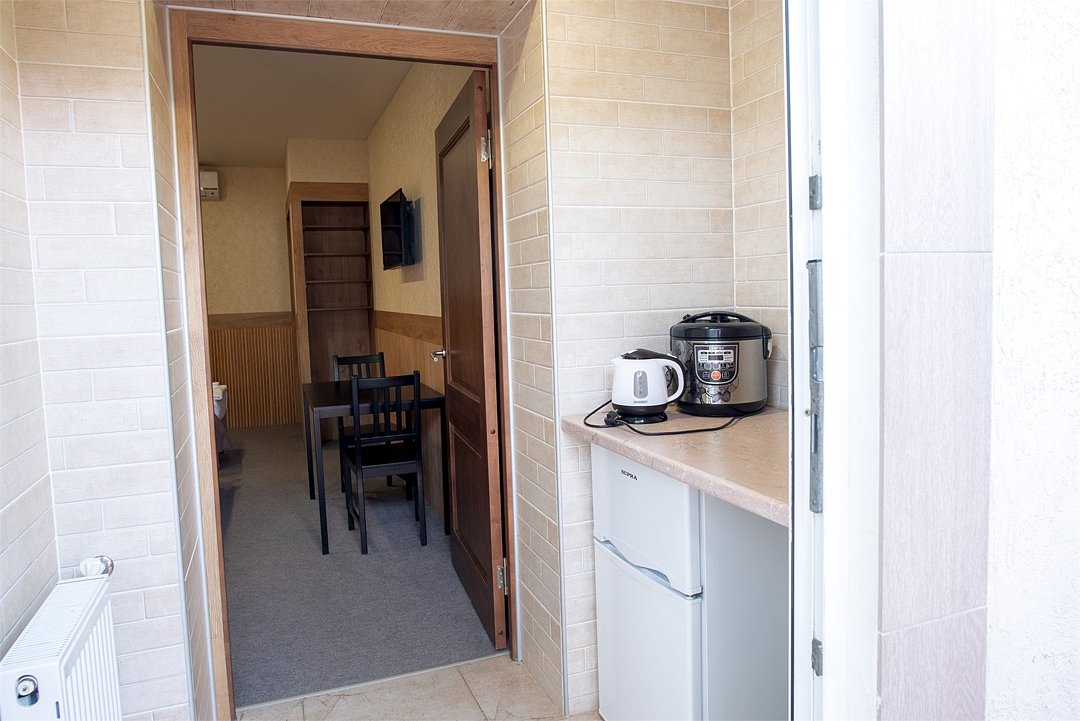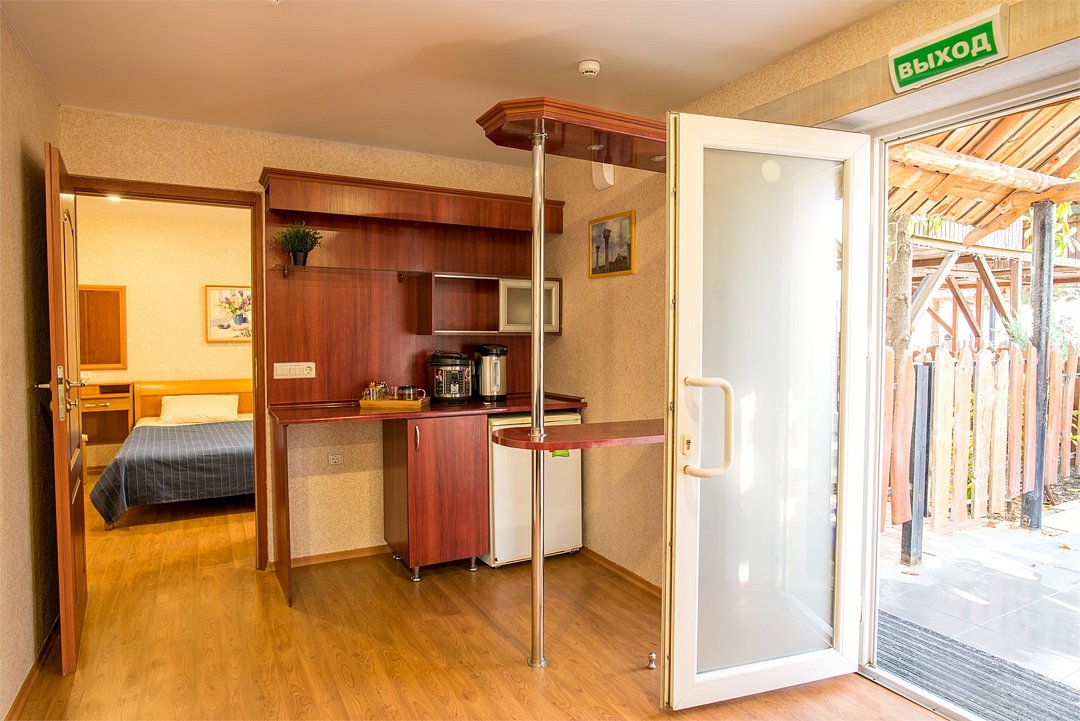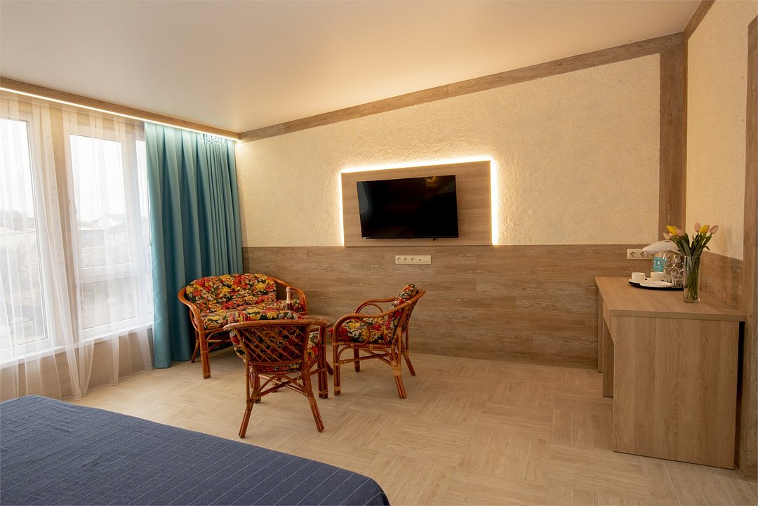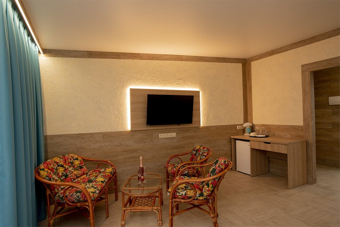 В гостинице есть два номера этой категории. Один находится на первом этаже с отдельным выходом во двор, есть своя огороженная веранда с деревянной мебелью для отдыха. В этом номере две проходные комнаты. И есть номер на втором этаже, без балкона. На втором этаже комнаты раздельные. По комплектации номера одинаковые.Услуги и удобства