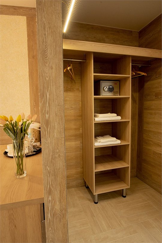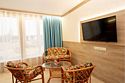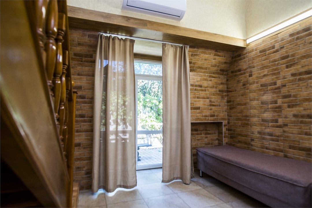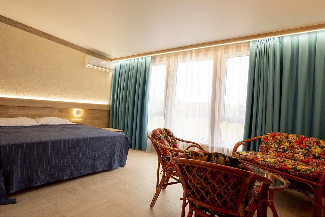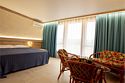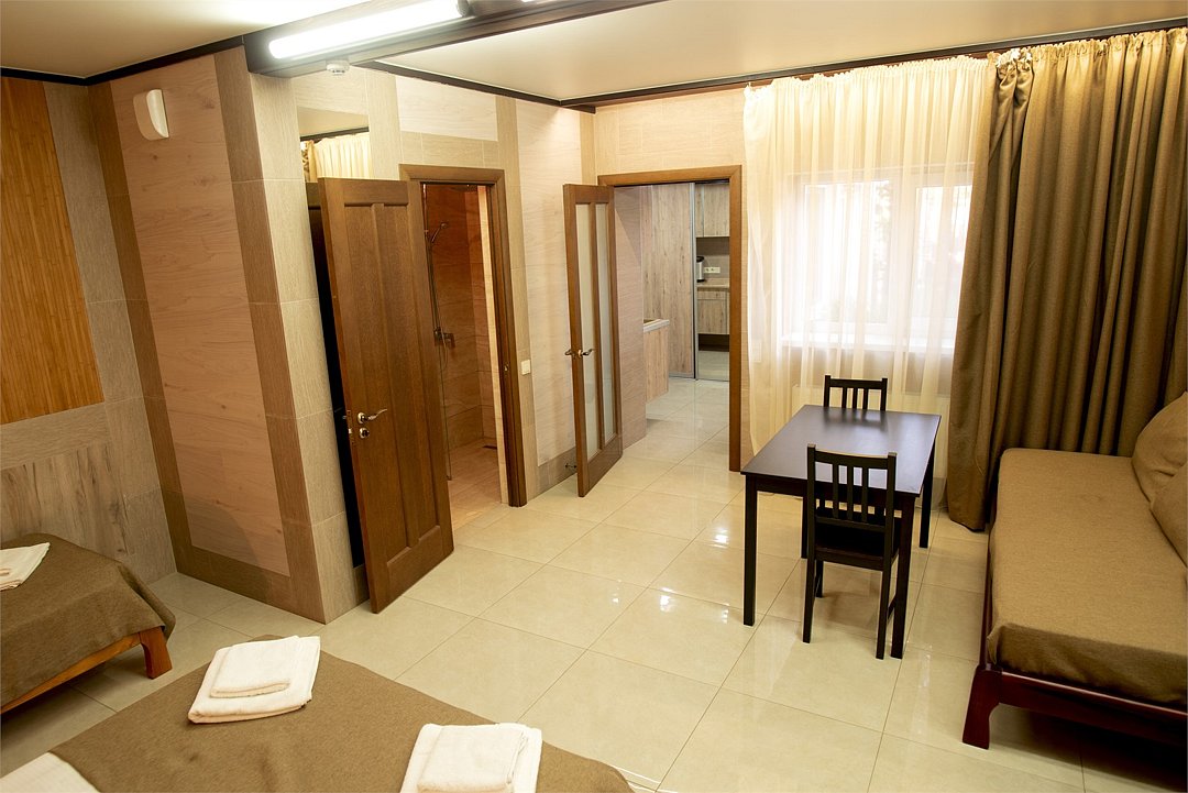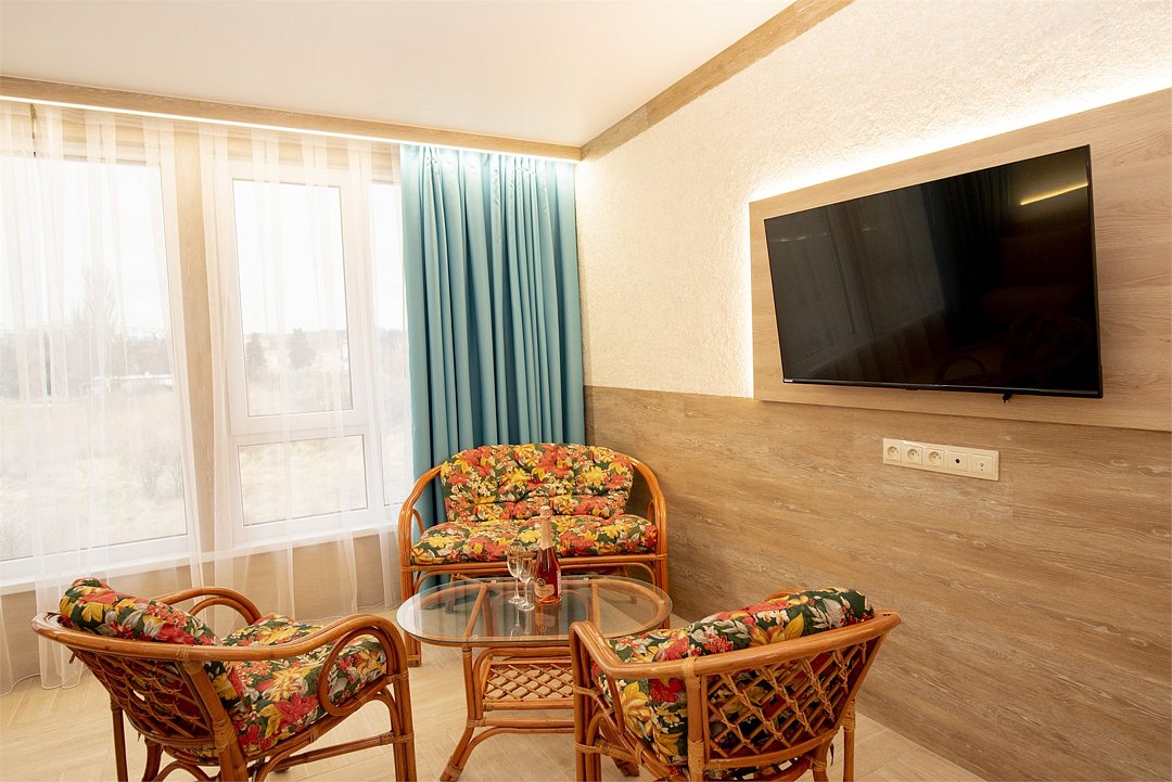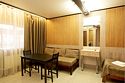 В гостинице есть два номера этой категории. Один находится на первом этаже с отдельным выходом во двор, есть своя огороженная веранда с деревянной мебелью для отдыха. В этом номере две проходные комнаты. И есть номер на втором этаже, без балкона. На втором этаже комнаты раздельные. По комплектации номера одинаковые.Услуги и удобства