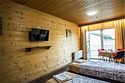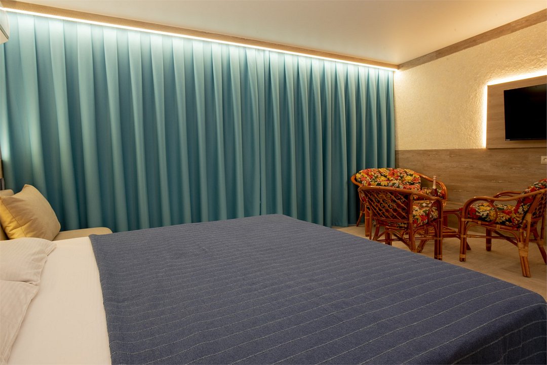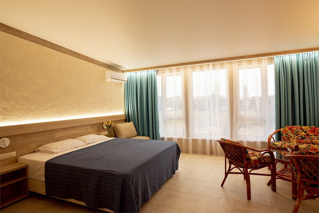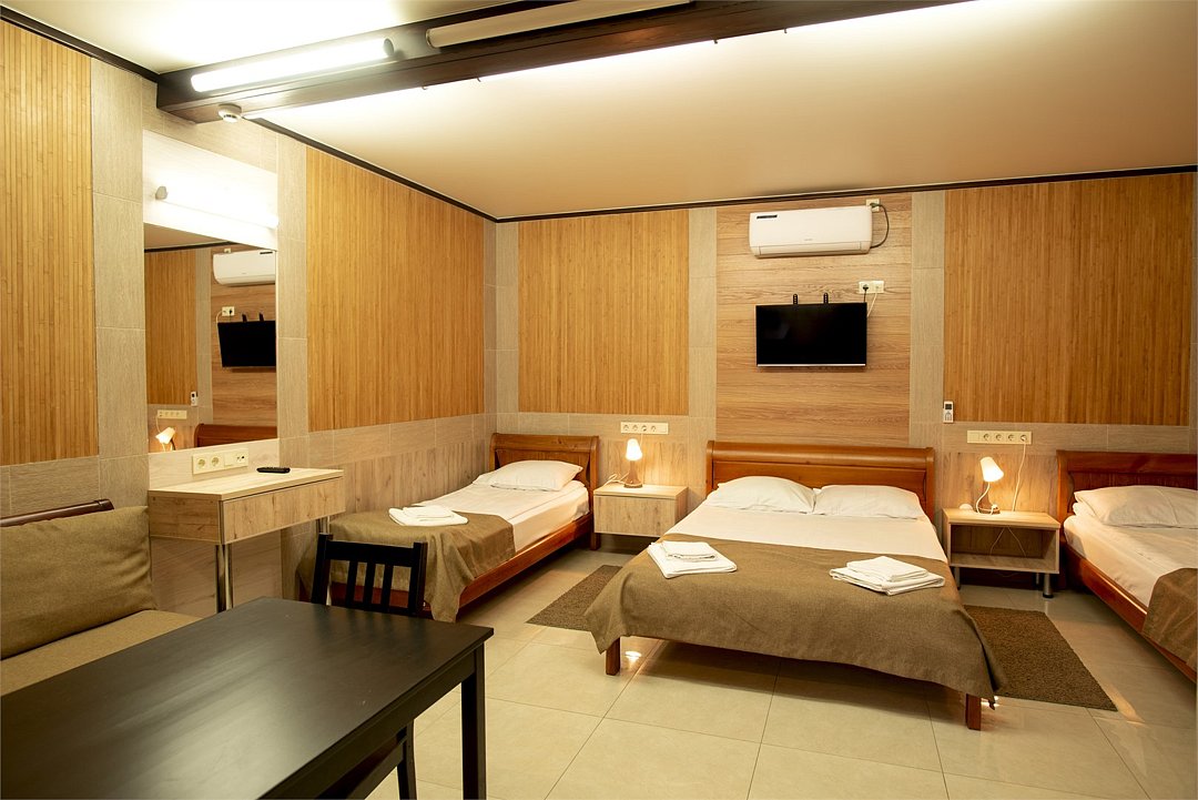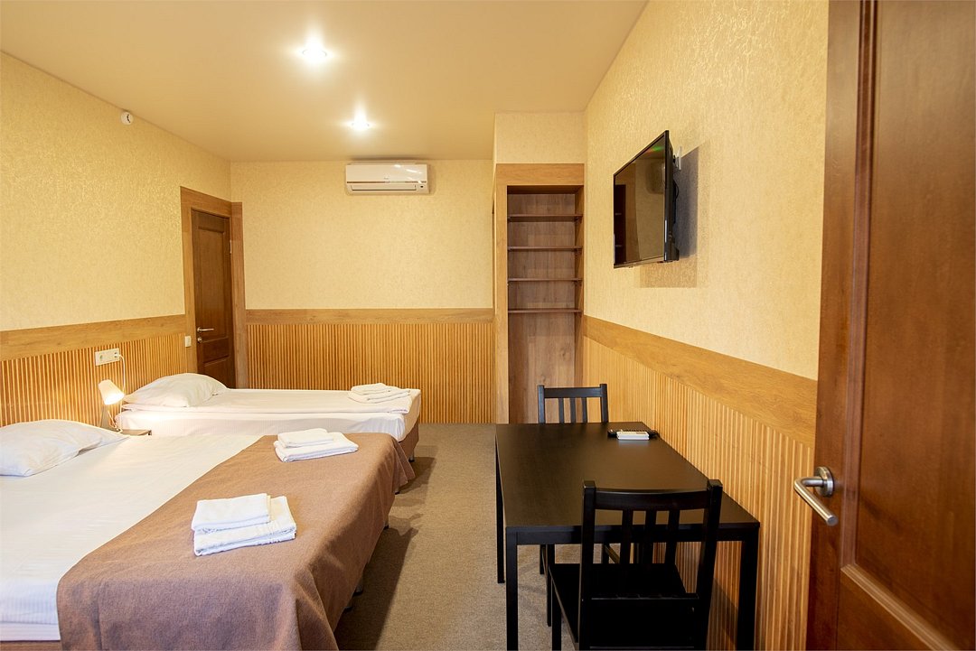Новые большие и светлые номера 2021 года. Находятся на втором этаже. В номере большая 2-х спальная кровать. Возможны дополнительные места для двух детей + при необходимости можно доставить детскую кроватку. Панорамные окна. Шторы полный блэкхаут и ортопедические матрасы на кроватях способствуют хорошему сну! Улучшенная звукоизоляция номера. Приятный вид из окна. Есть вся необходимая посуда. В номере есть сейф. Как и в других номерах гостиницы есть термопот, холодильник, фен, телевизор, кондиционер и Wi-fi.Услуги и удобства