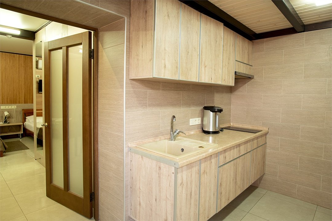 Большой комфортабельный номер с кухней на первом этаже. На кухне есть все необходимое для приготовления пищи. Отдельный вход, есть огороженная веранда с деревянной мебелью для отдыха. Спальные места для четырех человек, возможно проживание пятого человека на дополнительном месте. Отлично подойдет для большой семьи.Услуги и удобства