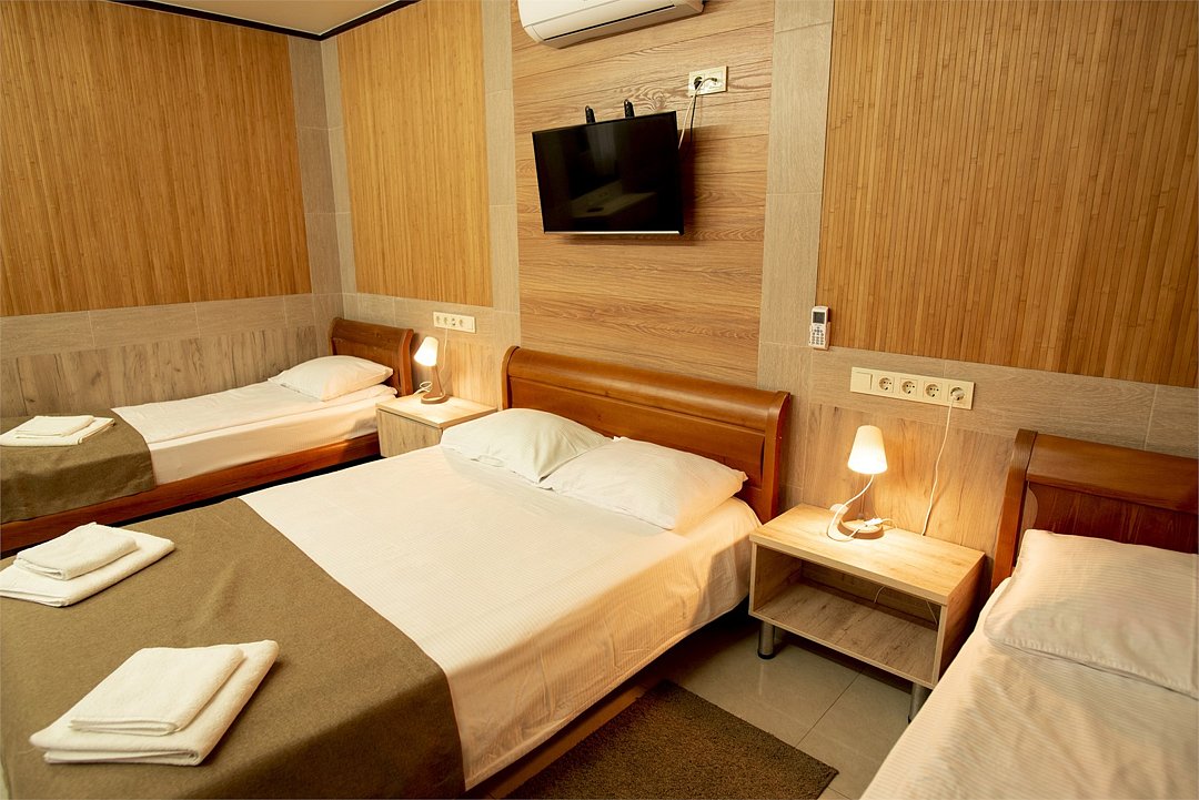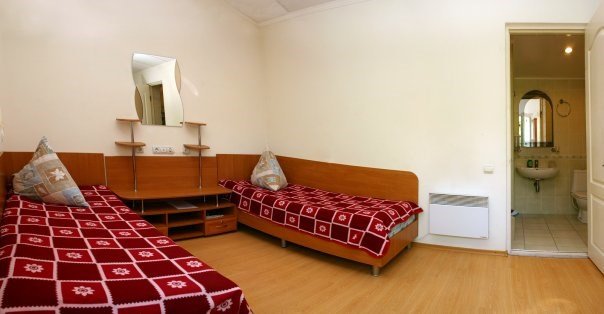 Комфортабельный номер на 2-м этаже с балконом. На балконе установлена деревянная мебель для отдыха и сушилка для белья. В номере все удобства. Односпальные кровати на 4х человек. Можно сдвигать и делать одну 2-х спальную и две односпальные кровати.Услуги и удобства