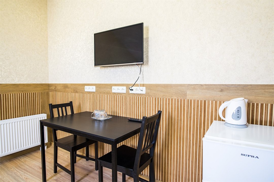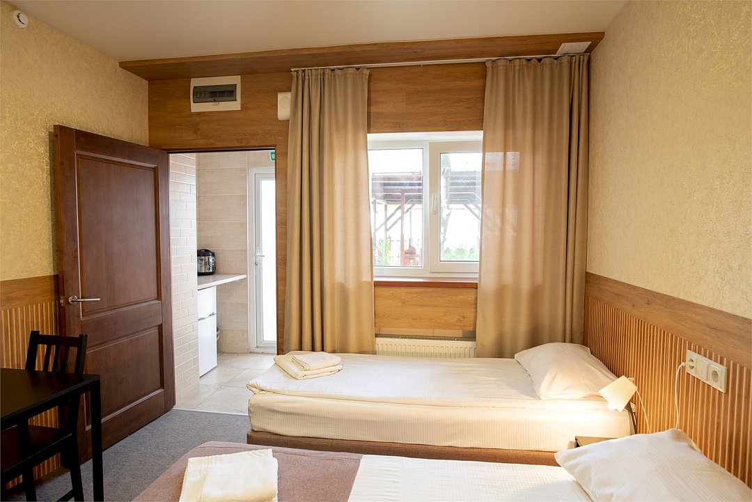 телевизор, Wi-Fi, холодильник, кондиционер, фен, душевая кабина, санузел, банные полотенца, две односпальные кровати, шкаф для одежды, журнальный столик, зеркало, мебельный гарнитур, чайник, отопление, отдельный вход в номер, вид во двор, туалет, можно с питомцамиВ номере