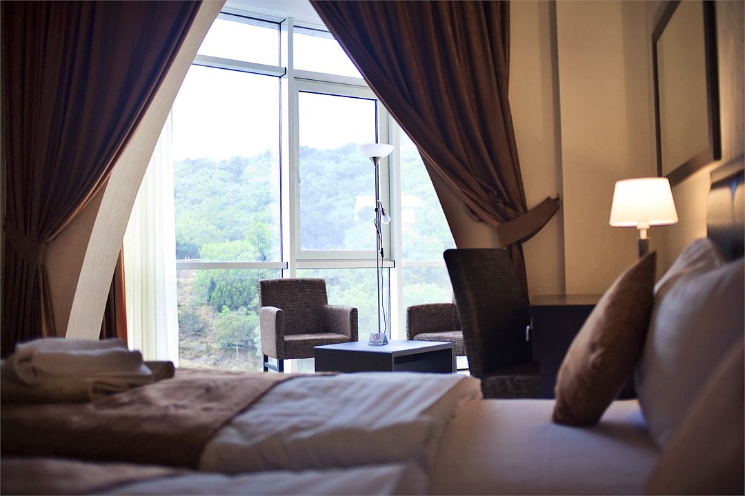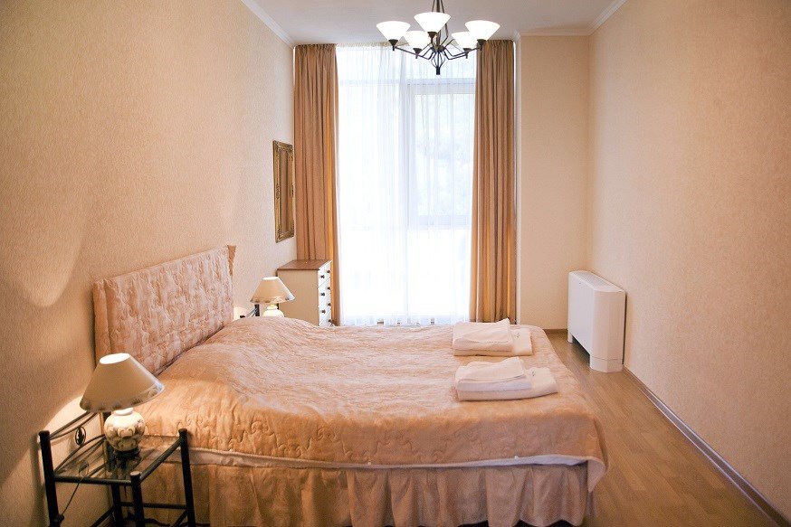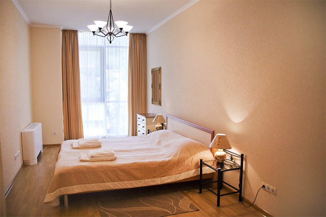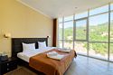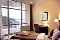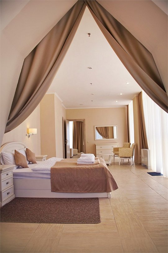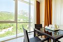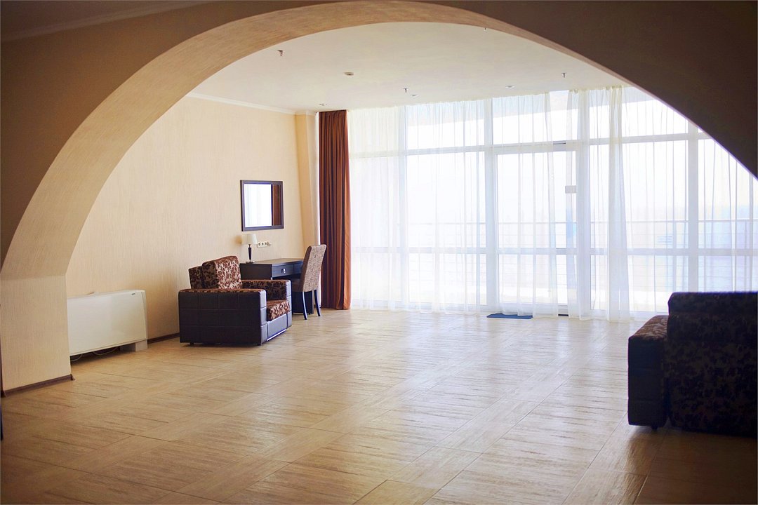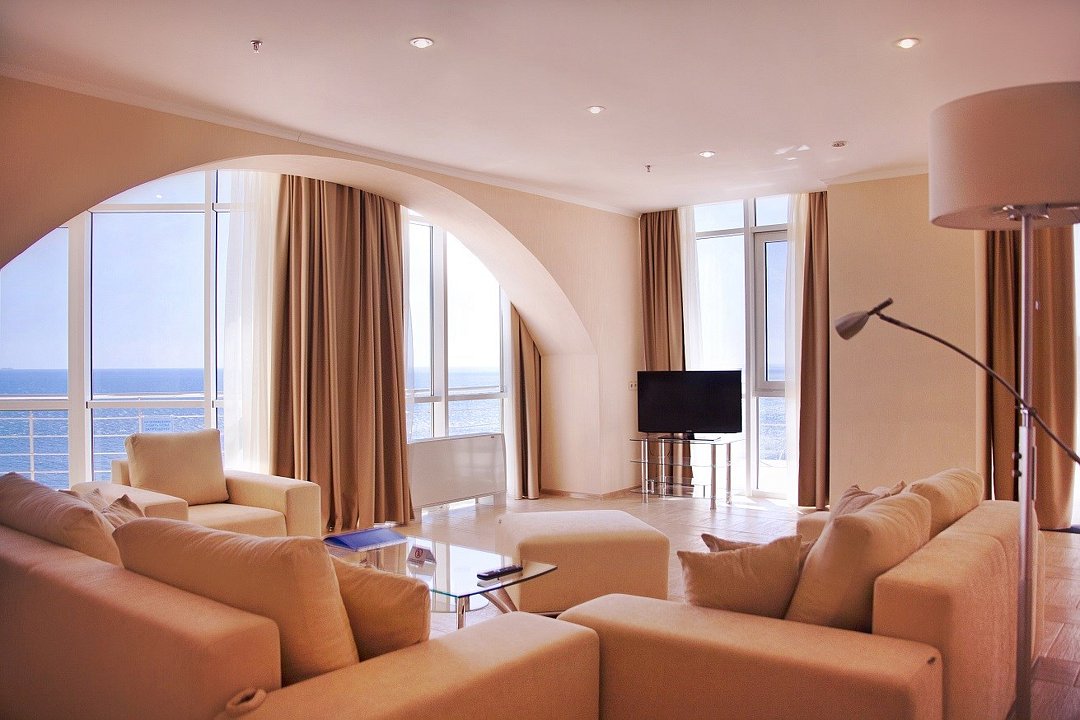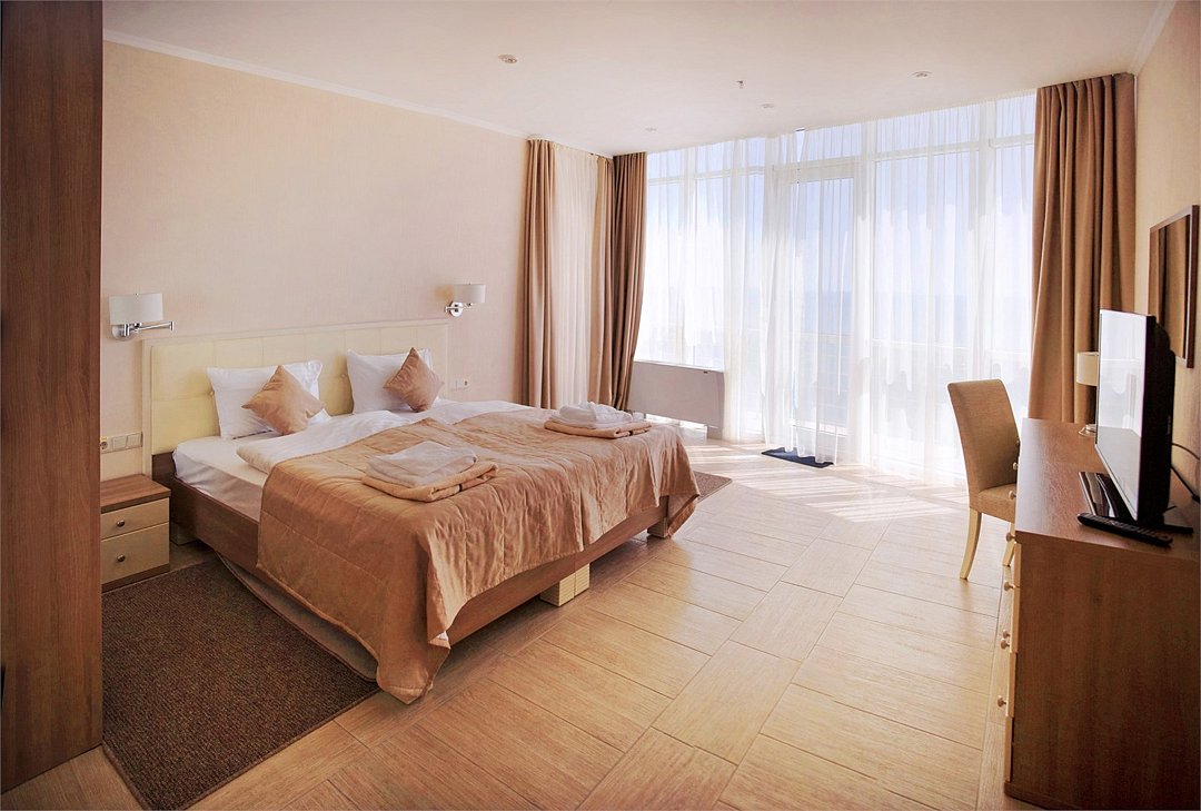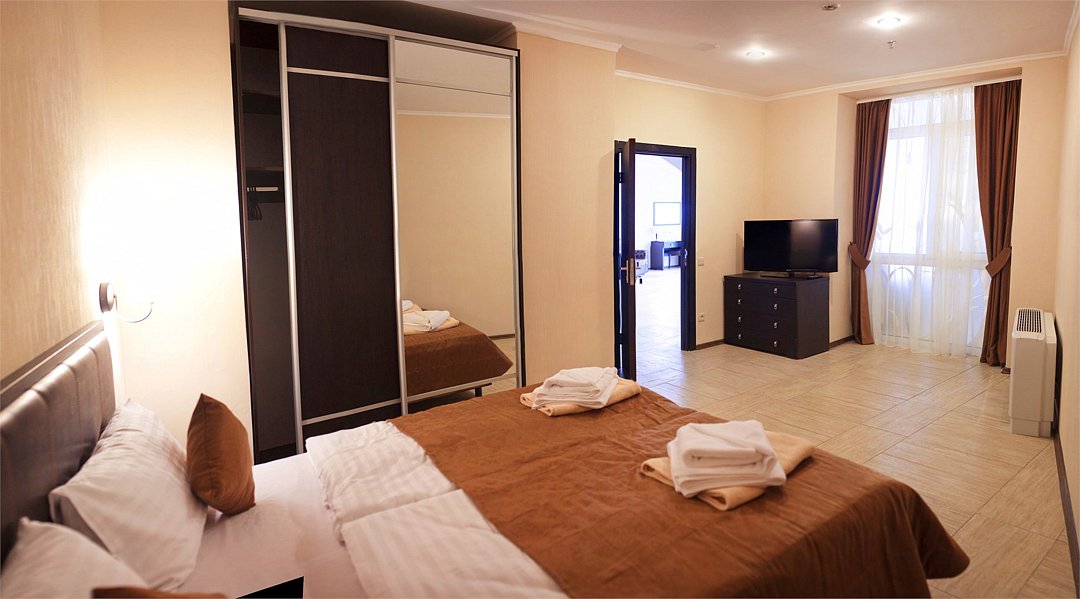 Номер категории ПРЕЗИДЕНТСКИЙ расположен в корпусе БАШНЯ, является единственным и уникальным номером данной категории, площадь которого составляет 120 м². Роскошный, просторный, необычно светлый номер разделен на четыре комнаты, и включает в себя три спальни и гостевую зону. Три широкие двуспальные кровати, уютный диван с креслами, вместительный гардероб. Гости, выбравшие номер ПРЕЗИДЕНТСКИЙ, насладятся комфортным и светлым интерьером. Просторная гостиная с тремя спальнями – основа эксклюзивного отдыха. Из панорамных окон президентского номера и террас открывается вид на Черное море, набережную гостиничного комплекса, массивные горы. Президентский номер является идеальным местом для проведения замечательного дня и сказочного романтического отдыха.Услуги и удобства
