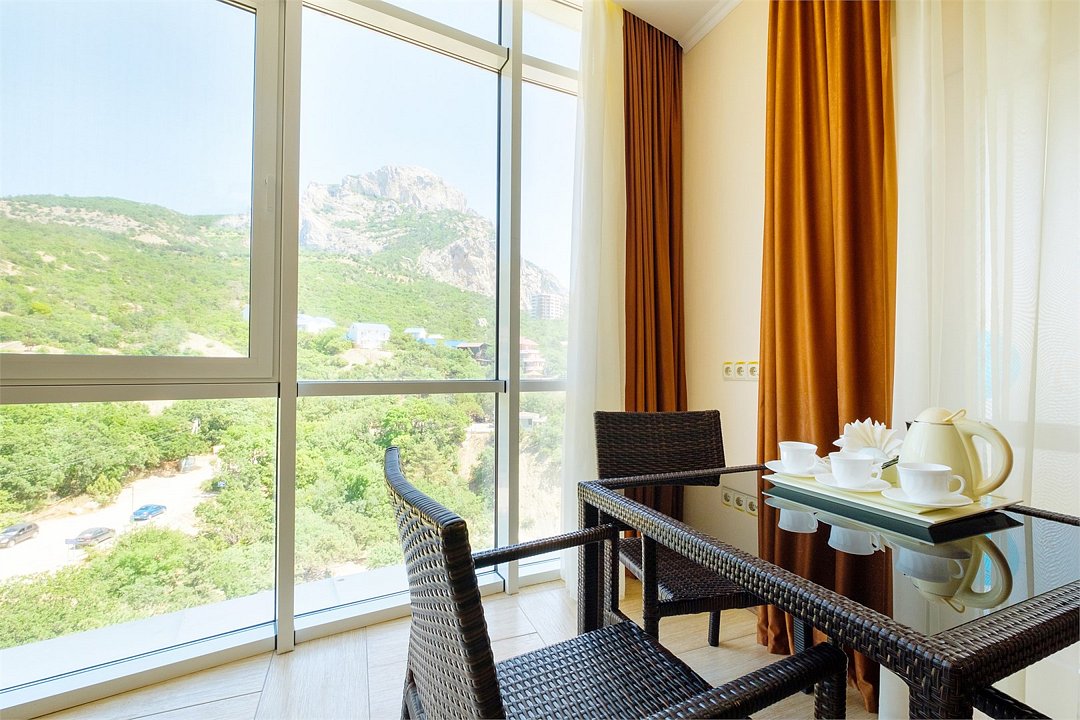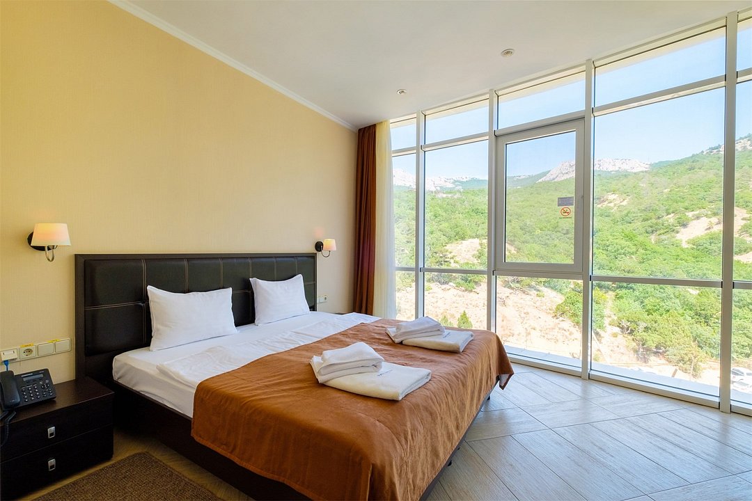 Номера категории ЛЮКС УЛУЧШЕННЫЙ море расположены в корпусе БАШНЯ. Площадь номеров данной категории составляет 100 м². Просторный и современный номер состоит из гостиной комнаты и двух спален. Номера оснащены двумя большими двуспальными кроватями (DOUBLE) , диваном в гостиной зоне, двумя ванными комнатами с душевой кабинкой, гардеробом. Гости, выбравшую данную категорию, смогут наслаждаться потрясающим видом на Крымские горы и Черное море.Услуги и удобства