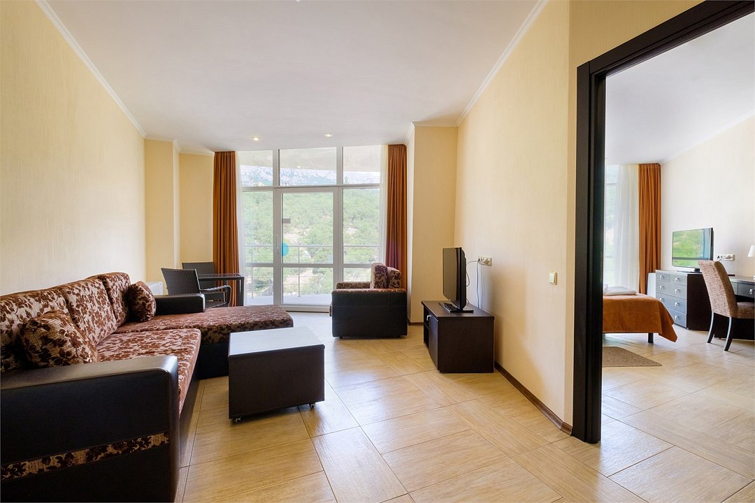 Номера категории ЛЮКС СЕМЕЙНЫЙ горы расположены в корпусе БАШНЯ. Площадь номеров 60 м². Двухкомнатный номер состоит из гостиной и спальни, просторной ванной комнаты с душевой кабинкой, вместительной гардеробной. Номера без балконов. Количество основных мест: 3; Гости, выбравшие эту категорию, насладятся оригинальным дизайном, уютным интерьером, прекрасным видом на горы и парк.Услуги и удобства