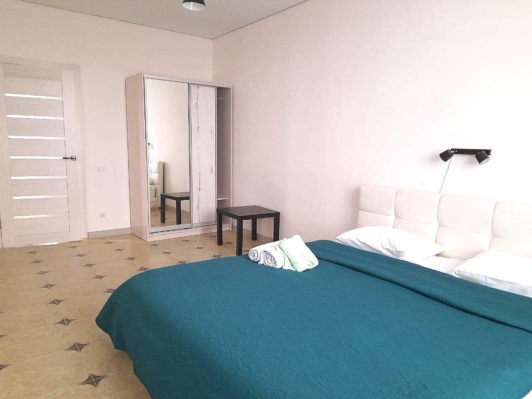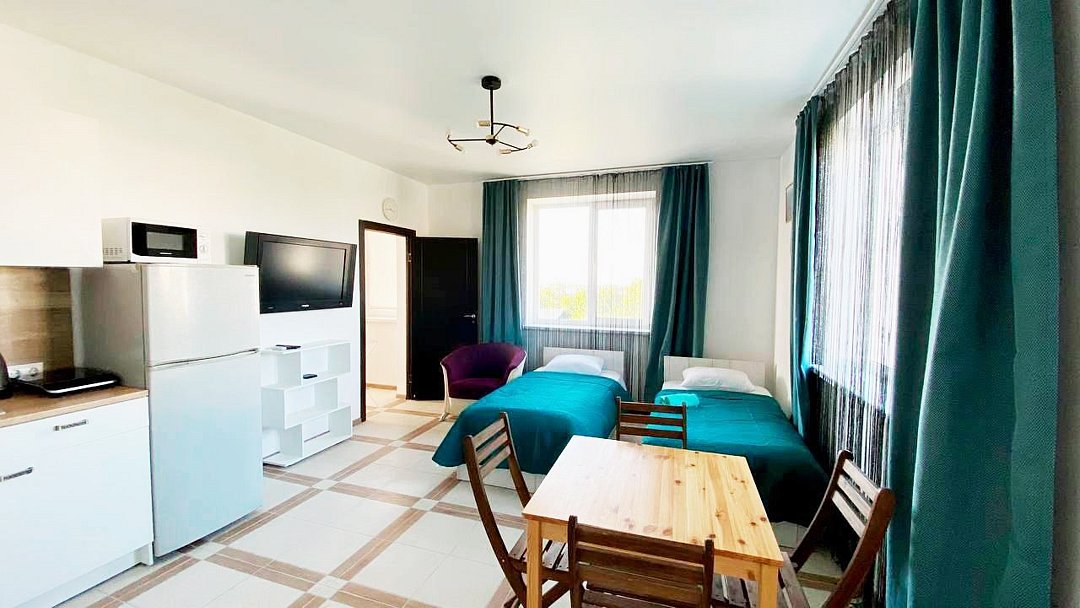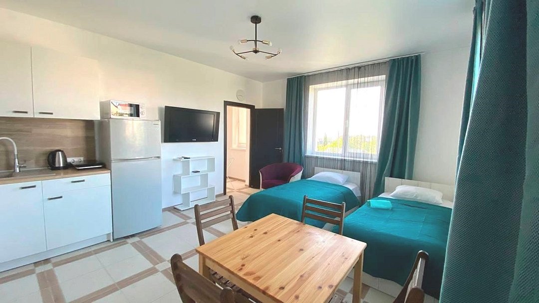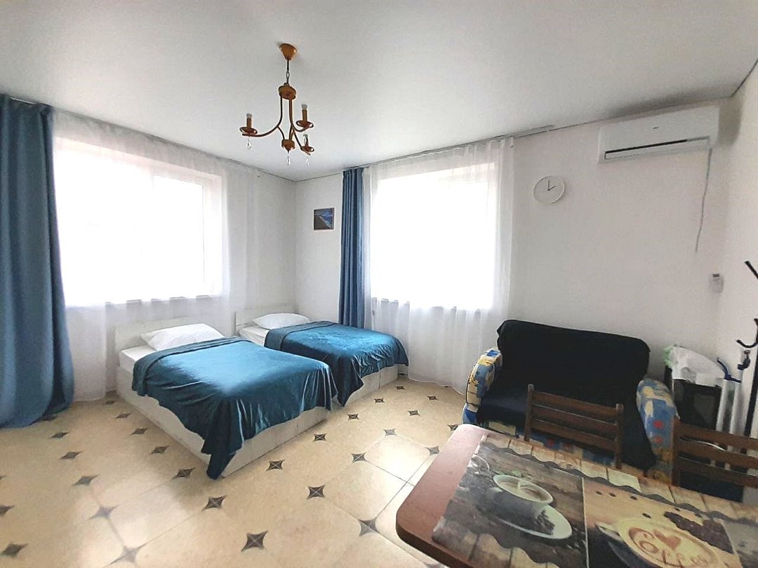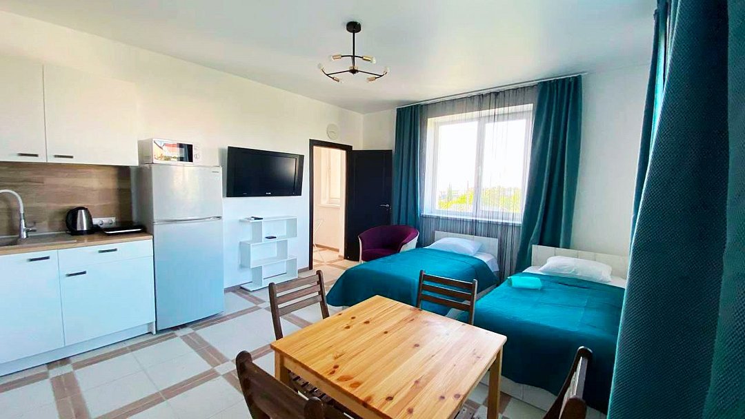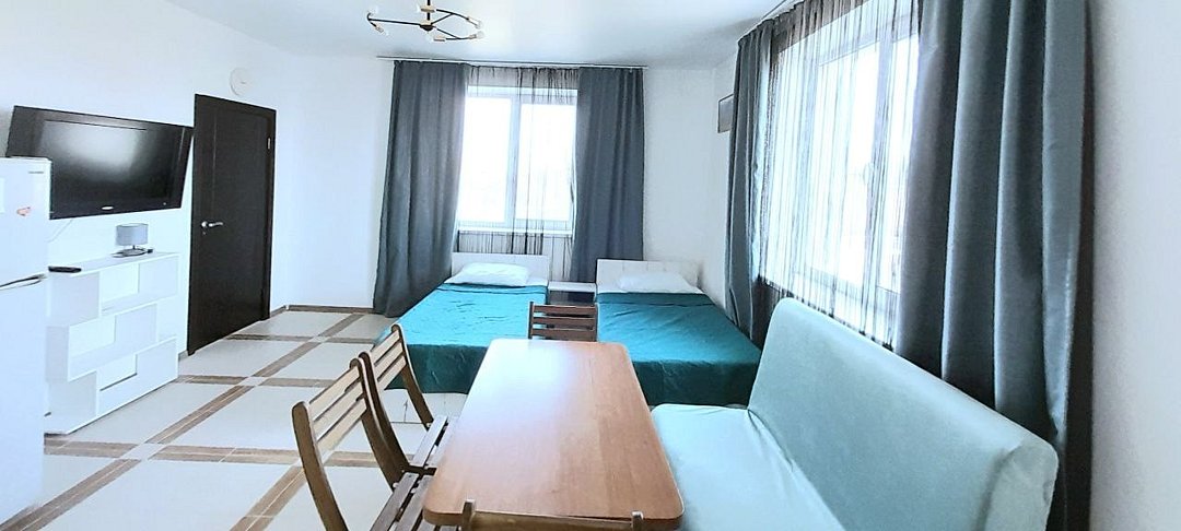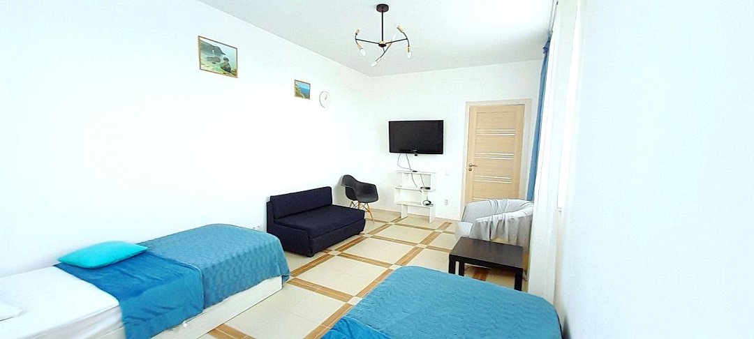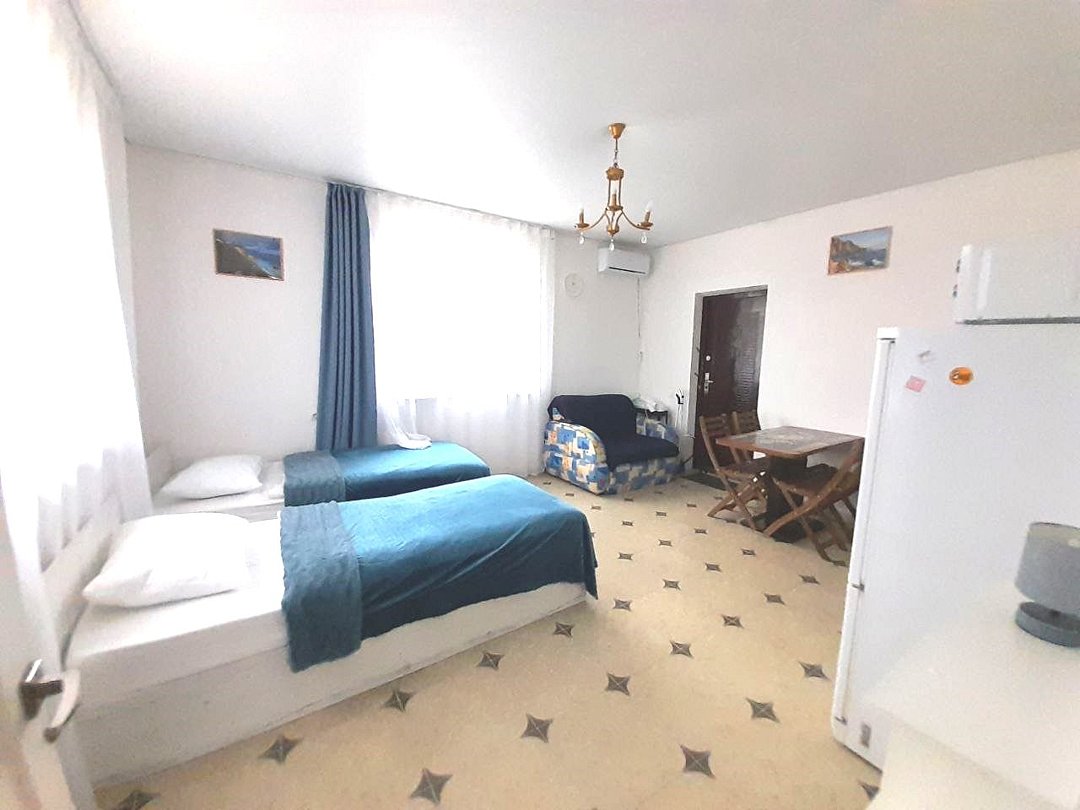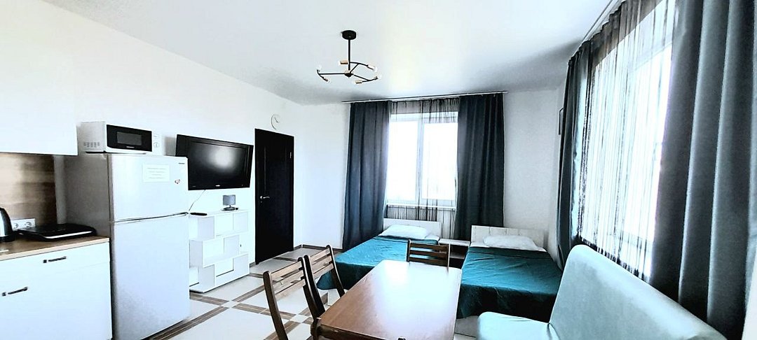 Двухкомнатный апартамент-студио оснащен кухонным уголком с возможностью самостоятельного приготовления пищи, вся необходимая посуда. Отдельный санузел с душем в апартаменте. Кровать двуспальная king-size и две односпальные кровати с ортопедическими матрасами, раскладной диван. Во внутреннем дворике имеется зона отдыха с гриль-мангалом, качелями, уголком для развлечения детей. Апартамент оформлен в современном стиле в соответствии с гипоаллергенными требованиями. Уборка с антисептиками.Услуги и удобства