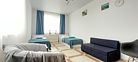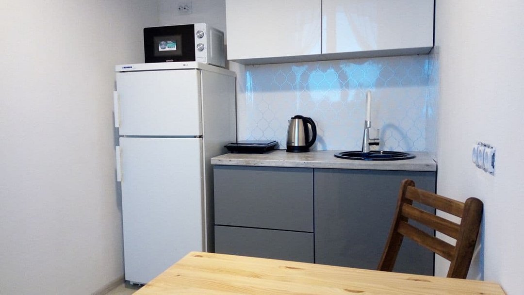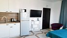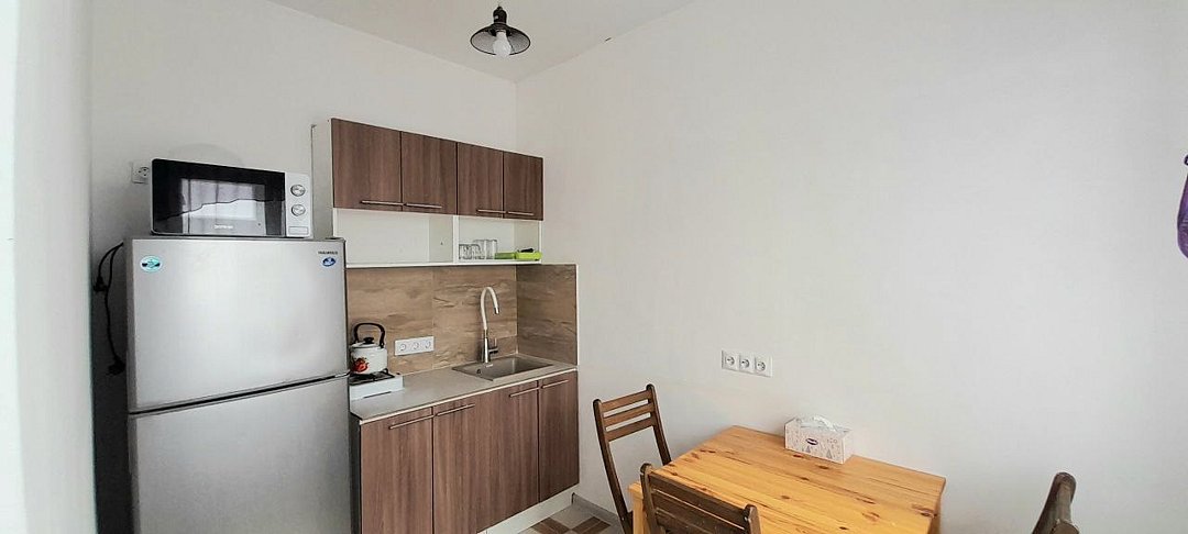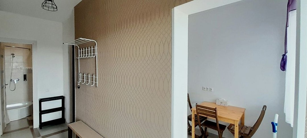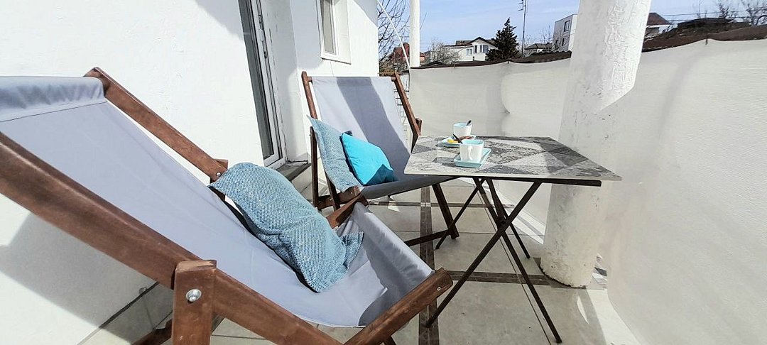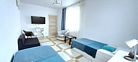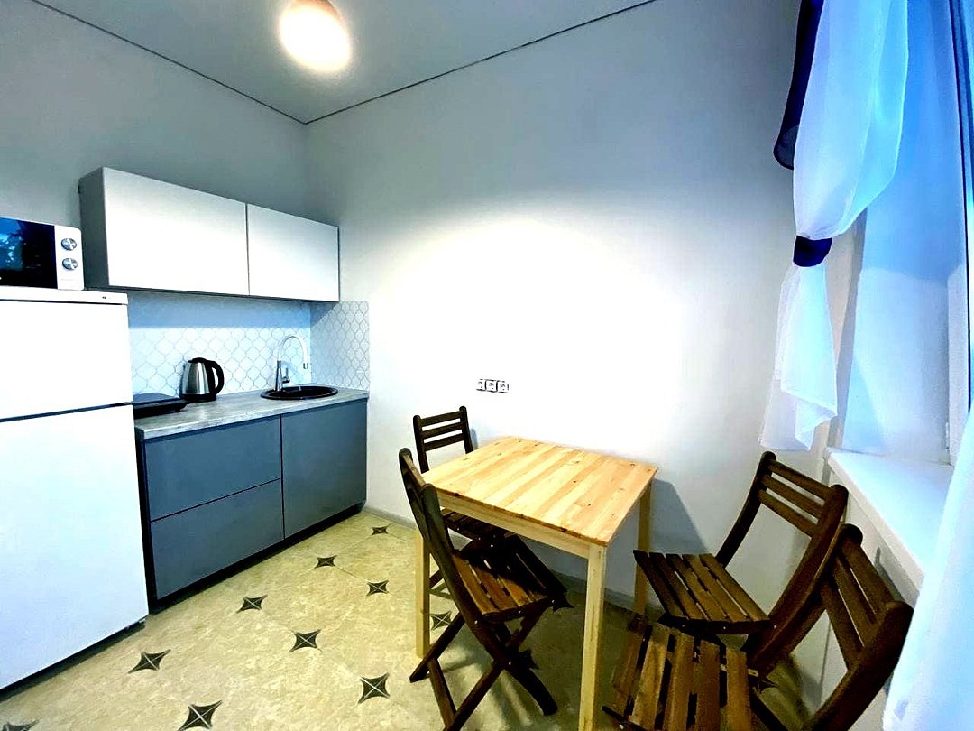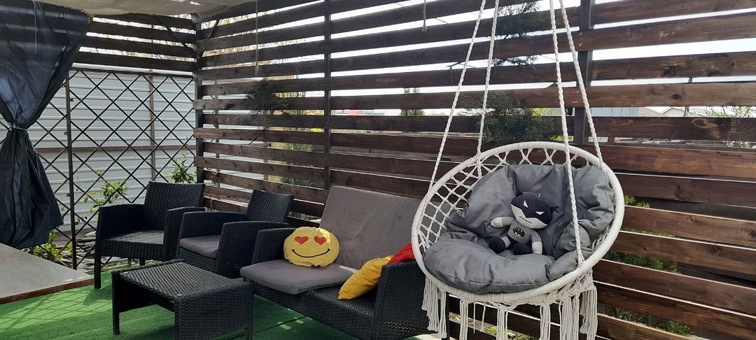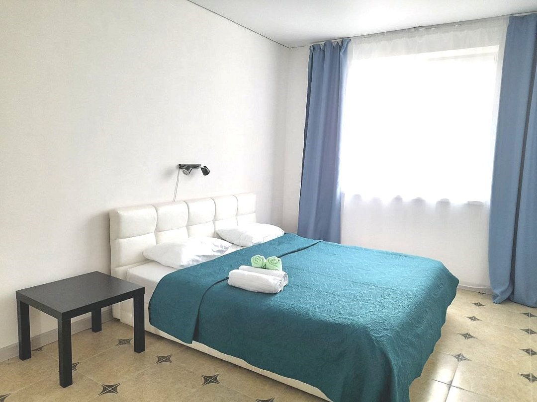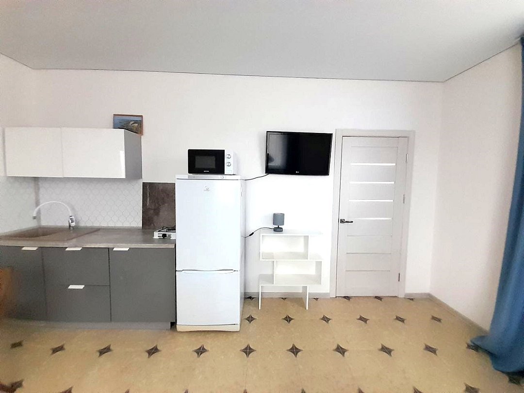Двухкомнатный апартамент-студио оснащен кухонным уголком с возможностью самостоятельного приготовления пищи, вся необходимая посуда. Отдельный санузел с душем в апартаменте. Кровать двуспальная king-size и две односпальные кровати с ортопедическими матрасами, раскладной диван. Во внутреннем дворике имеется зона отдыха с гриль-мангалом, качелями, уголком для развлечения детей. Апартамент оформлен в современном стиле в соответствии с гипоаллергенными требованиями. Уборка с антисептиками.Услуги и удобства