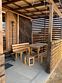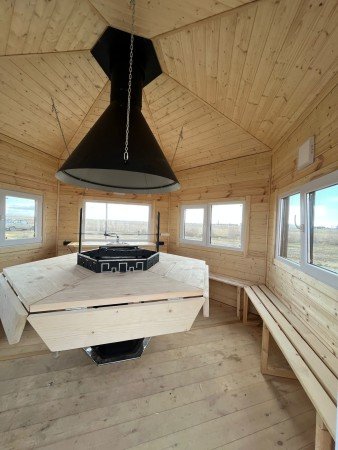 Гриль-дом выполнен из натурального дерева и обеспечивает тепло благодаря системе отопления. Он может вместить до 10 человек и оснащен микроволновой печью, газовой плитой и встроенной раковиной. Также есть возможность приобрести уголь и жидкость для розжига.