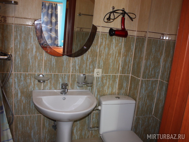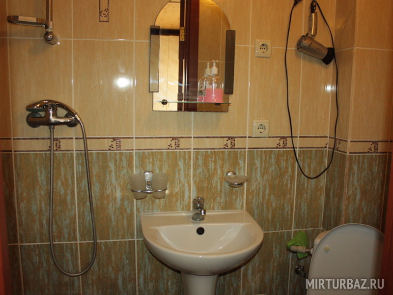 - Санузел: туалет и душевая кабинка, всегда горячая и холодная вода, раковина с зеркалом и шкафчиком, фен