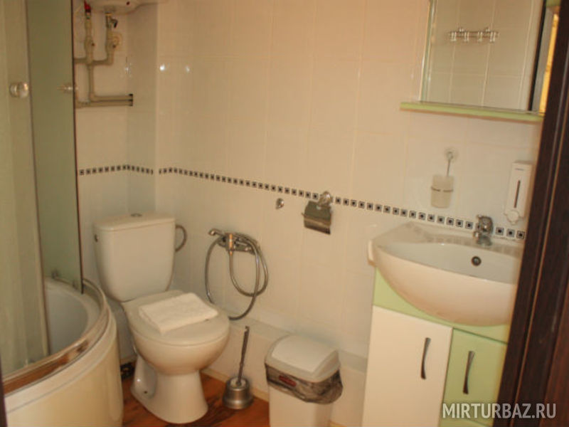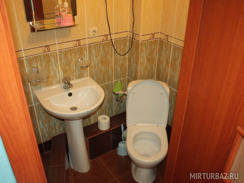 - Санузел: туалет и душевая кабинка, всегда горячая и холодная вода, раковина со шкафчиком, шкафчик с зеркалом