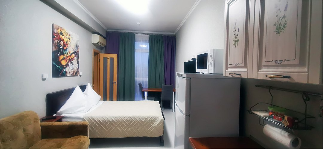 Номер находится на 8-м этаже. Панорамные окна этого номера позволят вам любоваться прекрасным видом на море и Парк Победы. Этот номер-студио с кондиционером, кабельным телевидением, холодильником, микроволновой печью и электрическим чайником. В ванной комнате с душем предоставляется фен. Из окон открывается живописный вид на город. Услуги и удобства: Красивый вид, Вид на море, Телевизор, Кабельные каналы, Сейф, Кондиционер, Утюг, Гладильные принадлежности, Ковровое покрытие, Диван, Гардероб, Душ, Фен, Туалет, Ванная комната, Холодильник, Микроволновая печь, Электрический чайник, Полотенца, Белье, Для доступа к верхним этажам работает лифт Бесплатный Wi-Fi во всех номерах.Услуги и удобства