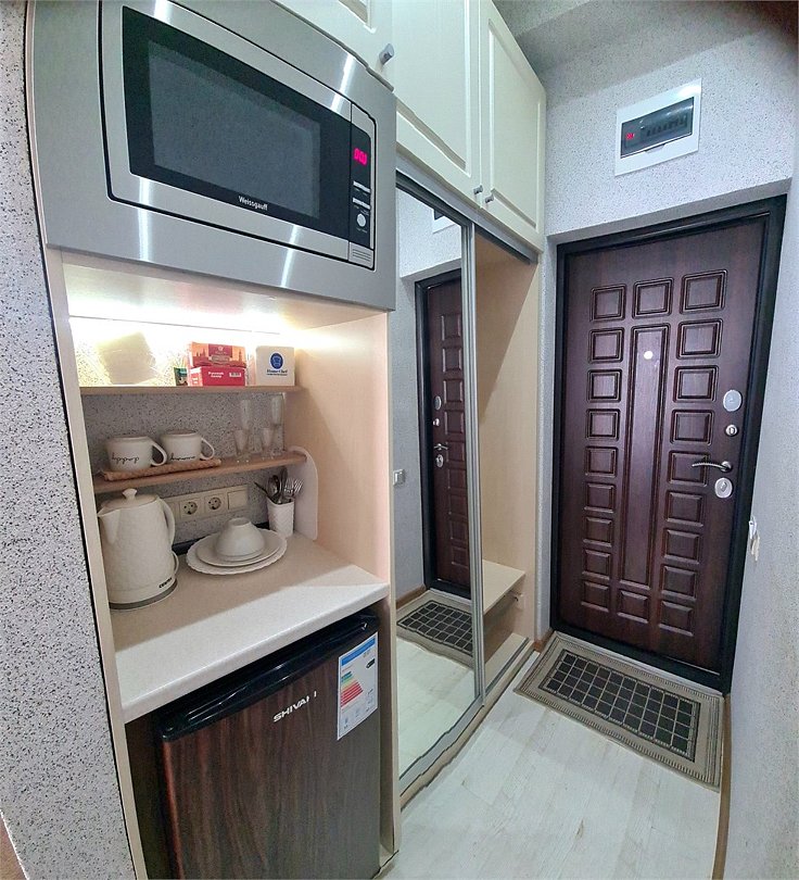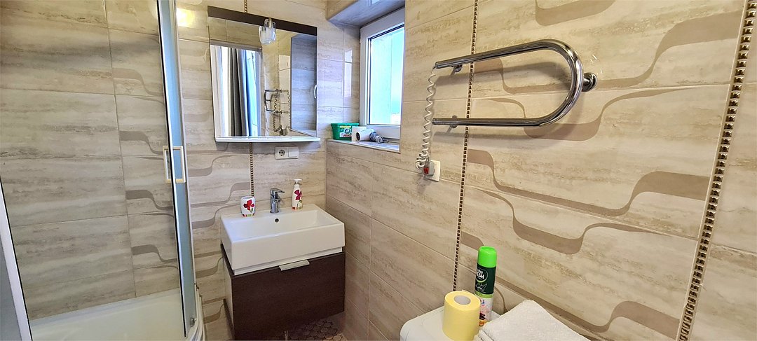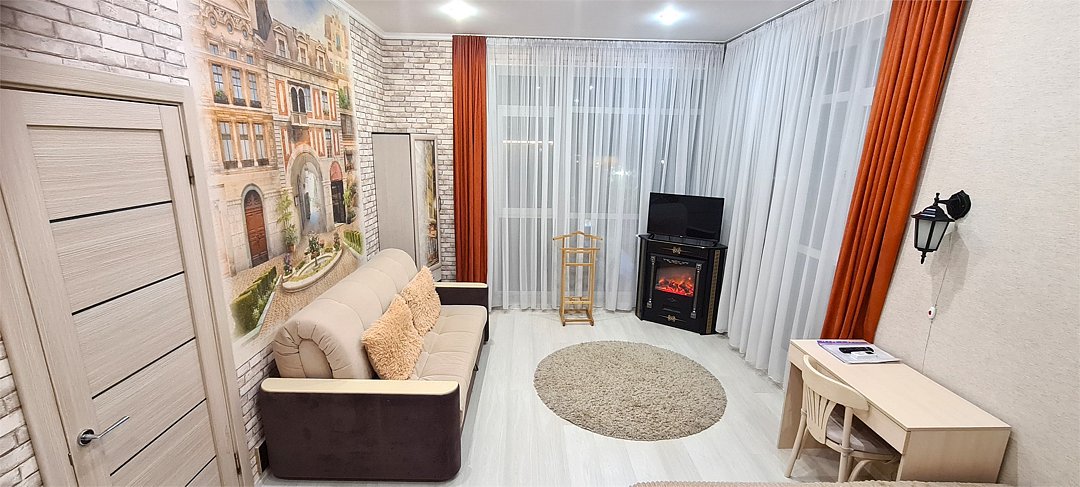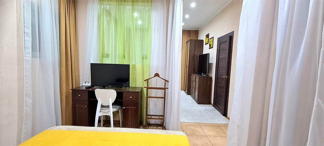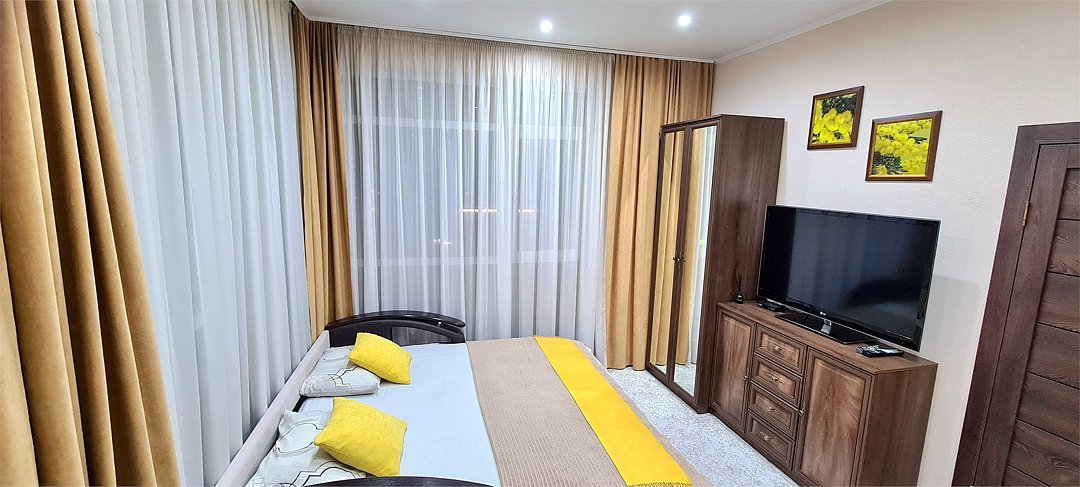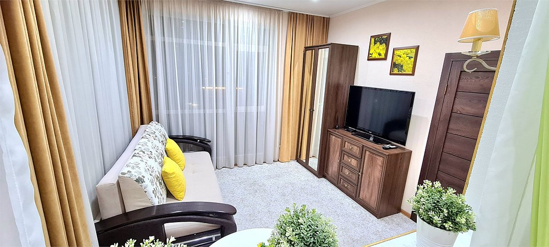 Номер комфорт "Семейная гавань" общей пл. 34 кв.м с панорамными окнами на город расположен на 6-м этаже. В номере две зоны отдыха спальня + гостиная ВМЕСТИМОСТЬ номера до 5-ти- человек. - основное спальное место кровать 160*200 и доп. спальное место большой диван. Раскладывается на два положения. В НОМЕРЕ ДЛЯ УДОБСТВА : два плоских телевизора, небольшая мини-кухня с микроволновкой и посудой, а также имеется эл. чайник, холодильник, чашки, тарелки, разделочная доска, столовые приборы, имеются бокалы рюмки , стаканы, фужеры, штопор, моющие средства, салфетки, бумажное полотенце. ЗОНА ГОСТИНОЙ : шкаф для одежды, комод с выдвижными ящиками , ЖК телевизором + цифровое тв, обеденный стол со стульями, холодильник, большой раскладывающийся диван и кондиционер, WI-FI ЗОНА СПАЛЬНИ: двуспальная кровать, телевизор, две прикроватные тумбочки, стойка для одежды, сушилка для белья и небольшое окно. СОБСТВЕННАЯ ВАННАЯ КОМНАТА с душевой кабиной + зеркало с подсветкой и умывальник с тумбочкой, прилагаются полотенца для лица, для бани и для ног, шампунь, жидкое мыло, фен, ватные диски, туалетная бумага + запасной рулон, освежитель воздуха, водонагреватель на 80 л., настенный шкафчик. Кому необходимо постирать вещи за доп. оплату могут воспользоваться услугой стиральной машинки ( капсулы прилагаются) В прихожей шкаф- купе с зеркалом и вешалками + комод для белья и обуви. Одноразовые тапочки Всегда поддерживается ремонт, чистота и уют , как домаУслуги и удобства