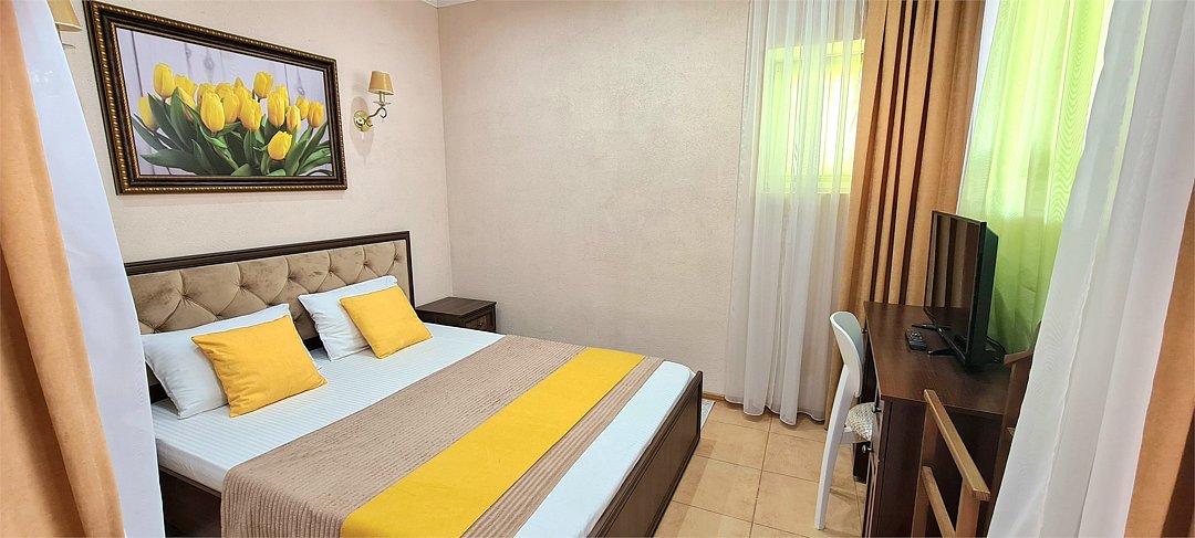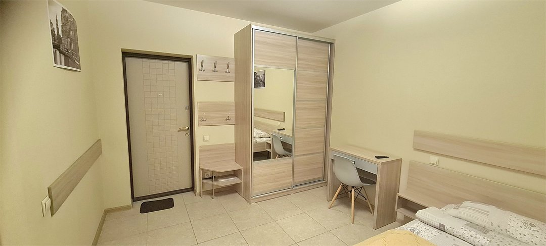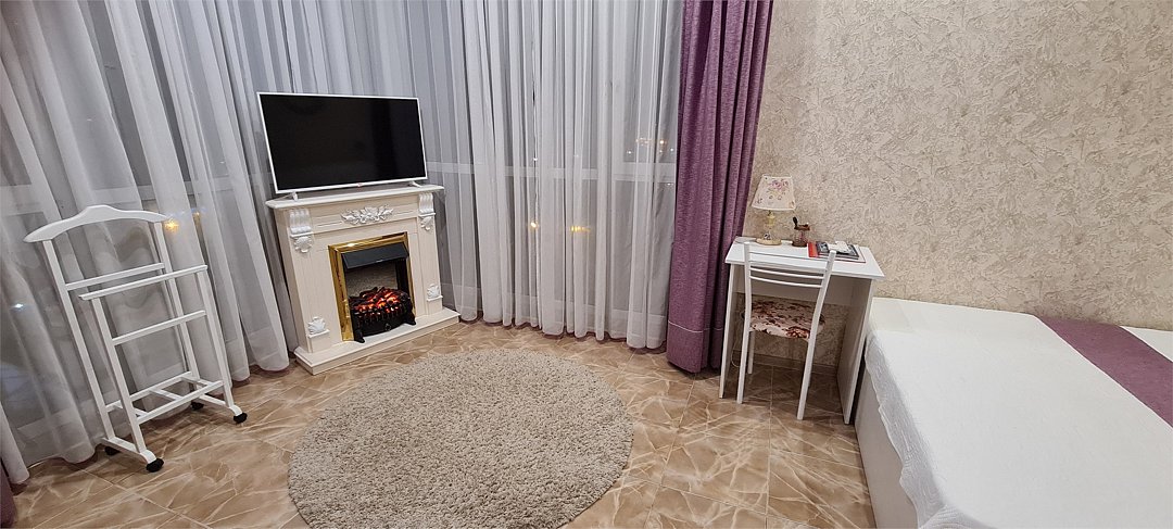 Номер "Стандарт- Фиолетовый" рассчитан на одного-двух человек. Общ. пл. номера 20 кв. м СПАЛЬНОЕ МЕСТО одна двуспальная кровать 160*200 ОСНАЩЕНИЕ : мини-кухня, эл. чайник, холодильник, микроволновка, столовые приборы, кондиционер, Смарт ТВ, письменный стол и стул, шкаф купе зеркальный для одежды. В ВАННОЙ КОМНАТЕ : фен, полотенца, шампунь, жидкое мыло, т. бумага, освежитель воздуха и туалетная бумага. В прихожей есть шкаф для одежды, зеркало, гладильная доска и утюг. - тапочки - WI-FIУслуги и удобства