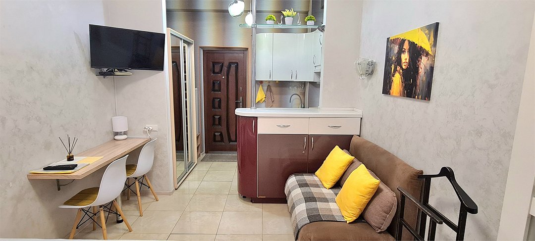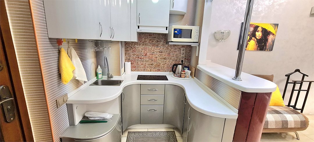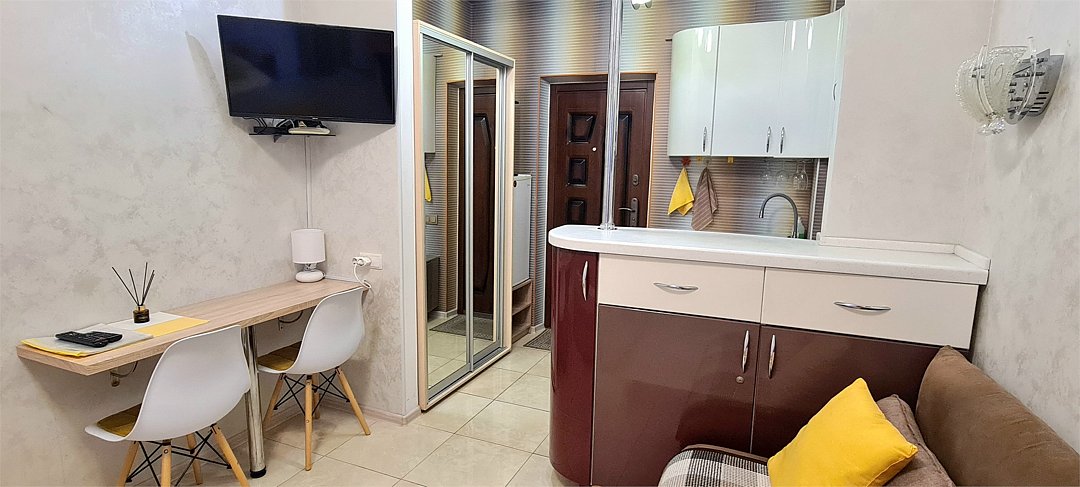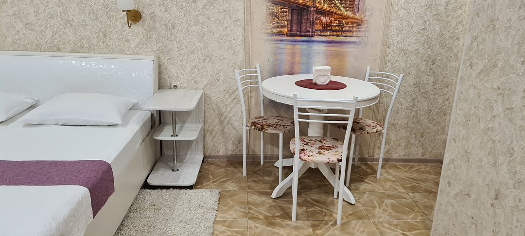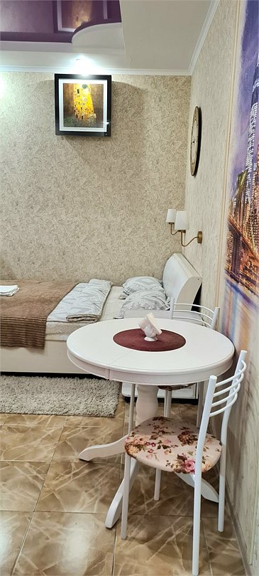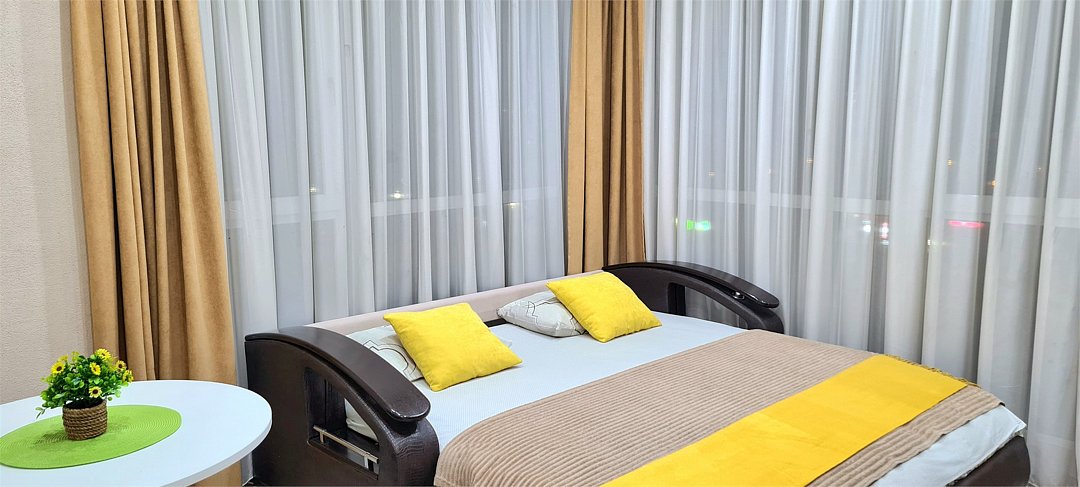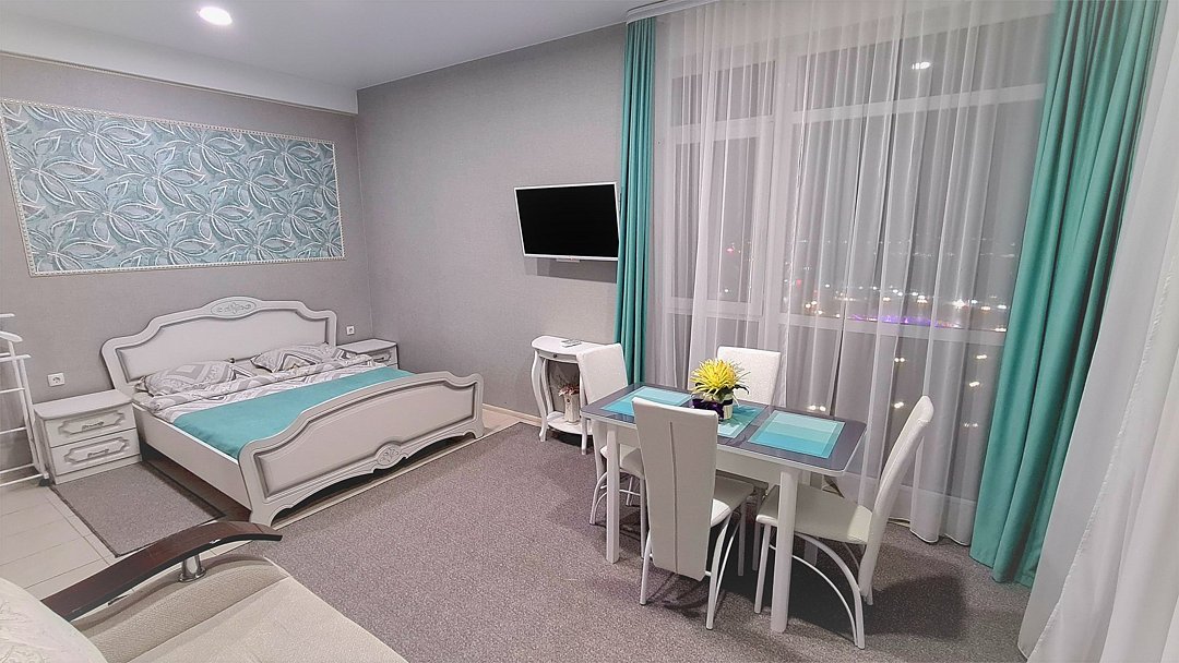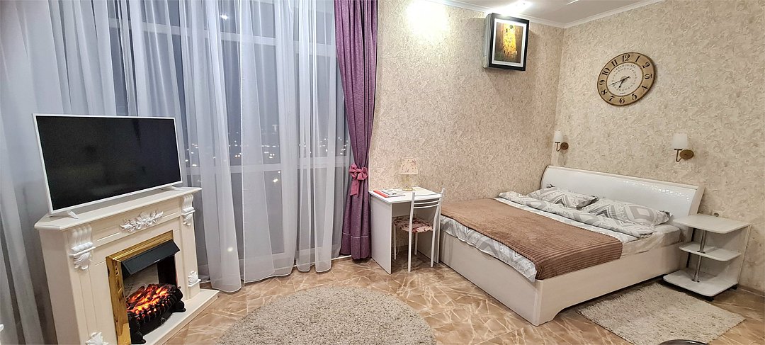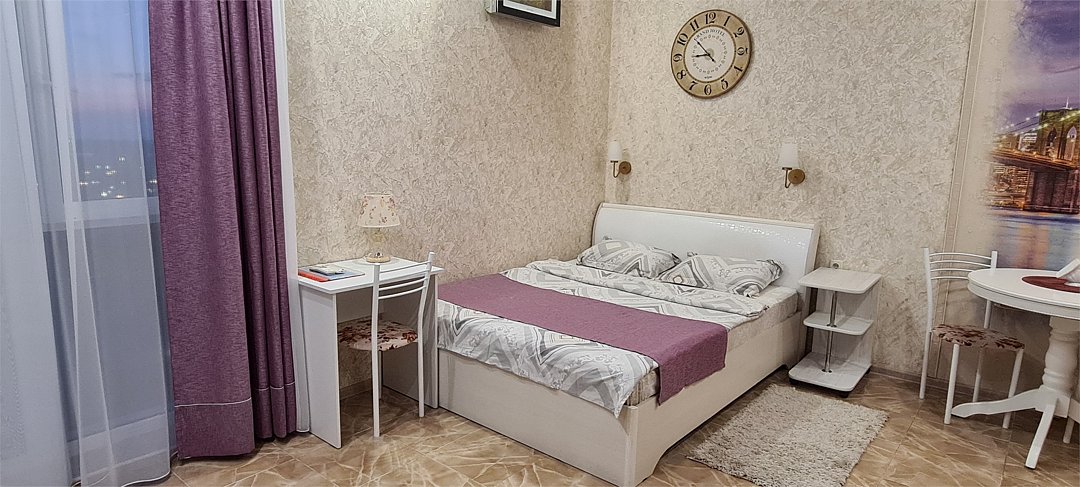 Студия с мини-кухней с двуспальной кроватью с панорамными окнами с видом на город расположена на 7м этаже СПАЛЬНЫЕ МЕСТА одна двуспальная кровать . КУХОННОЙ ЗОНЕ : чашки, тарелки, столовые приборы, холодильник, микроволновка, эл. чайник, фужеры, бокалы и есть эл.плита В КОМНАТЕ ДЛЯ УДОБСТВА: стойка для одежды, прикроватный столик на колесиках, рабочий стол и стулья, кондиционер, ЖК-телевизор, диванчик, WI-FI В ВАННОЙ КОМНАТЕ для гостей : жидкое мыло, шампунь, туалетная бумага, освежитель воздуха, ватные диски, фен, полотенца для бани для лица и для ног, сушилка для белья. и стиральная машинка. В прихожей шкаф купе с зеркалами и одноразовые тапочки Всегда поддерживается ремонт, чистота и уют, как дома.Услуги и удобства
