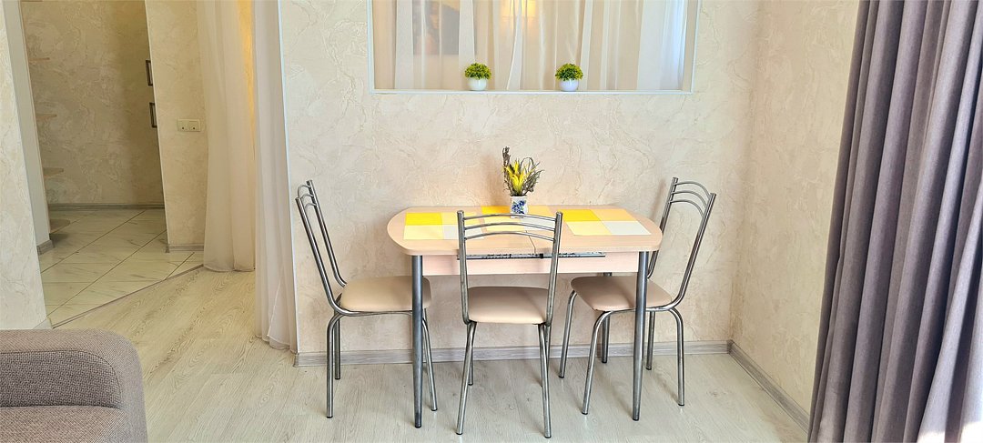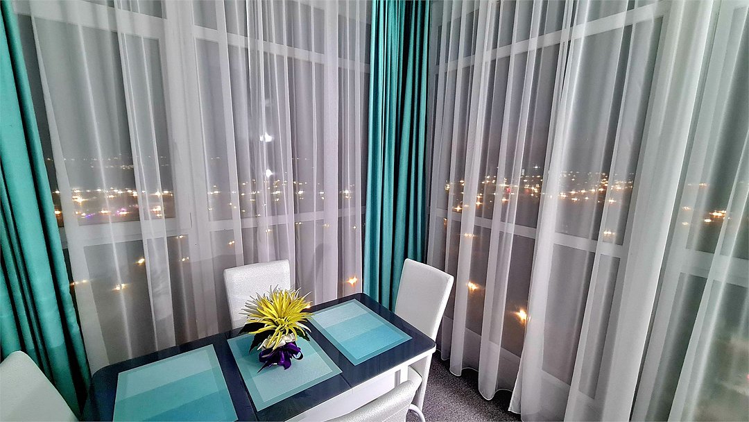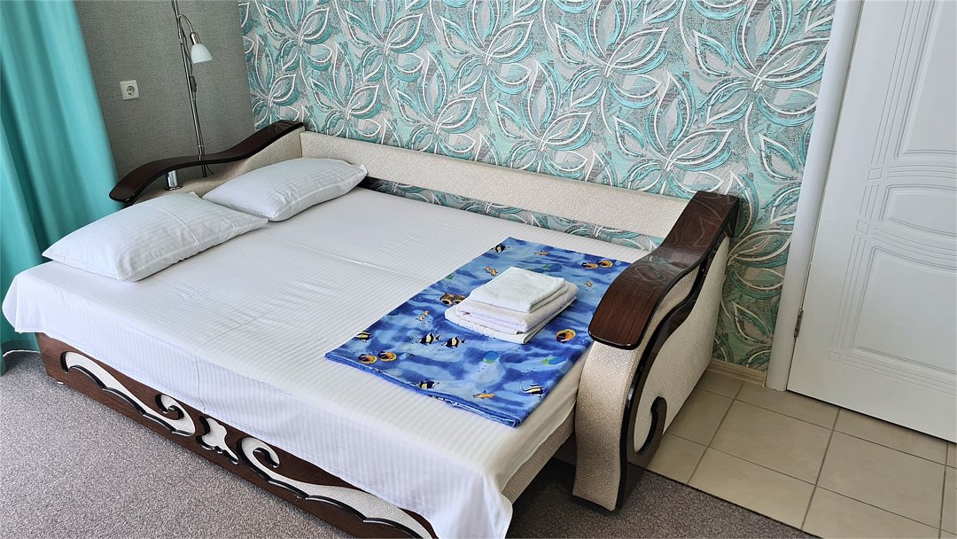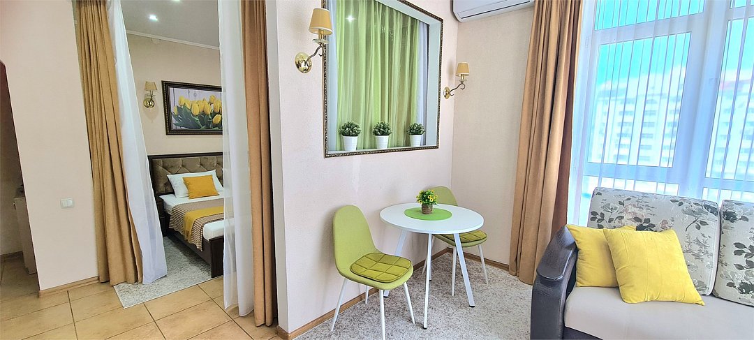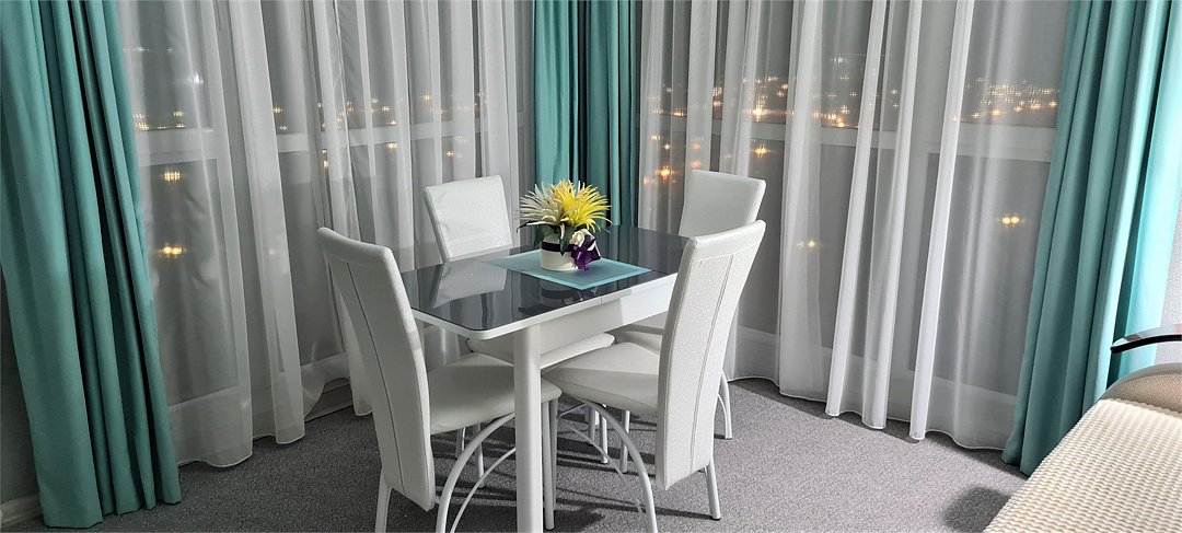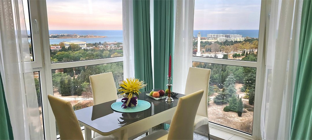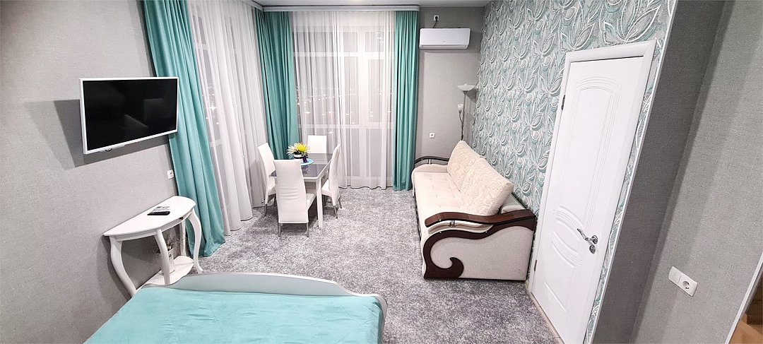 Номер "Бирюзовые лилии" расположен на 9 -м этаже с панорамными окнами и с потрясающим видом на море и Парк Победы. Общая площадь номера 32 кв. м. Максимальная вместимость номера до 4-х человек. Основное сп. место кровать 160*200 с ортопедическим матрасом. и доп. сп. место диван-кровать 160*200. ОСНАЩЕНИЕ КУХНИ : кухня с мойкой, холодильник, микроволновка, посуда , тостер, эл. чайник , заварной чайник, чашки, тарелки, разделочная доска, столовые приборы, бокалы, рюмки , стаканы, фужеры ,штопор, моющие средства, салфетки, бумажное полотенце , сахар, чай. В КОМНАТЕ для удобства : кондиционер, кровать с прикроватными тумбочками раскладной диван, жк телевизором + цифровое тв, стойка для одежды , обеденный стол и стулья, торшер и туалетный столик, WI-FI ВАННАЯ КОМНАТА : душевая кабина с тропическим душем , водонагреватель на 80 л, полотенца для лица , для бани и для ног. шампунь, жидкое мыло, стиральный порошок ( стиральная машинка дополнительная услуга) фен, ватные диски, туалетная бумага + запасной рулон ,освежитель воздуха, сушилка для вещей. В прихожей большой шкаф с вешалками и полками для одежды , гладильная доска и утюг. В шкафу пледы, одеяла, подушки, одноразовые тапочки Всегда поддерживается ремонт, чистота и уют, как дома.Услуги и удобства