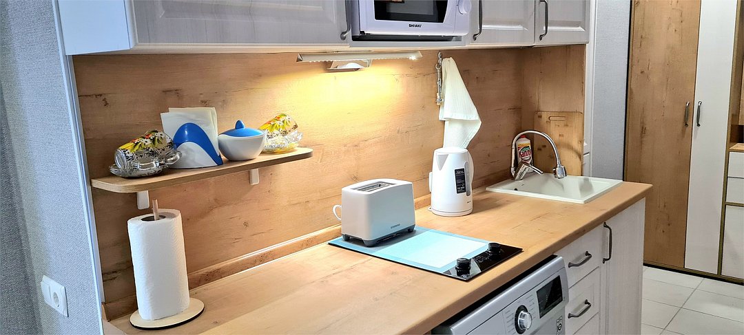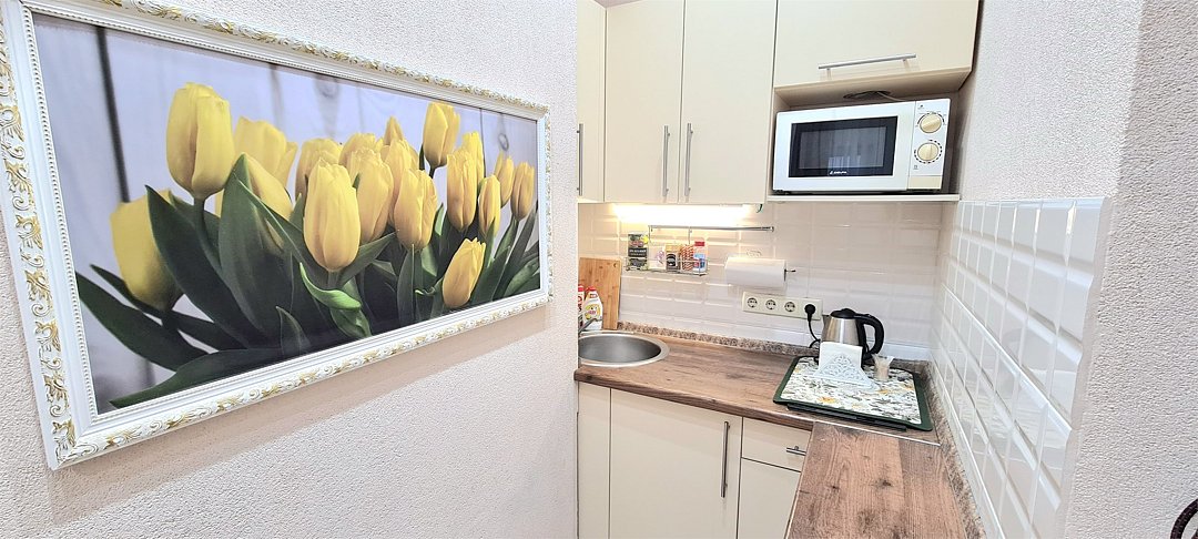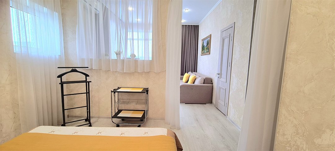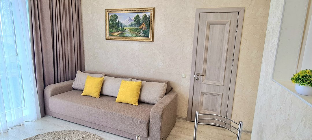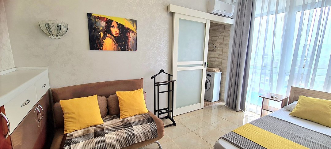 Двухместный уютный номер с балконом с видом на море и Парк Победы Номер для одного или двух человек. СПАЛЬНЫЕ МЕСТА одна двуспальная кровать 160*200 ДЛЯ УДОБСТВА В НОМЕРЕ ИМЕЕТСЯ: мини-кухня с мойкой, чашки, тарелки, микроволновка, холодильник, эл. чайник, кондиционер, утюг, гладильная доска, стол и два стула, прикроватная тумбочка с настольной лампой, плоский телевизор на стене на против кровати и WI-FI. СОБСТВЕНАЯ ВАННАЯ КОМНАТА с душевой кабиной с умывальником, зеркалом и унитазом. Дополнительно к услугам гостей можно воспользоваться стиральной машинкой ( капсулы/порошок, кондиционер прилагаются). В номере для гостей есть: шампунь, гель для душа, жидкое мыло, полотенца, освежитель воздуха, т. бумага, фен. В ПРИХОЖЕЙ - шкаф для одежды с зеркалом + одноразовые тапочки, ложка для обуви.Услуги и удобства