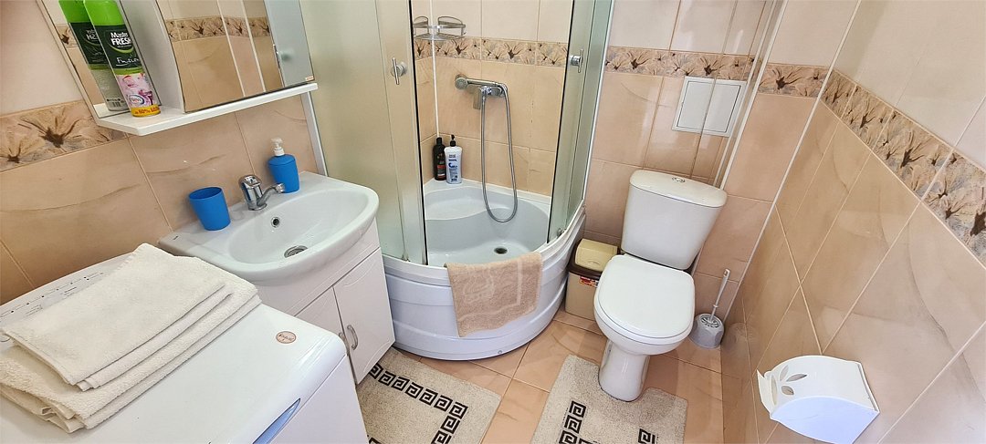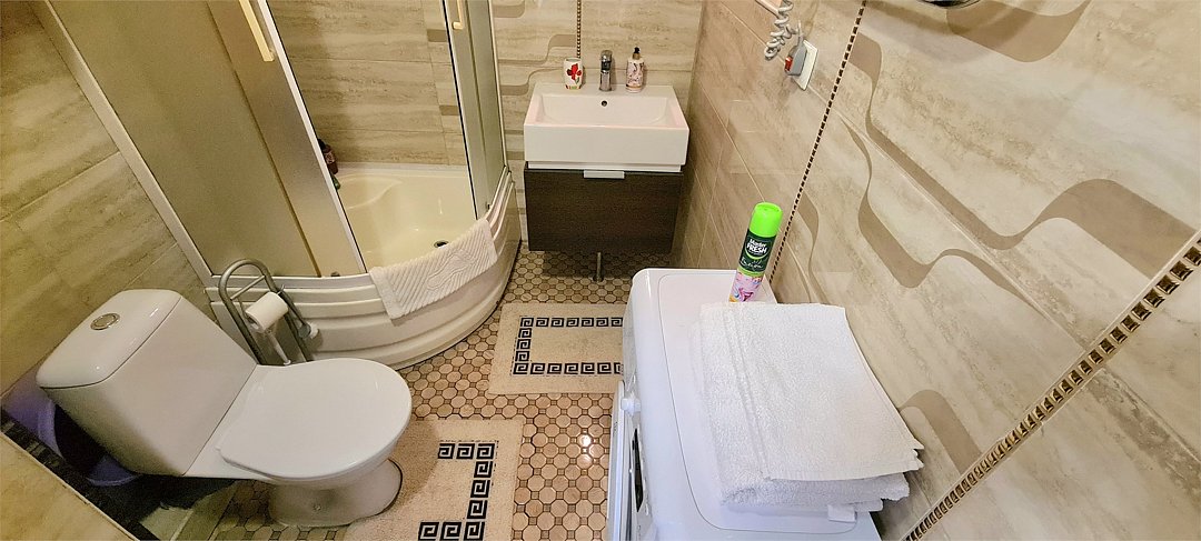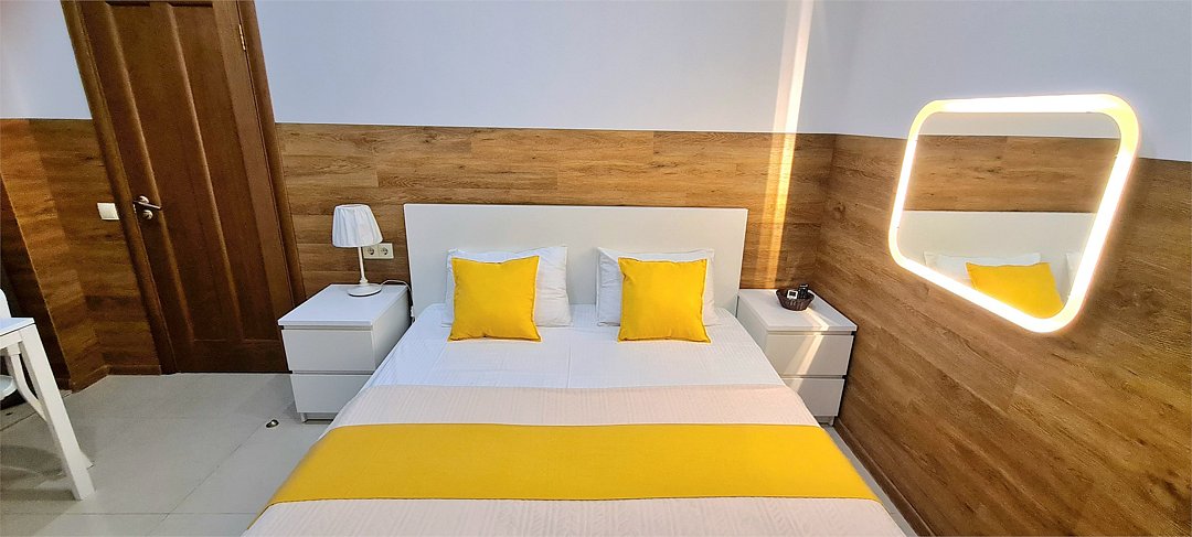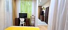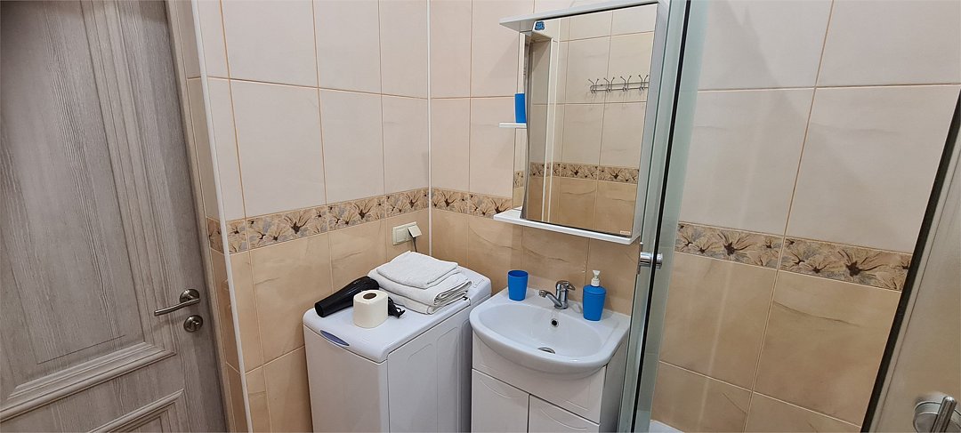 Номер "Семейный" с двумя зонами отдыха спальня + гостиная общей пл. 34 кв.м. рассчитан на 2-4 человека. Номер очень светлый, просторный с панорамными окнами. СПАЛЬНЫЕ МЕСТА в номере : - двуспальная кровать 160*200 (основное сп. место) - раскладной диван 160*200 (доп. сп. место) В КУХОННОМ УГОЛКЕ мини-кухня с мойкой и плитой., эл. чайник, разделочная доска, микроволновка, холодильник, чашки, тарелки. В номере есть большой обеденный стол и стулья. В СПАЛЬНЕ две прикроватные тумбочки, двуспальная кровать, столик на колесиках, стойка для одежды, окно. ДЛЯ КОМФОРТА: кондиционер, фен, утюг, гладильная доска, ЖК-телевизор, сушилка для белья, стиральная машинка, WI-FI ИМЕЕТСЯ СОБСТВЕННАЯ ВАННАЯ КОМНАТА + душевая кабина, умывальник с зеркалом, унитаз и стиральная машинка ПРЕДОСТАВЛЯЕМ ПРИ ЗАСЕЛЕНИИ: чай, сахар, бумажные полотенца, салфетки, гель для душа, шампунь, ватные диски, комплект полотенец . В прихожей шкаф купе с зеркалом и одноразовые тапочкиУслуги и удобства