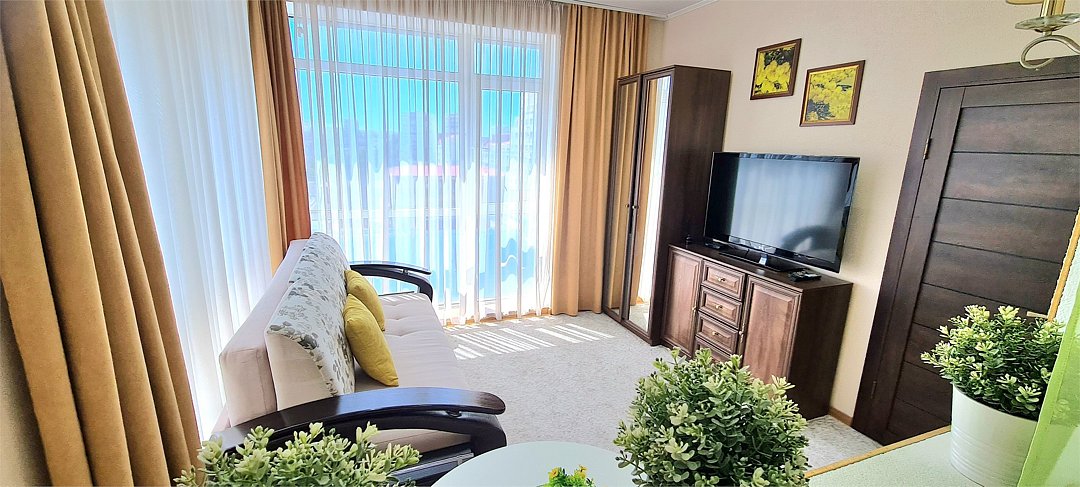 Номер с панорамными окнами в пол с видом на море и парк ( см. фото) Общ. пл. номера 30 кв.м. ВМЕСТИМОСТЬ номера до 3-х человек - основное спальное место кровать 160*200 и дополнительное спальное место диван с ортопедическим основанием 145*200 В НОМЕРЕ ДЛЯ УДОБСТВА ЕСТЬ: мини-кухня с мойкой и плитой, микроволновка, эл. чайник , холодильник, чашки, тарелки, разделочная доска, столовые приборы, бокалы , рюмки, стаканы, фужеры, штопор, моющие средства, салфетки, бумажное полотенце, чай, сахар, соль. СОБСТВЕНАЯ ВАННАЯ КОМНАТА с душевой кабиной с большим умывальником и зеркалом + унитаз. Стиральная машинка. В КОМНАТЕ стоит шкаф с полками для белья и с выдвижными ящиками, где лежать два пледа 200*220 и одеяла с подушками, письменный стол со стулом, прикроватная тумбочка с выдвижными ящиками, камин с жк телевизором, стойка для одежды , обеденный стол со стульями, кондиционер, WI-FI Для гостей предоставляем шампунь, гель для душа, жидкое мыло, полотенца, освежитель воздуха, т. бумага, фен. В ПРИХОЖЕЙ: шкаф для одежды с зеркалом и с вешалками , гладильная доска, утюг, ложка для обуви. Всегда поддерживается ремонт, свежесть, чистота и уют, как дома .Услуги и удобства