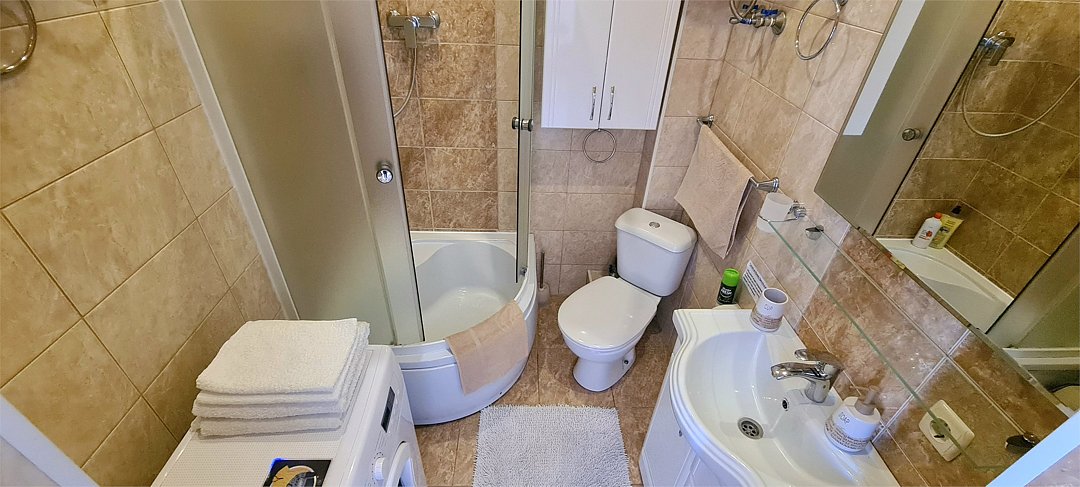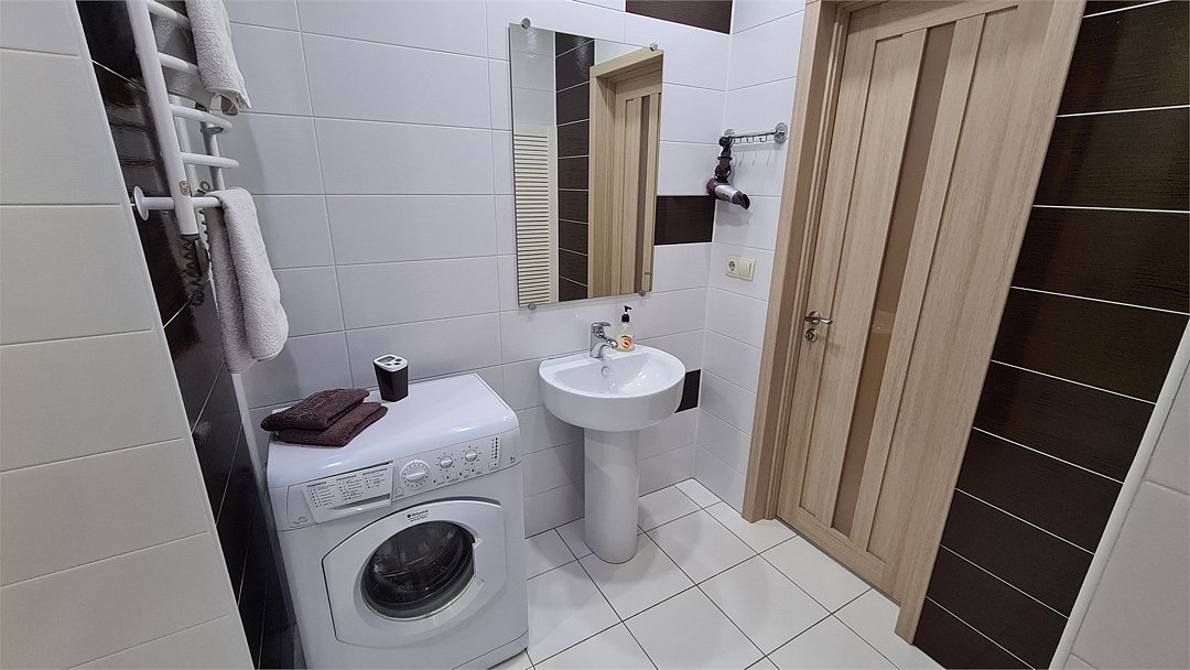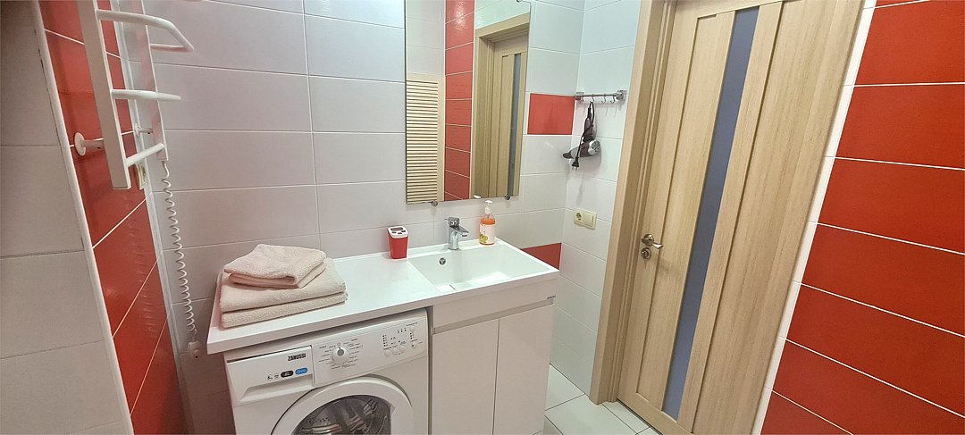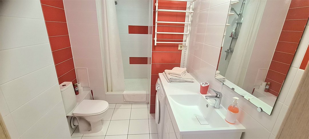 Wi-Fi, холодильник, кондиционер, фен, электронные замки, микроволновая печь, утюг, ванная комната, душевая кабина, банные полотенца, тапочки, гигиенические средства, двуспальная кровать, гладильная доска, стулья, вешалки, барная стойка, чайный набор, набор посуды, стиральная машина, чайник, унитаз, раковина, отопление, плиточное покрытие, стаканы, столовые приборы, сушилка для белья, мини-кухня, шкаф-купе, телевизор со Smart TV, рабочий стол, можно с питомцамиВ номере