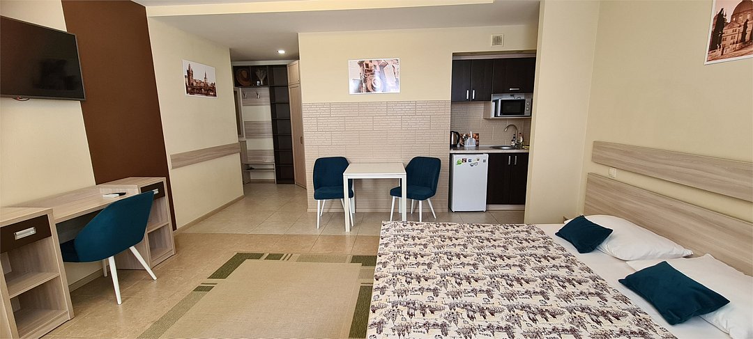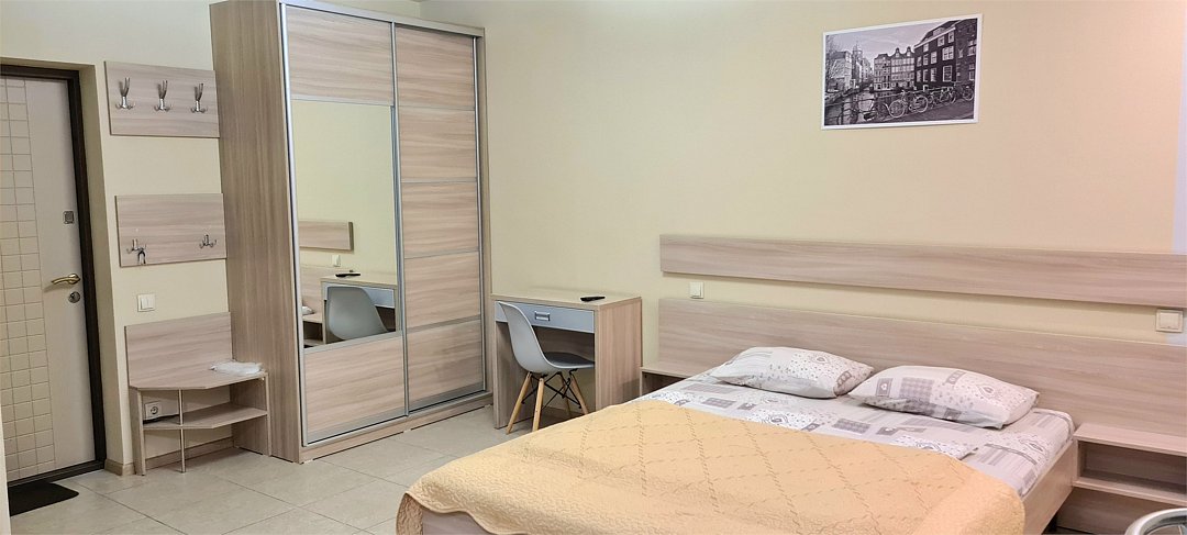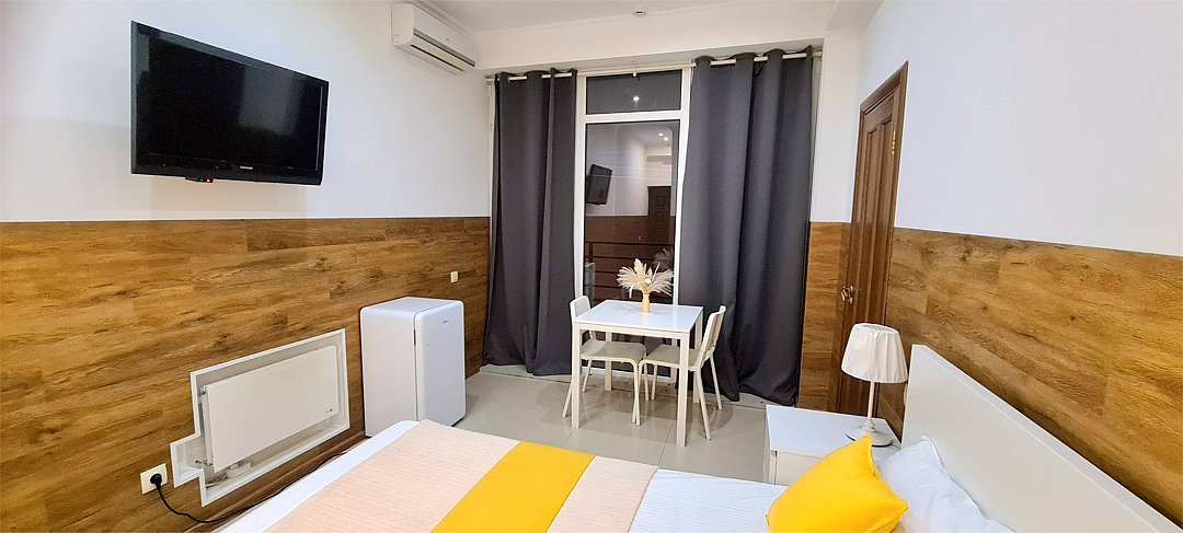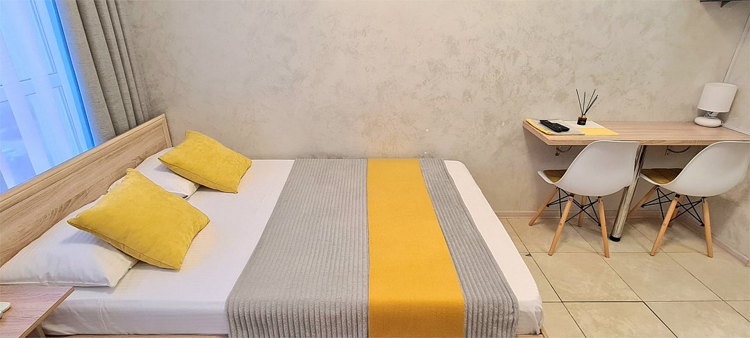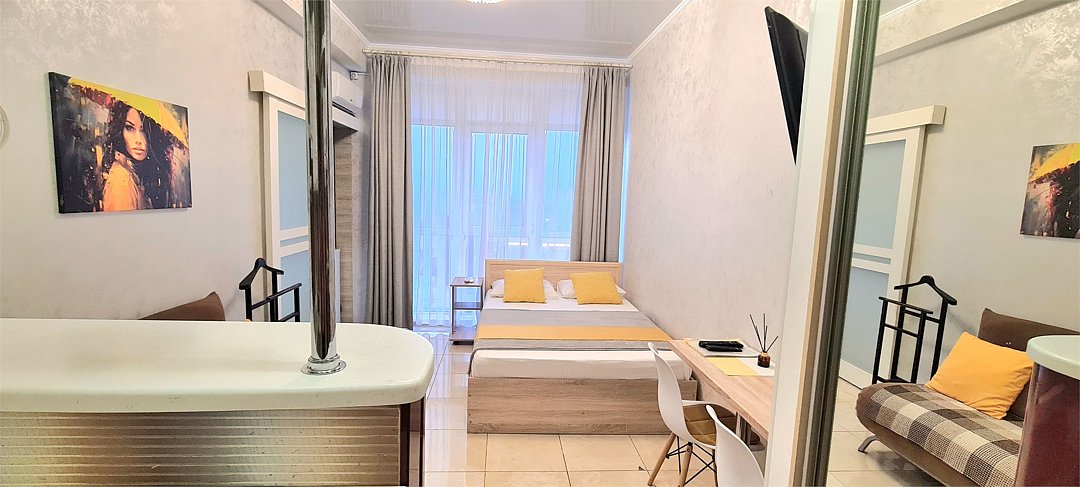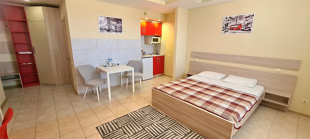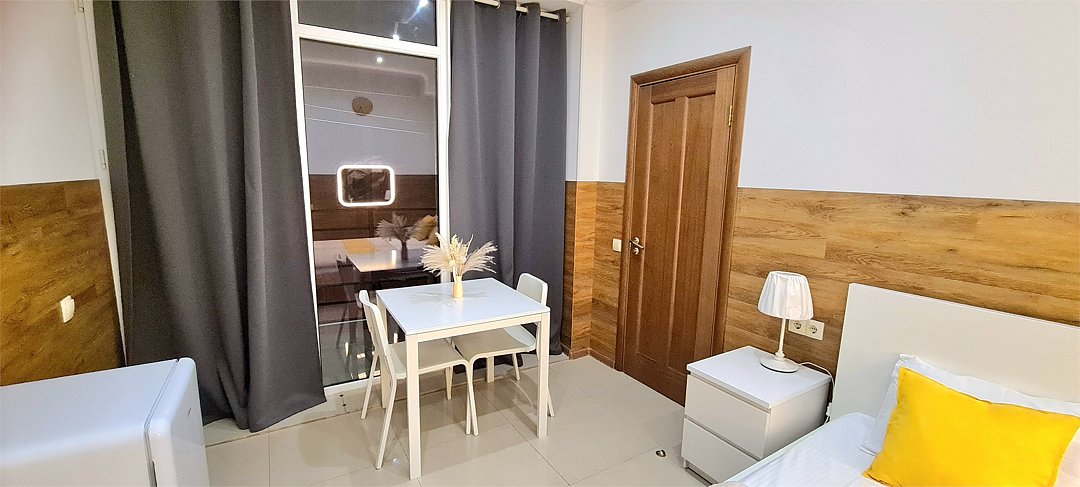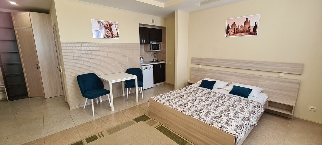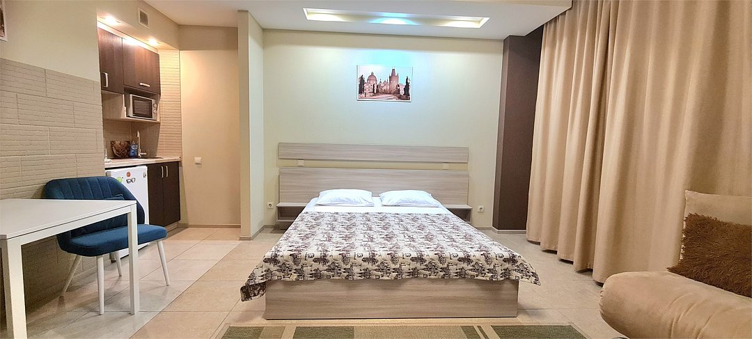 Двухместная студия с одной двуспальной кроватью 160*200 Балкон с красивым боковым видом на море и Парк Победы, где вы можете любоваться закатами. На балконе сушилка настенная , стол и два стула. ДЛЯ УДОБСТВА в номер есть : микроволновка, холодильник , эл. чайник, чашки, тарелки, бокалы, рюмки, комод для белья и шкаф с зеркалом для одежды с вешалками, гладильная доска и утюг. ИМЕЕТСЯ стол письменный. В ВАННОЙ КОМНАТЕ шампунь, гель для душа, фен, жидкое мыло, полотенца, стиральная машинка, душевая кабина. Одноразовые тапочки.Услуги и удобства