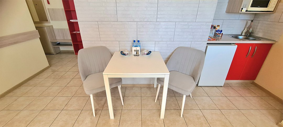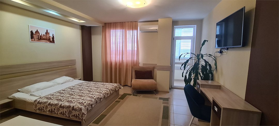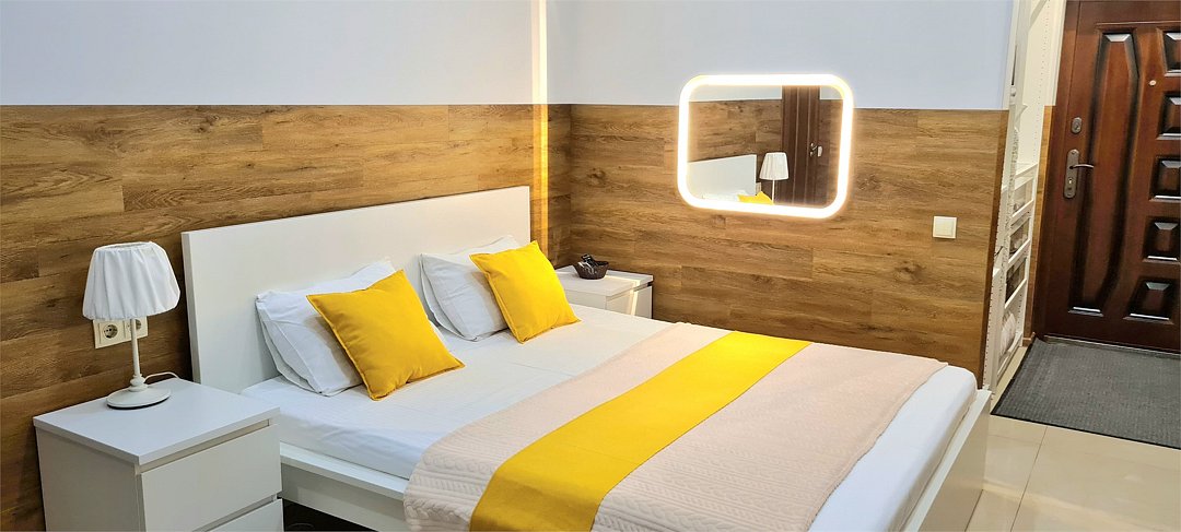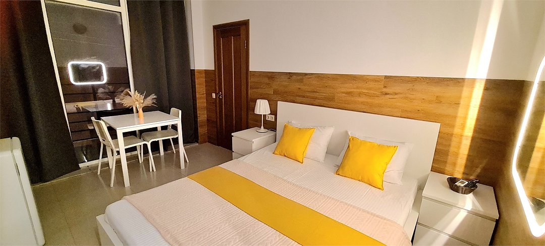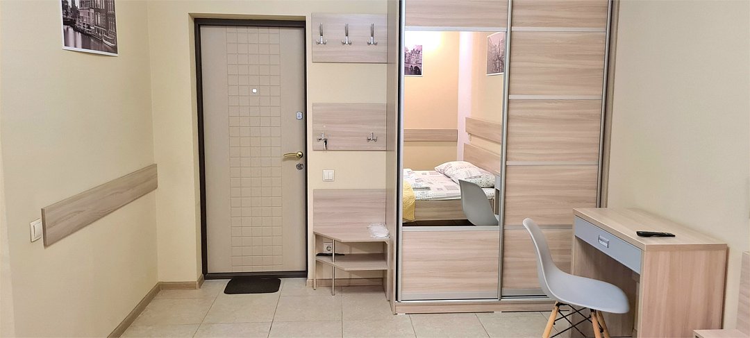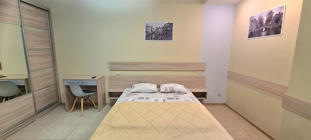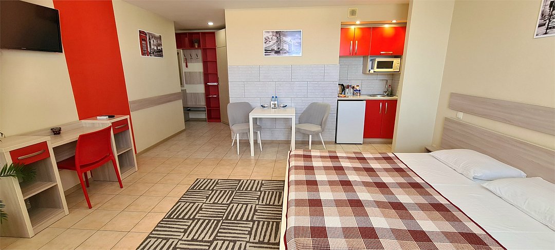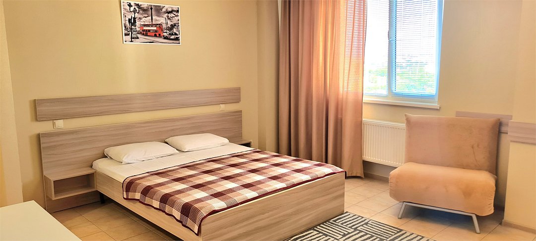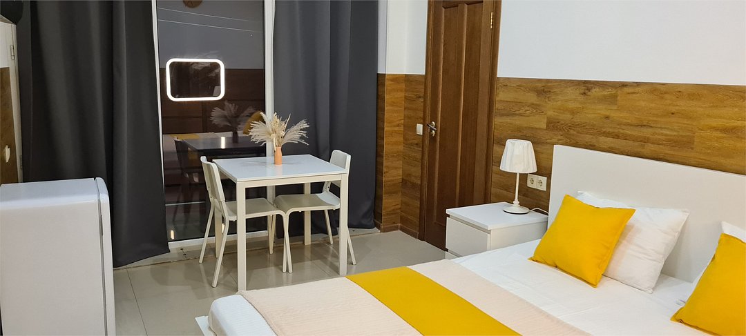 Двухместная студия с одной двуспальной кроватью 160*200 Балкон с красивым боковым видом на море и Парк Победы, где вы можете любоваться закатами. На балконе сушилка настенная , стол и два стула. ДЛЯ УДОБСТВА в номер есть : микроволновка, холодильник , эл. чайник, чашки, тарелки, бокалы, рюмки, комод для белья и шкаф с зеркалом для одежды с вешалками, гладильная доска и утюг. ИМЕЕТСЯ стол письменный. В ВАННОЙ КОМНАТЕ шампунь, гель для душа, фен, жидкое мыло, полотенца, стиральная машинка, душевая кабина. Одноразовые тапочки.Услуги и удобства