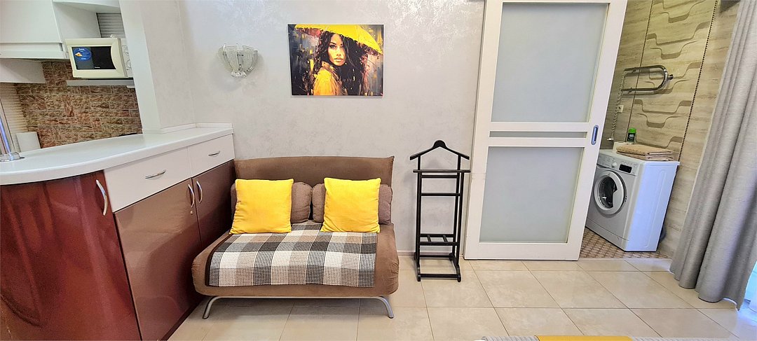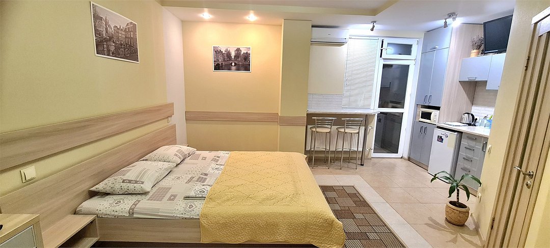 Студия с мини-кухней с двуспальной кроватью с диванчиком и с видом на город