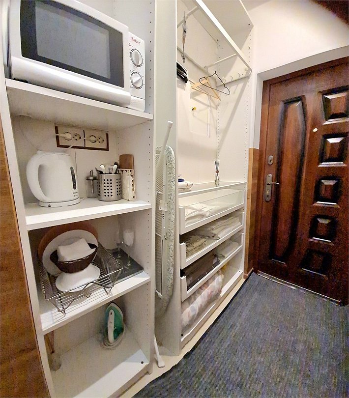 Wi-Fi, холодильник, кондиционер, фен, плита для приготовления пищи, микроволновая печь, утюг, ванная комната, душевая кабина, санузел, водонагреватель, банные полотенца, тапочки, двуспальная кровать, гладильная доска, диван, стулья, шкаф для одежды, вешалки, набор посуды, стиральная машина, чайник, вид на город, высокие потолки, столовые приборы, стол, туалетные средства, сушилка для белья, телевизор с плоским экраном, мини-кухня, кухонный уголок, рабочий стол, антибактериальное средство для рук, зеркало в полный рост, можно с питомцамиВ студии