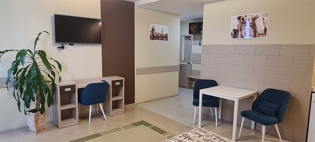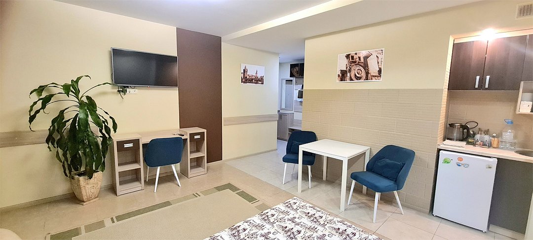 Номер "Superior Коричневый" просторный, светлый, уютный общей пл. 27 кв.м Вместимость номера до 3-х человек. СПАЛЬНЫЕ МЕСТА: - двуспальная кровать 160*200 основное сп. место - раскладное кресло 80*190 доп. сп. место В номере есть : мини-кухня, плитка для приготовления пищи, микроволновка, холодильник, посуда, эл. чайник, разделочная доска, бокалы, чашки. Обеденный стол и стулья. ЖК-телевизор, кондиционер, кресло. Предусмотрена рабочая зона. ВАННАЯ КОМНАТА: душевая, умывальник + зеркало, унитаз, стиральная машинка ,фен, полотенца, гель для душа, шампунь. В прихожей шкаф с зеркалом, гладильная доска, утюг, сейф. Предоставляем бесплатный WI-FI , одноразовые тапочки, чай, кофе, сахар, салфетки, бумажное полотенце.Услуги и удобства