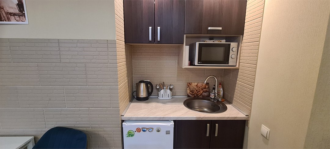 Номер " Коричневый" с двуспальной кроватью, креслом и мини-кухней