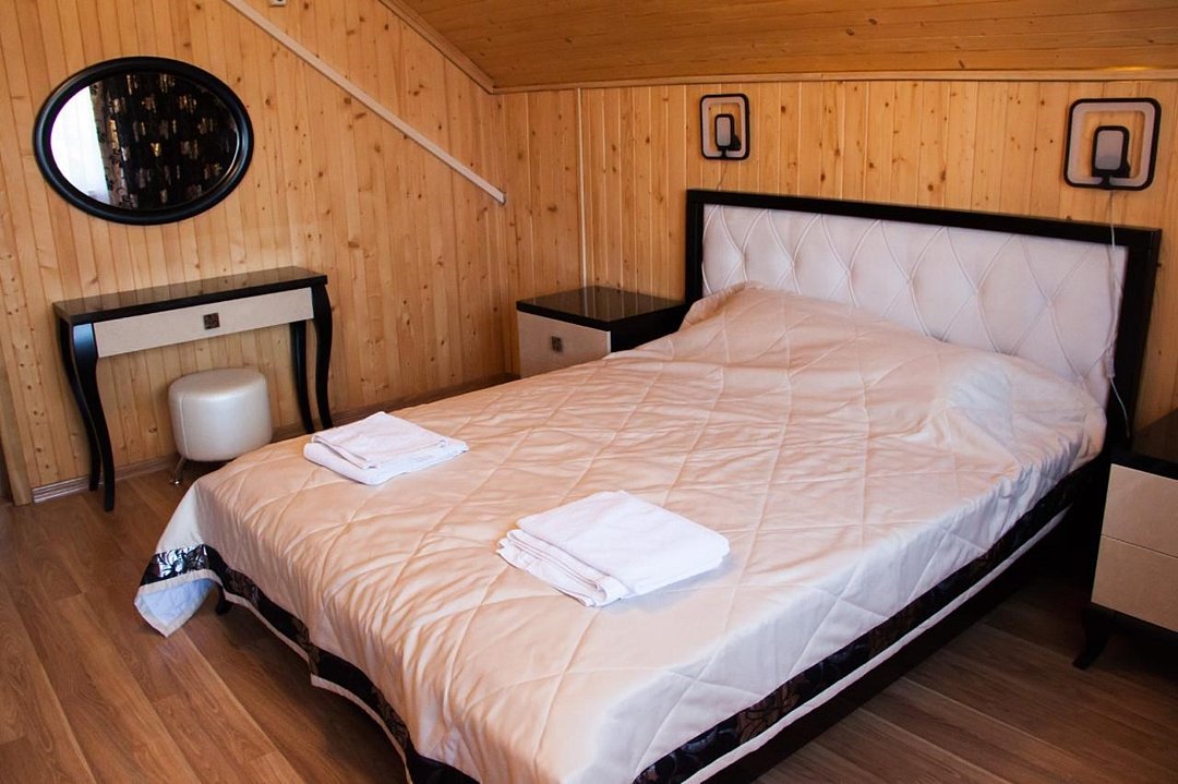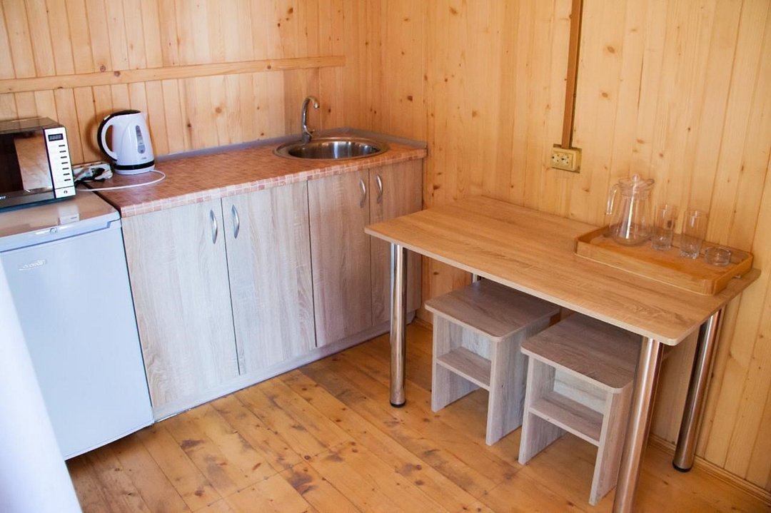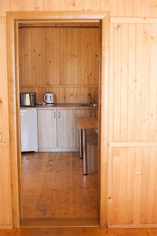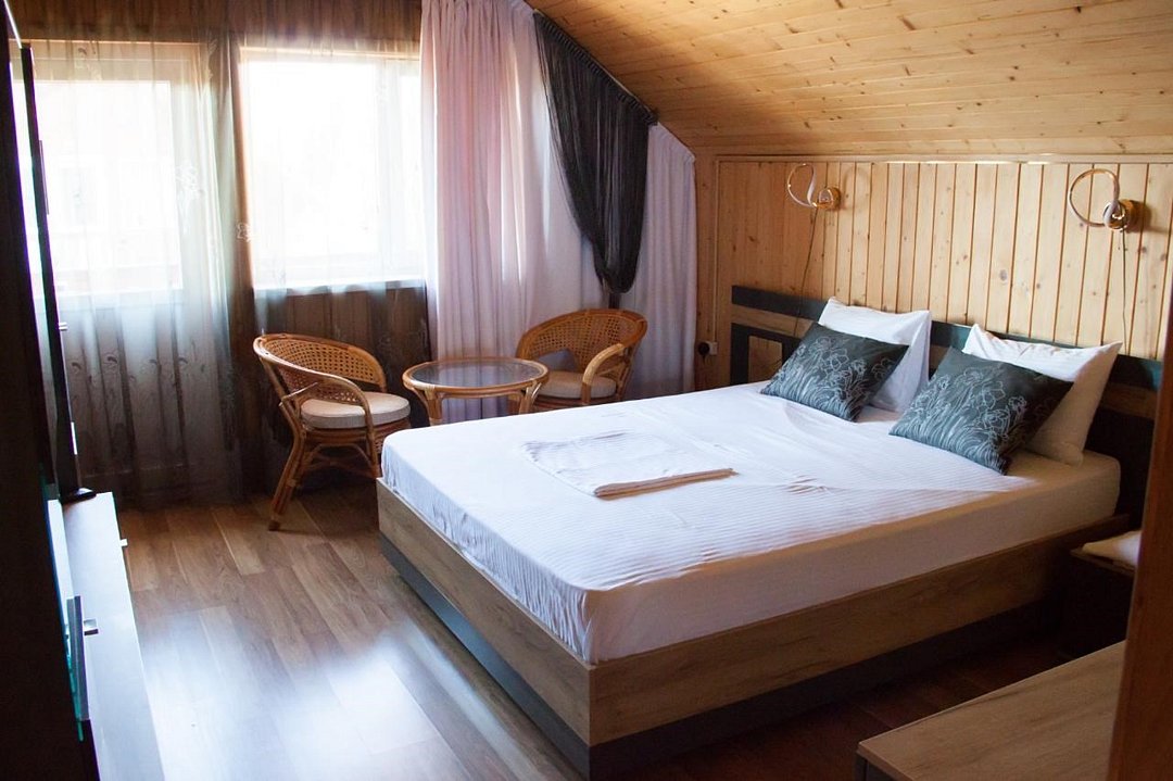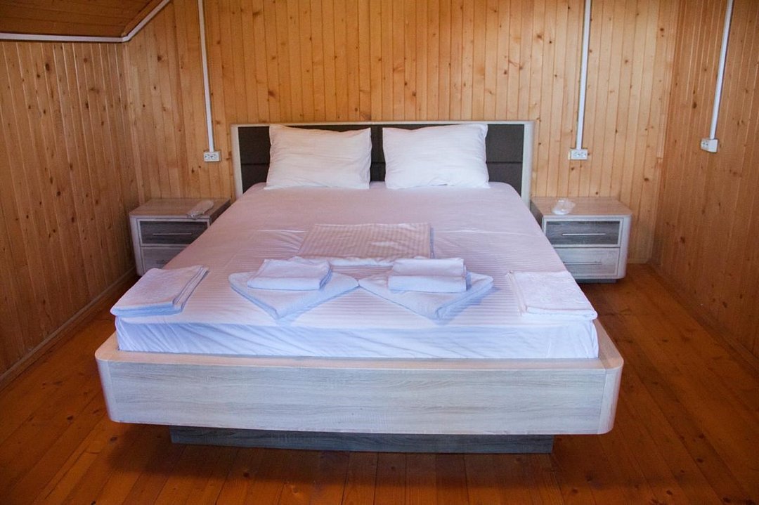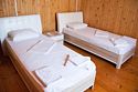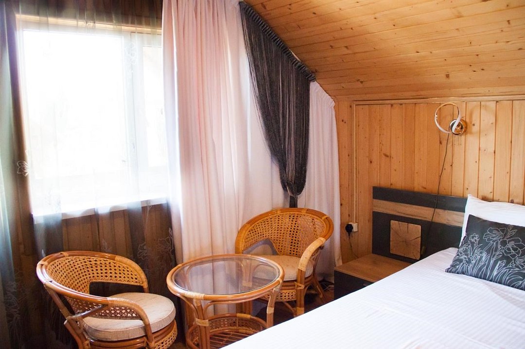 2-3-4-местные номера блочного типа с частичными удобствами. В номерах раздельные кровати, прикроватные тумбочки, шкафы, кондиционеры. Телевизор, холодильник, санузел (туалет, умывальник, душ, бойлер) – общий на 5 номеров. Номера расположены в каменном коттедже на 2 этаже. Общая площадь номера 11-14 кв.м.Деревянный домик с удобствами блочного типа 1 этаж