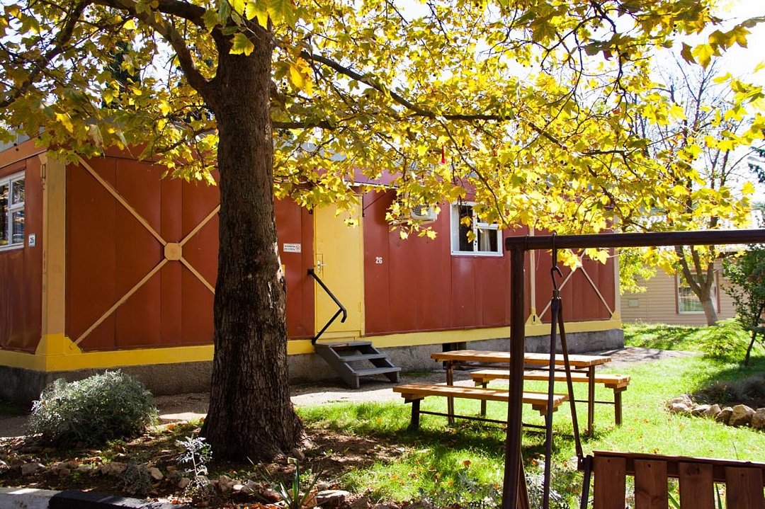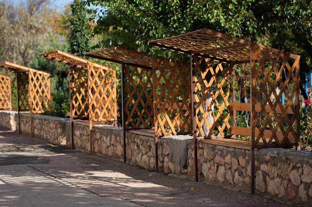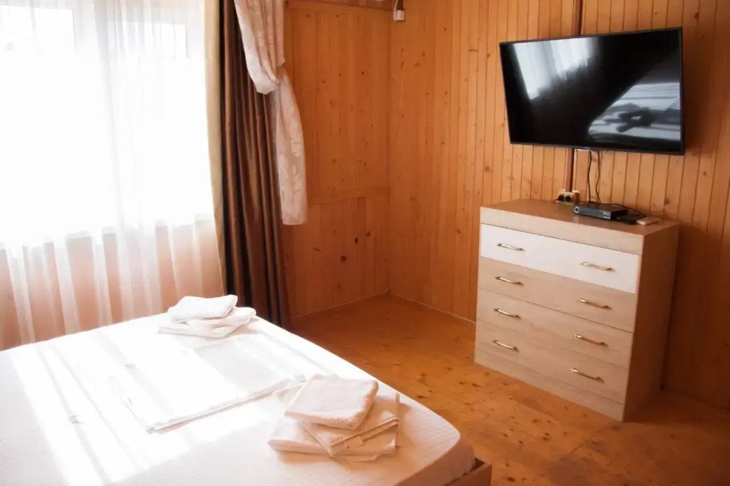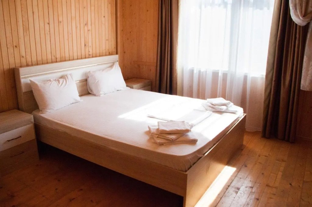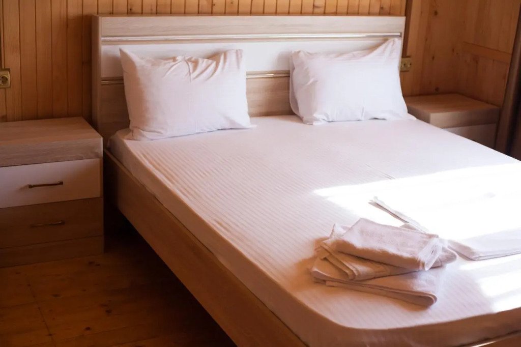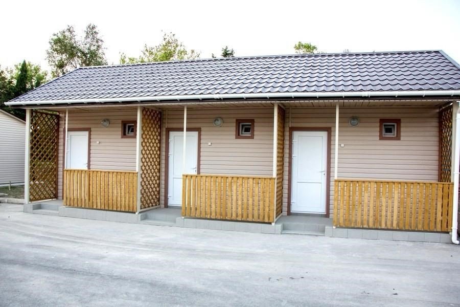 2-3-4-местные номера блочного типа с частичными удобствами. В номерах раздельные кровати, прикроватные тумбочки, шкафы, кондиционеры. Телевизор, холодильник, санузел (туалет, умывальник, душ, бойлер) – общий на 5 номеров. Номера расположены в каменном коттедже на 2 этаже. Общая площадь номера 11-14 кв.м.Деревянный домик с удобствами блочного типа 1 этаж