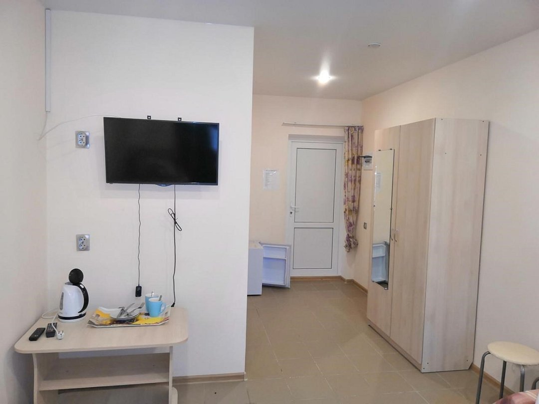 Добро пожаловать в уютную студию «КОМФОРТ+» — идеальное место для романтического уикенда или спокойного отдыха на двоих. Номер площадью 29 кв.м. расположен на первом этаже двухэтажного коттеджа и предлагает все удобства для приятного проживания. Войдя в номер, вы окажетесь в светлой прихожей, которая плавно переходит в функциональную кухонную зону. Здесь вас ждёт встроенная кухня с необходимой посудой, холодильник, микроволновая печь и электрочайник — всё для вашего комфорта. Уютно расположенные стол и стулья создают приятную атмосферу для завтраков или романтических ужинов. Спальня оформлена в тёплых тонах, где главной деталью служит просторная двуспальная кровать, окруженная прикроватными тумбочками. Шкаф и тумба под телевизор предоставят вам достаточно места для хранения ваших вещей и помогут создать домашнюю атмосферу. Для вашего удобства в номере также установлен телевизор и кондиционер, обеспечивающий приятный климат в любое время года. Совмещенный санузел с душем, умывальником и туалетом оснащён бойлером, что гарантирует вам горячую воду в любое время. Частный вход в номер добавляет ощущение уединения. Вы сможете насладиться природой на придомовой территории коттеджа, где есть зона отдыха с мангалом и беседкой, идеально подходящей для барбекю или вечерних посиделок под звёздным небом. Бесплатный Wi-Fi позволит вам оставаться на связи, наслаждаясь отдыхом. Если вам нужно больше места, есть возможность установки одного дополнительного места за небольшую плату. Студия «КОМФОРТ+» — это не просто номер, это ваше личное пространство для отдыха, воспоминаний и хорошего настроения! Общая площадь номера 29 кв.м.Услуги и удобства
