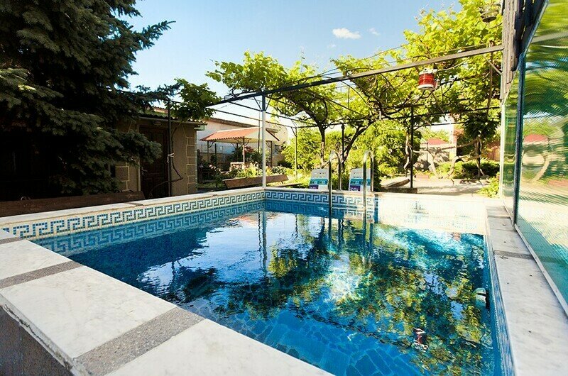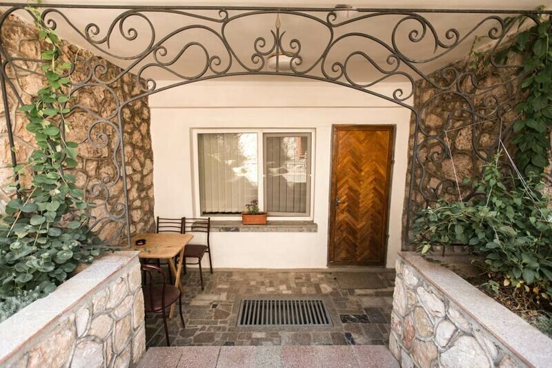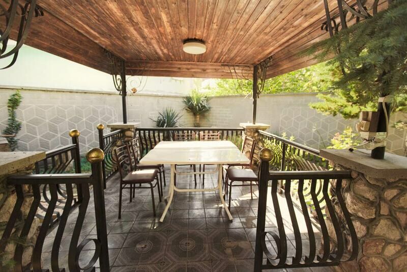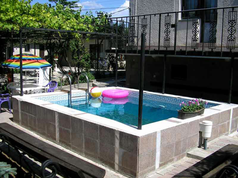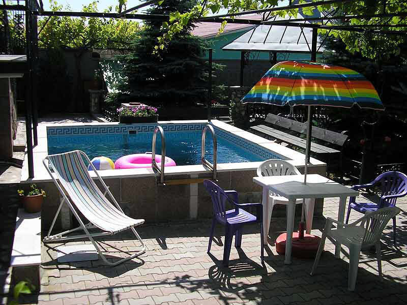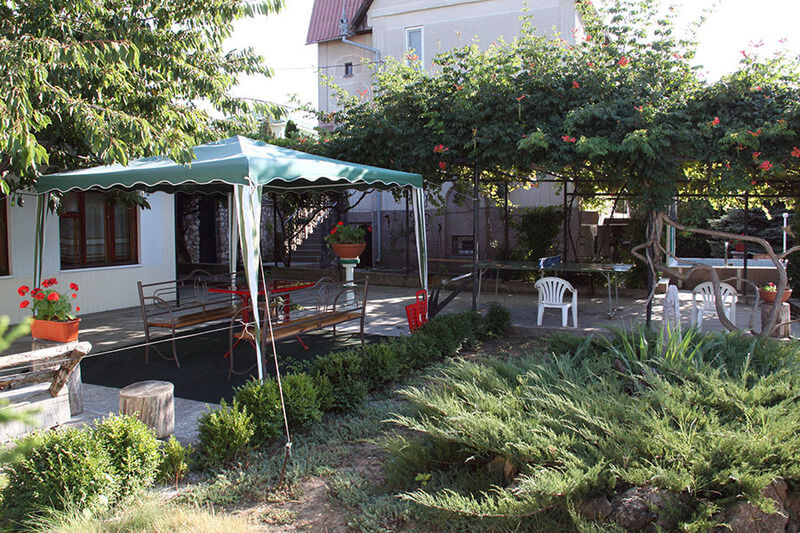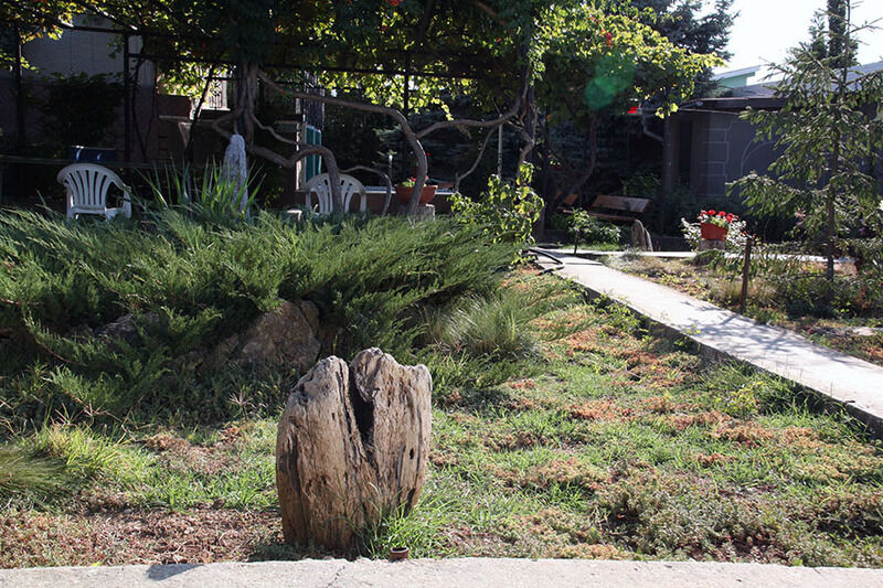 Территория гостиницы не большая, но очень уютная и благоустроенная. Она не просто утопает в зелени, ландшафтное оформление участка вызывает восторг и доставляет наслаждение. Небольшой водоем с фонтанчиком, вымощенные дорожки, клумбы и вазоны с цветами и, конечно же, растительность – северные растения прекрасно сочетаются с южными: ели с пальмами. Входы в номера утопают в зелени вьющегося хмеля. Имеются беседки для отдыха со столом и скамейками, где днем можно укрыться от жаркого солнца, а вечером - приятно посидеть с чашкой ароматного чая из крымских трав или бокалом крымского вина.
