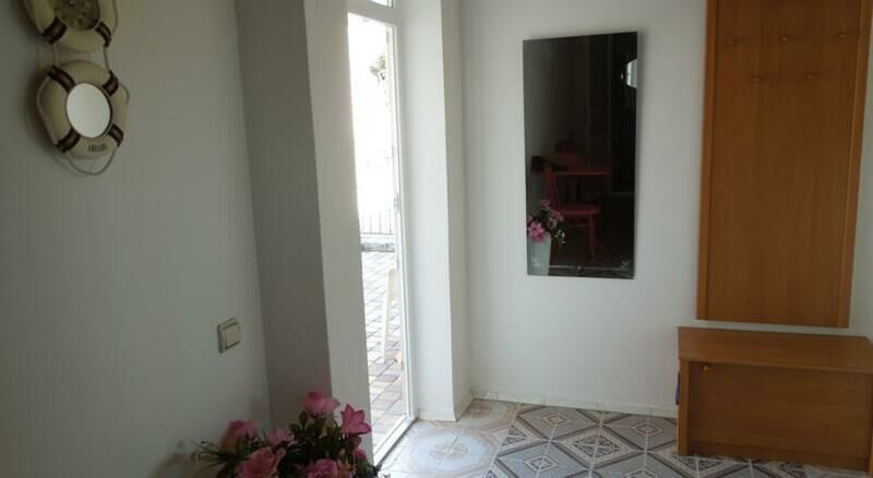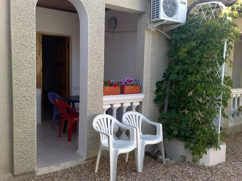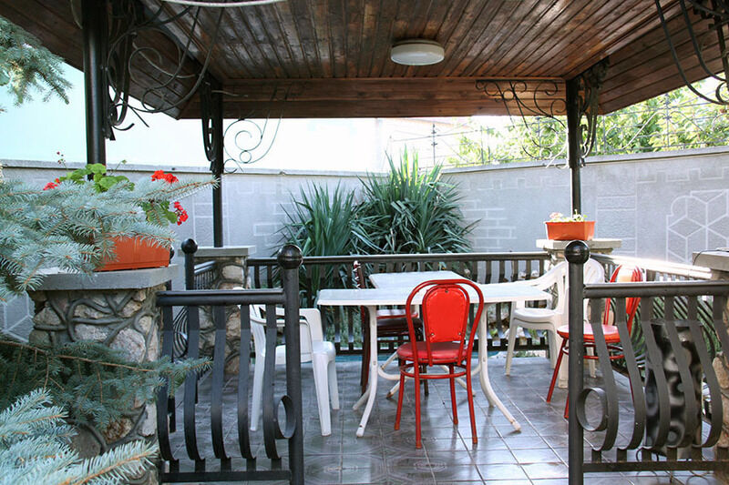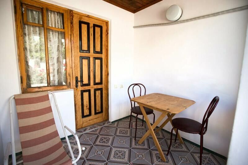 Отдельный вход с уютной террасой, украшенной живыми цветами в вазонах. На террасе – деревянная дачная мебель (стол и стулья), здесь вы можете отдыхать, спрятавшись от горячих солнечных лучей и уютно устроившись в кресле с прохладительным напитком. Перед входом – шезлонги для принятия солнечных ванн, сушилка для белья.